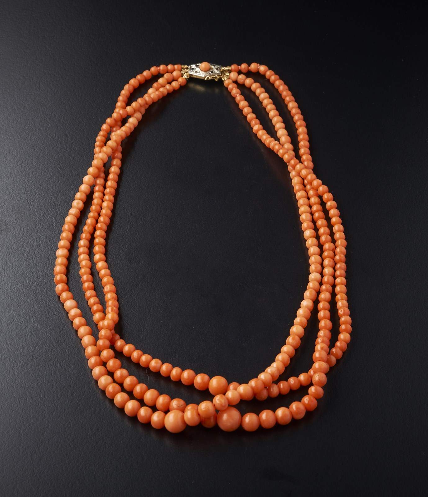 . Collana di corallo a tre fili leggermente degradè con chiusura in oro bianco e giallo . -. . Peso: 46 grammi