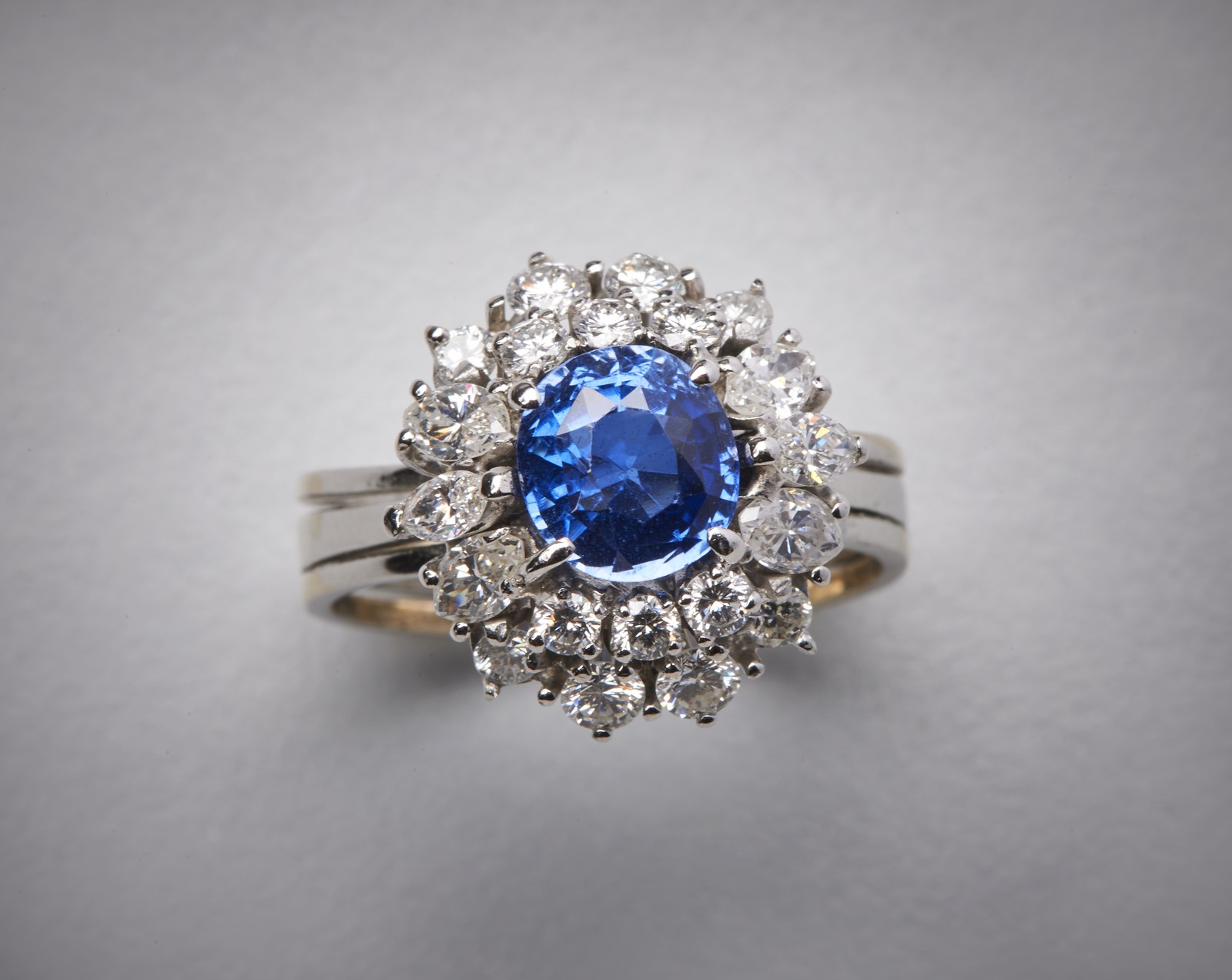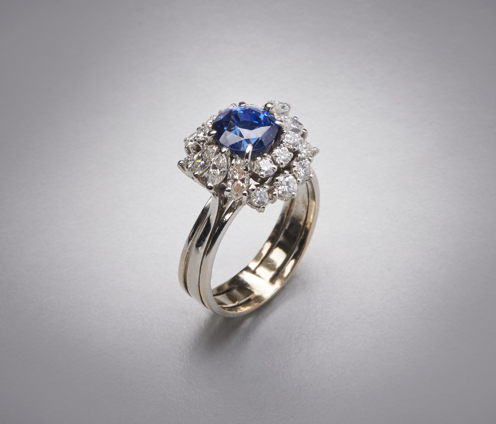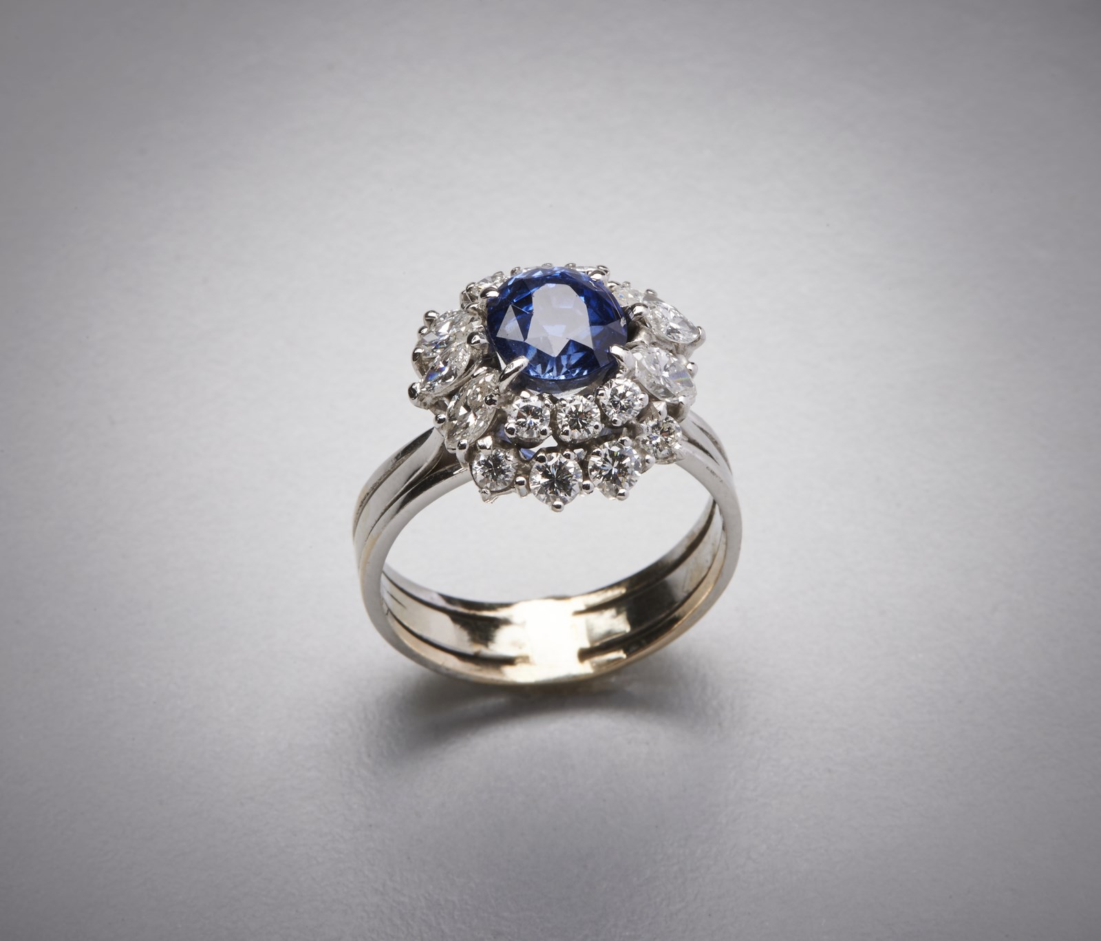 Anello in oro bianco 750/1000 con zaffiro ovale blu. . . di colore molto intenso probabilmente termodiffuso (certificazione gemmologica non presente) di circa 3,50 carati e 2,00 carati circa di diamanti bianchi taglio misto. Peso lordo gr 6,80.