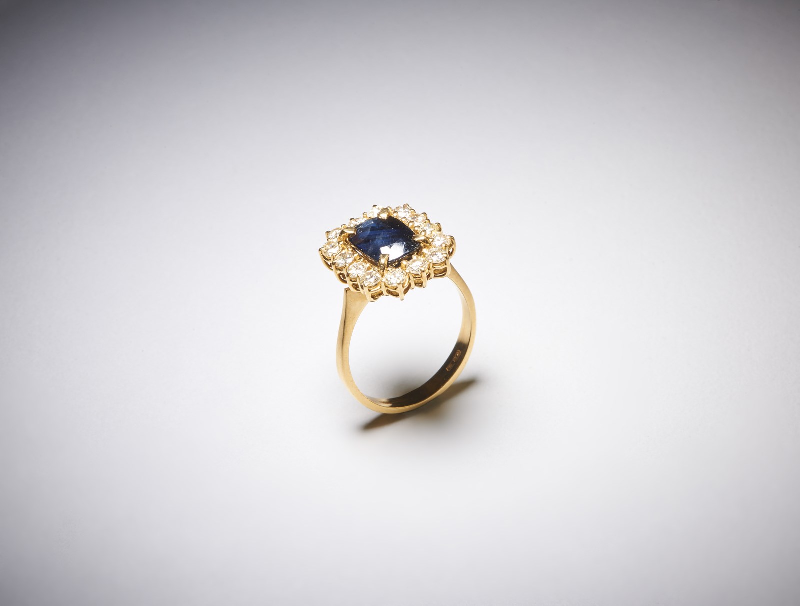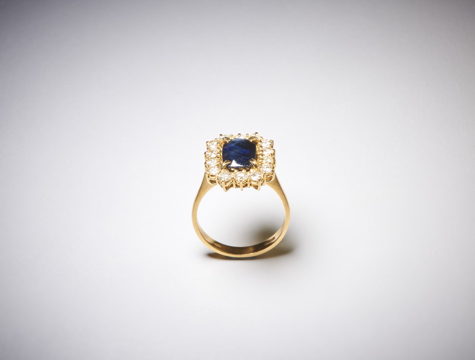 . Anello in oro giallo 750/1000 con contorno di diamanti tondi taglio a brillante di 1,00 ct circa H/I vs e zaffiro blu centrale taglio a cuscino di 3,00 ct circa. . -. . HI VS.