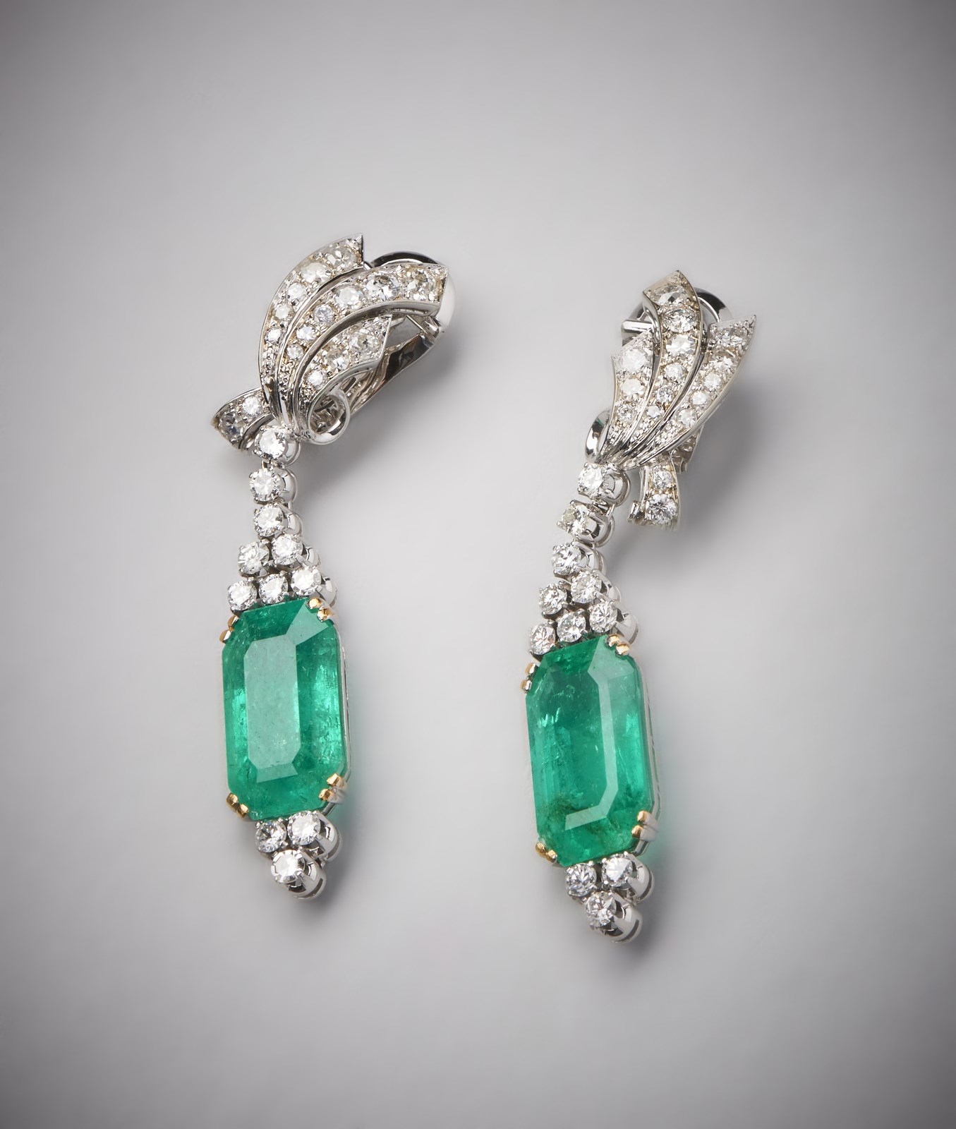 Un paio di orecchini pendenti in oro bianco 750/1000 con diamanti bianchi taglio misto per tot. 3,00 ct circa e coppia di smeraldi colombiani taglio ottagonale di totale carati 18,00