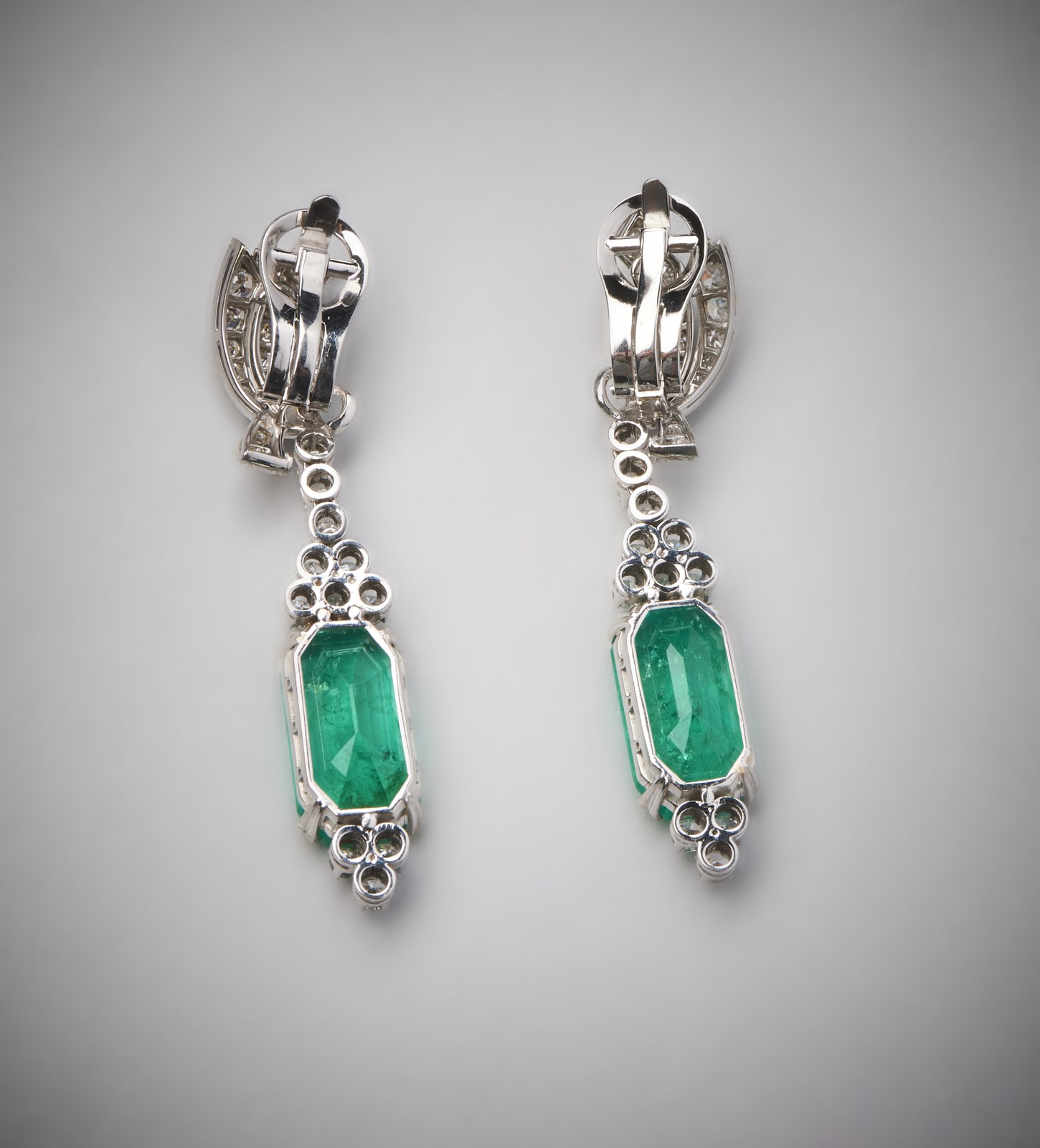 Un paio di orecchini pendenti in oro bianco 750/1000 con diamanti bianchi taglio misto per tot. 3,00 ct circa e coppia di smeraldi colombiani taglio ottagonale di totale carati 18,00. Eccezionale coppia di smeraldi colombiani di colore verde molto intenso taglio ottagonale appartenuti ad importante famiglia nobiliare napoletana, montata su orecchini pendenti in oro bianco 750/1000 e diamanti bianchi taglio misto ct. 3,00 e coppia di smeraldi colombiani taglio ottagonale di 18,00 carati circa. Peso lordo gr. 16,48