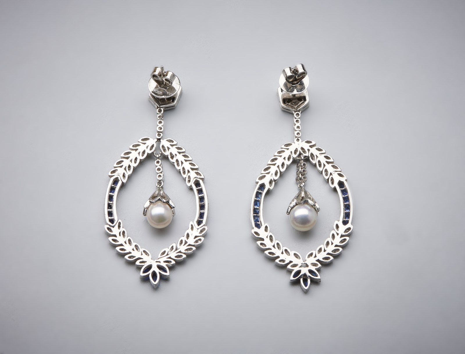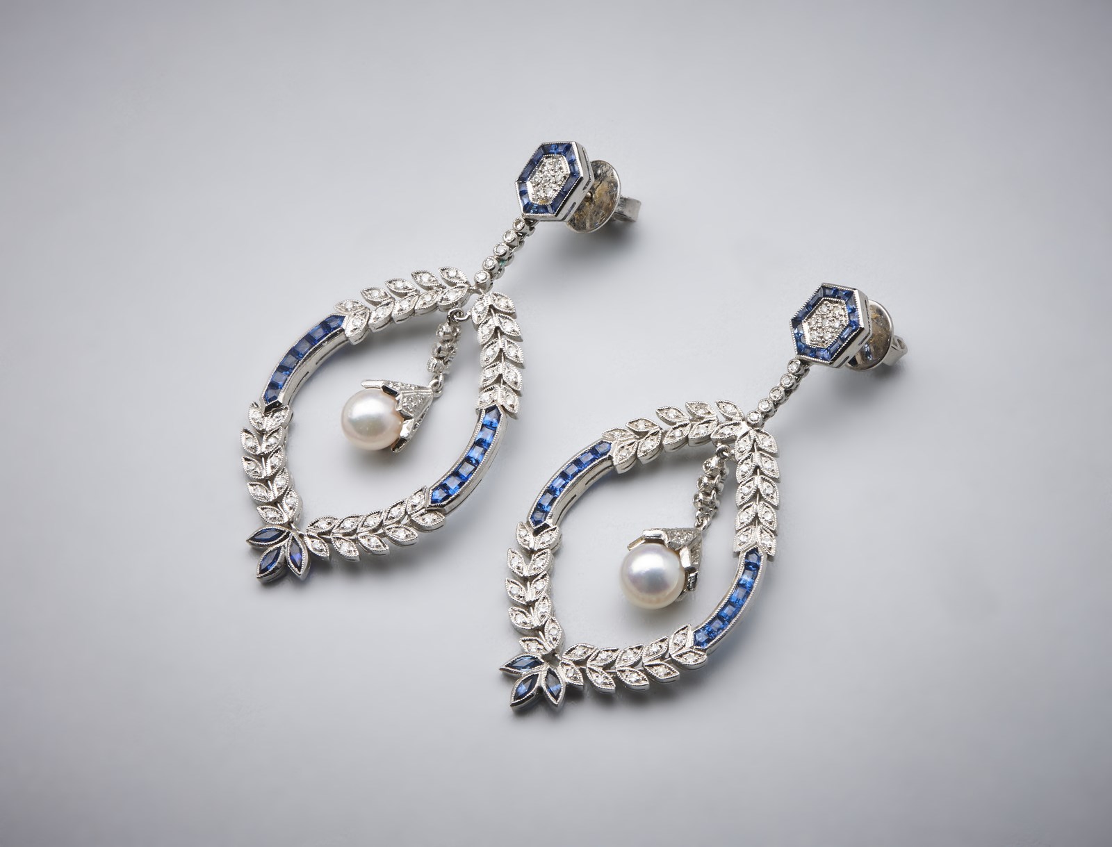 . Un paio di orecchini "Liberty" pendenti in oro bianco 750/1000 con zaffiri blu carrè, diamanti bianchi taglio huit huit e perle sferiche. . -. . Deliziosi orecchini stile "Liberty" raffiguranti corona triumphalis con perle pendenti all'interno contornate di piccoli diamanti e zaffiri blu.