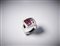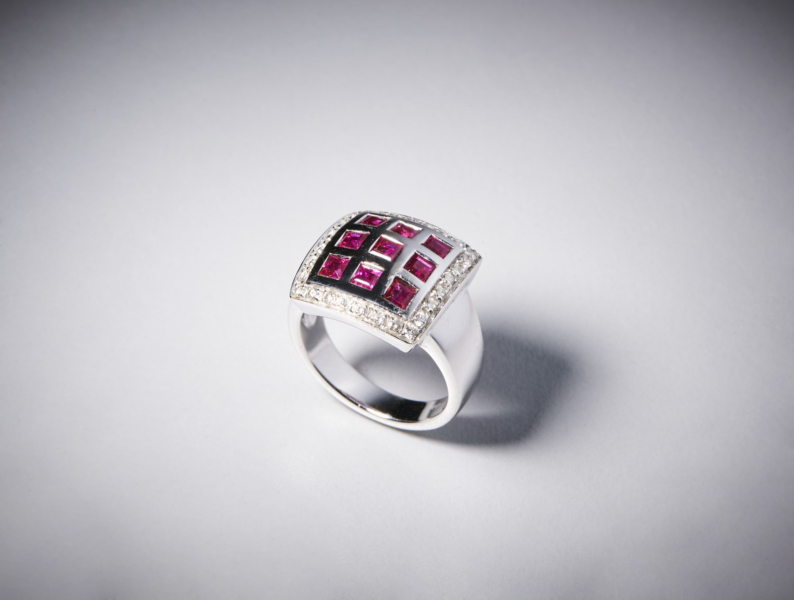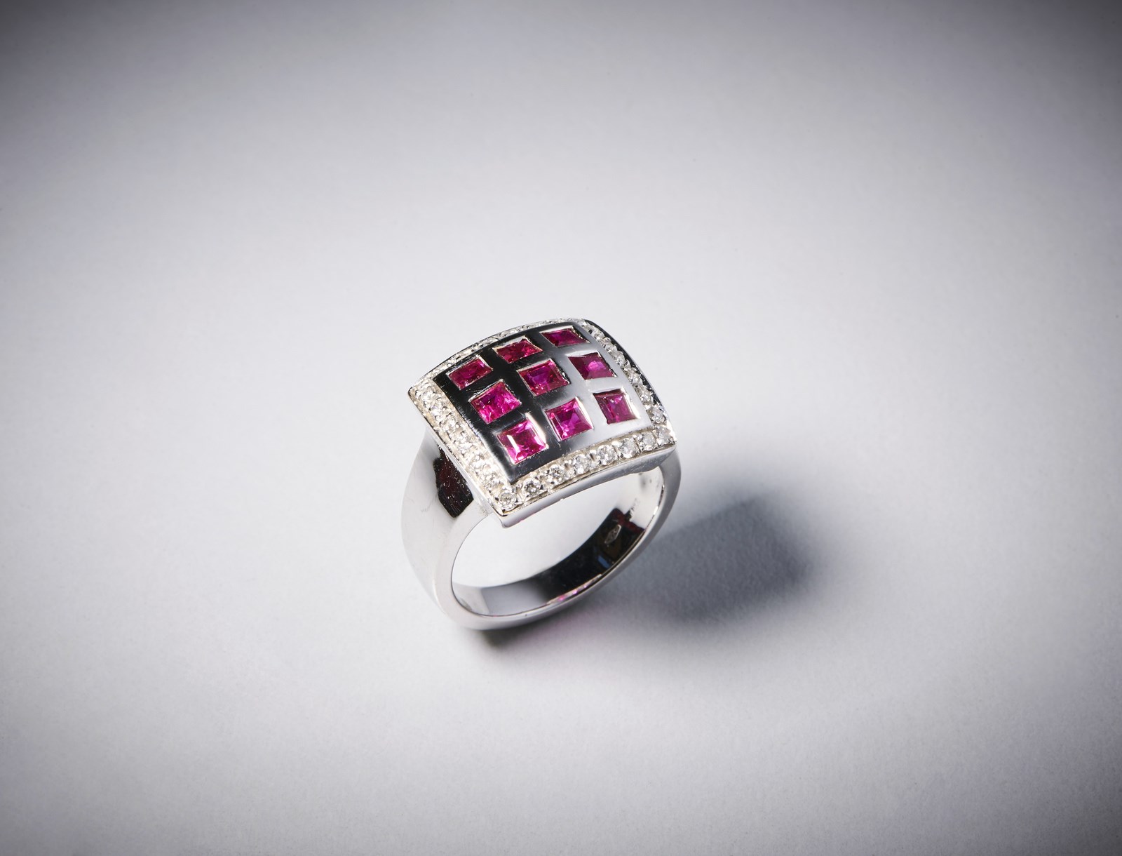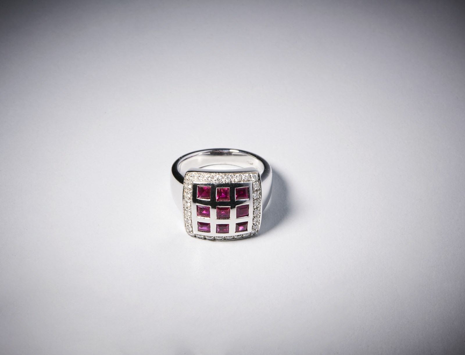 . Anello in oro bianco 750/1000 con carrè di rubini di circa 0,70 carati contornati da piccoli diamanti bianchi di circa 0,60 carati.