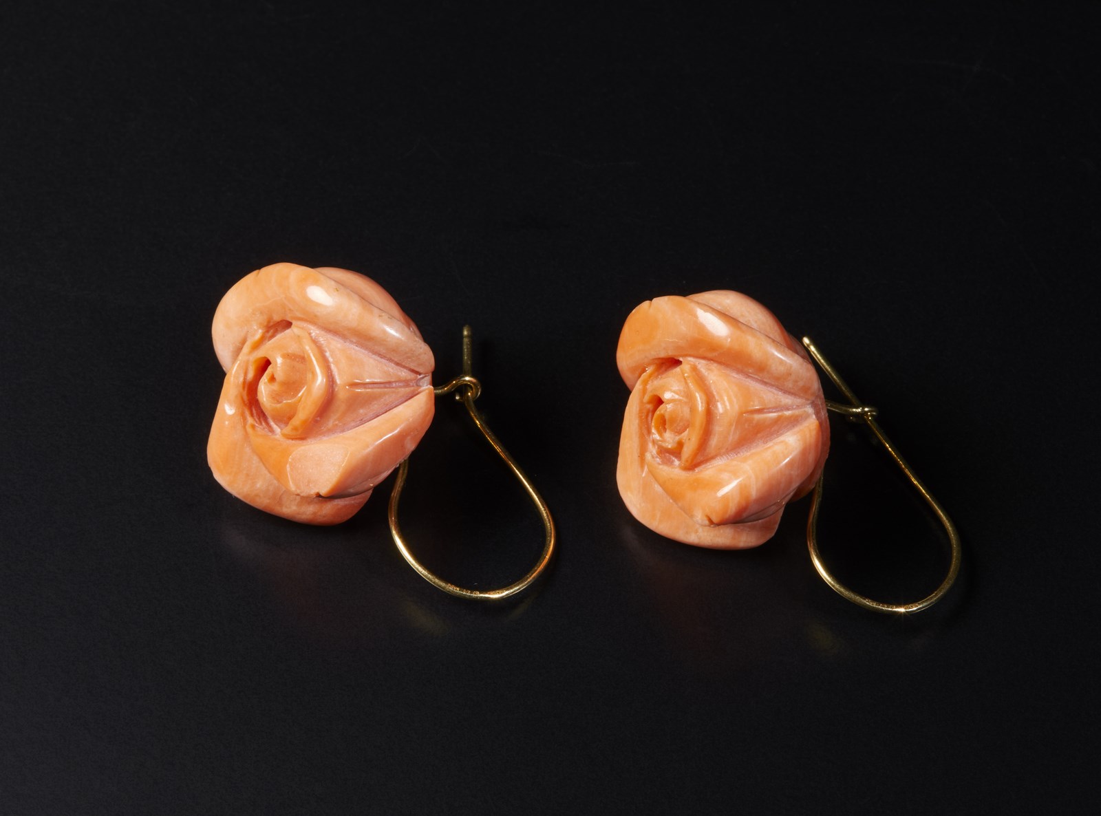 . Orecchini con rose di corallo. . . Un paio di orecchini in oro giallo 750/1000 con rose di corallo di color arancio.