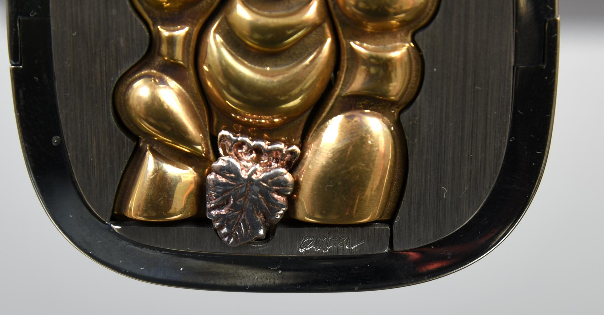gioiello-scultura in bronzo, acciaio, tre diamanti taglio brillante, in alto sul fronte, e collana in argento, cm 6x7x0,5; es. IX/C