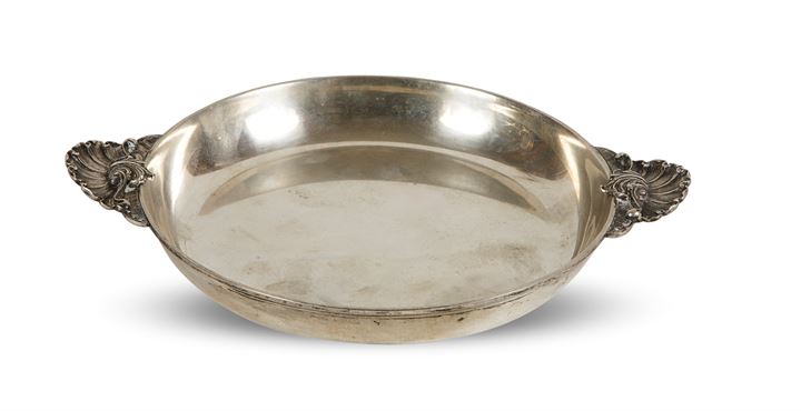 Ciotola di forma tonda in argento, marcata "Fasano". Manici lavorati a decoro di conchiglie