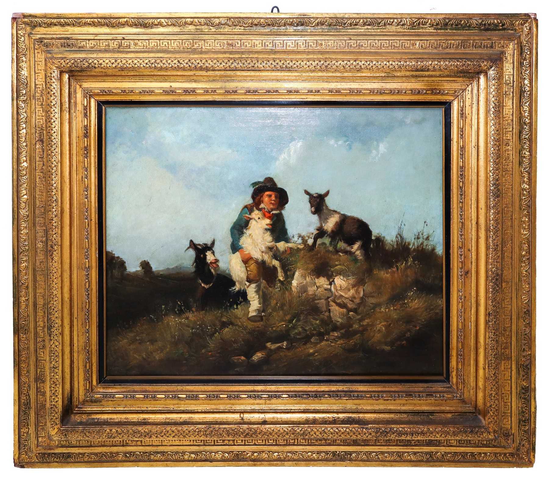 Filippo Palizzi (Italian 1818-1899) - Scena campestre con pastorello e caprette Cm 50x62, in cornice cm 82x93,5 Dipinto ad olio su tela Firmato in basso a destra. "Con Filippo Palizzi si ha il primo inizio del verismo pittorico. Dopo la scuola di Posillipo l’osservazione del vero diviene oggetto di speculazioni pittoriche. Fin dagli anni ‘50 si interessa alla fotografia che pratica con conoscenze tecniche approfondite. Usava le foto che lui stesso sviluppava, come osservazione e modelli per i suoi dipinti. In tal modo maturò un immediato e diretto naturalismo, riallacciandosi alla scuola animalista fiamminga del XVII secolo, ma cura molto di più i particolari, combinando la dignità neoclassica con la pittura di genere dei costumi popolari. La sua andata in Europa e a Parigi (1955) gli permette di perfezionare l’indagine luministica. Al suo ritorno soggiorna a Firenze. Qui vi conosce Giovanni Fattori e i macchiaioli. Afferma che quello che bisogna cercare nella pittura moderna sono le finezze e la totalità, con questi concetti Palizzi definisce la sua poetica che si basa su una sua personale concezione della “macchia” intendendo che la “totalità” doveva essere l’espressione del tutto, dell’insieme della macchia la quale doveva essere completata dalle finezze, ovvero dalla resa delle sottigliezze percettive. I paesaggi chiaroscurali dovevano sottoporsi a un'attenzione minuziosa, di carattere micrografico agli effetti di luce e dovevano essere realizzati in punta di pennello per esprimere infine la totalità dell’opera. Il dipinto in questione è un tipico esempio di tale concezione pittorica. Prodotto finale di quello che lui stesso definiva un naturalismo cosmico."STUDIO ASOR