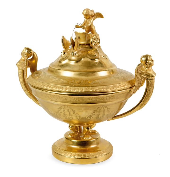 Zuppiera in porcellana, in stile neoclassico, dorata in oro zecchino; manici antropomorfi; presa a forma di amorino su carrozza trainata da farfalle
