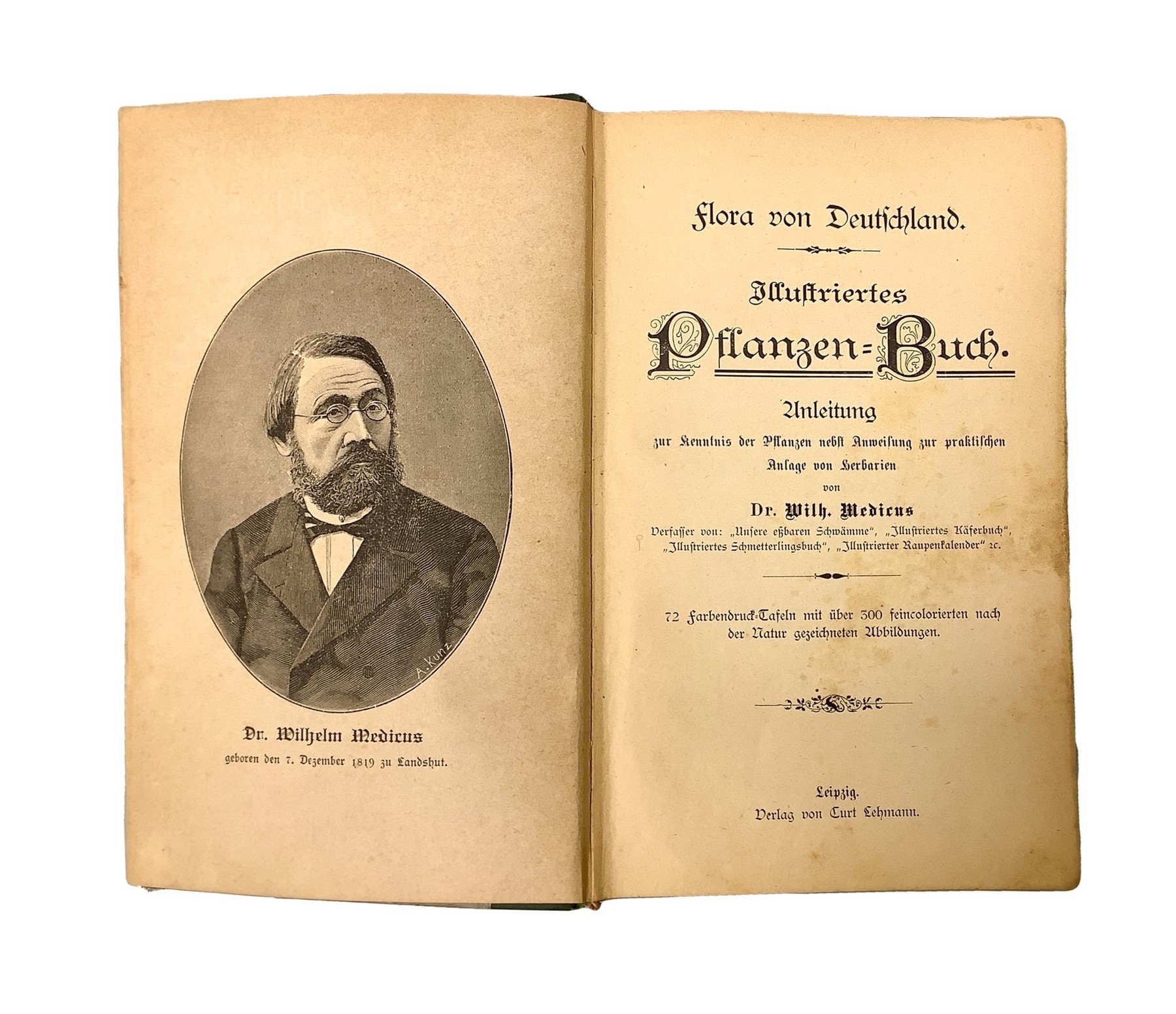 Libro illustrato delle piante. Istruzioni per la conoscenza delle piante insieme alle istruzioni per la realizzazione pratica degli erbari. Lipsia, pubblicato da Curt Lehmann, (1893). * Con frontespizio (ritratto) e 72 tavole cromolitografiche. * XXXIX, 229 p.. Legatura originale in mezza tela con taglio marmorizzato.