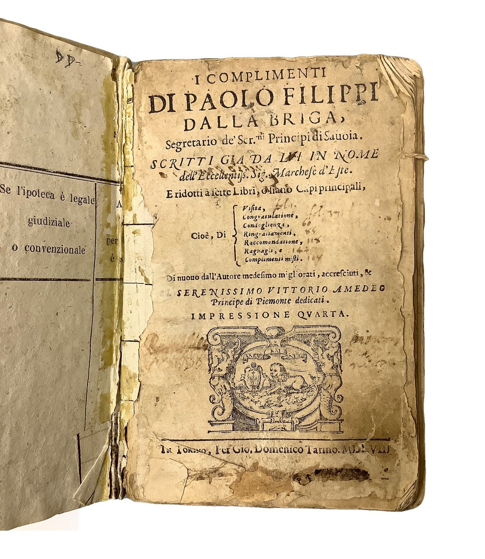 Opera del segretario dei Principi di Savoia, realizzata in nome del Marchese d'Este. Torino, Per Gio. Domenico Tarino. Coeva pergamena morbida, titolo cesellato sul lembo di coda, Epistola dedicatoria generale dell'autore a Vittorio Amedeo, principe di Piemonte datato da Briga [Alta], 15 dicembre 1607. Paolo Filippi dalla Briga, poeta e segretario alla corte dei Duchi di Savoia a Torino, si occupa dell'arte di scrivere lettere e di scegliere i "complimenti". Insiste sul fatto che le formule usate nelle lettere devono adattarsi alle circostanze. Questo repertorio ebbe un grande successo; l'opera, pubblicata per la prima volta nel 1601, conobbe diverse edizioni, di cui una postuma (1619).
