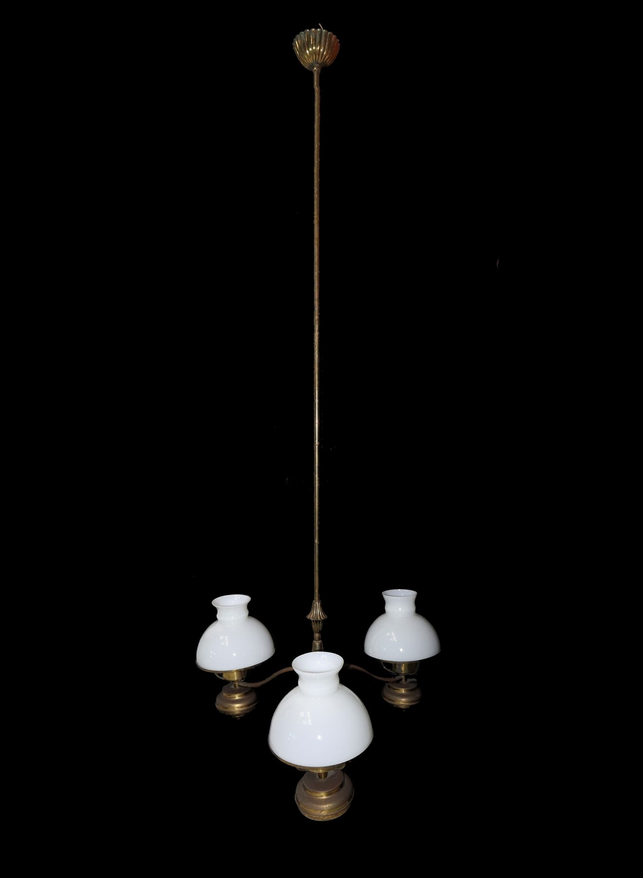 Lampadario con struttura in metallo a tre luci e lumi in opaline