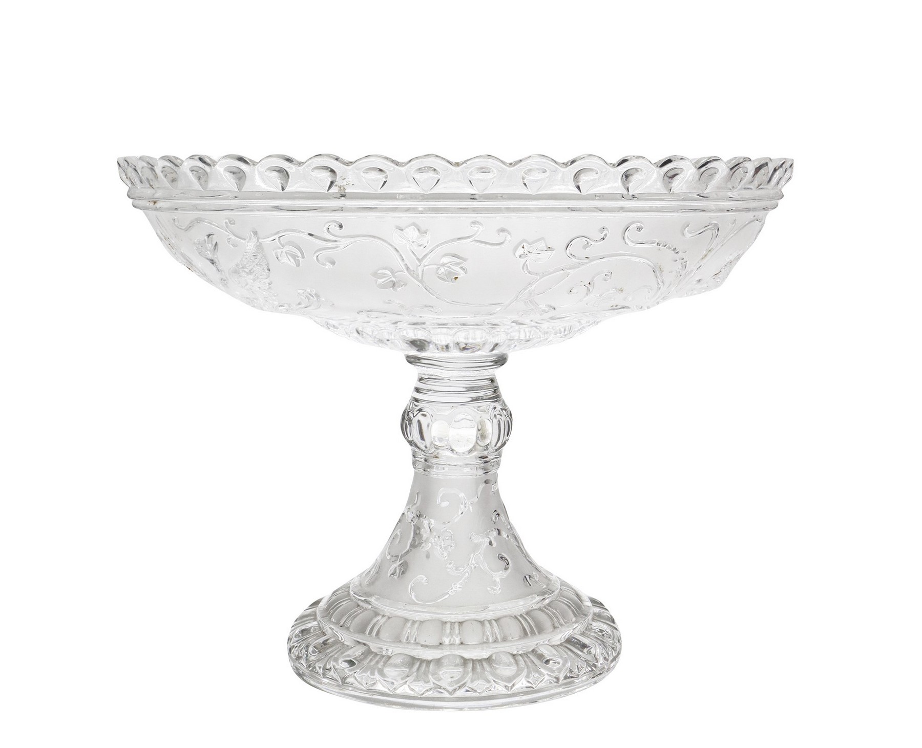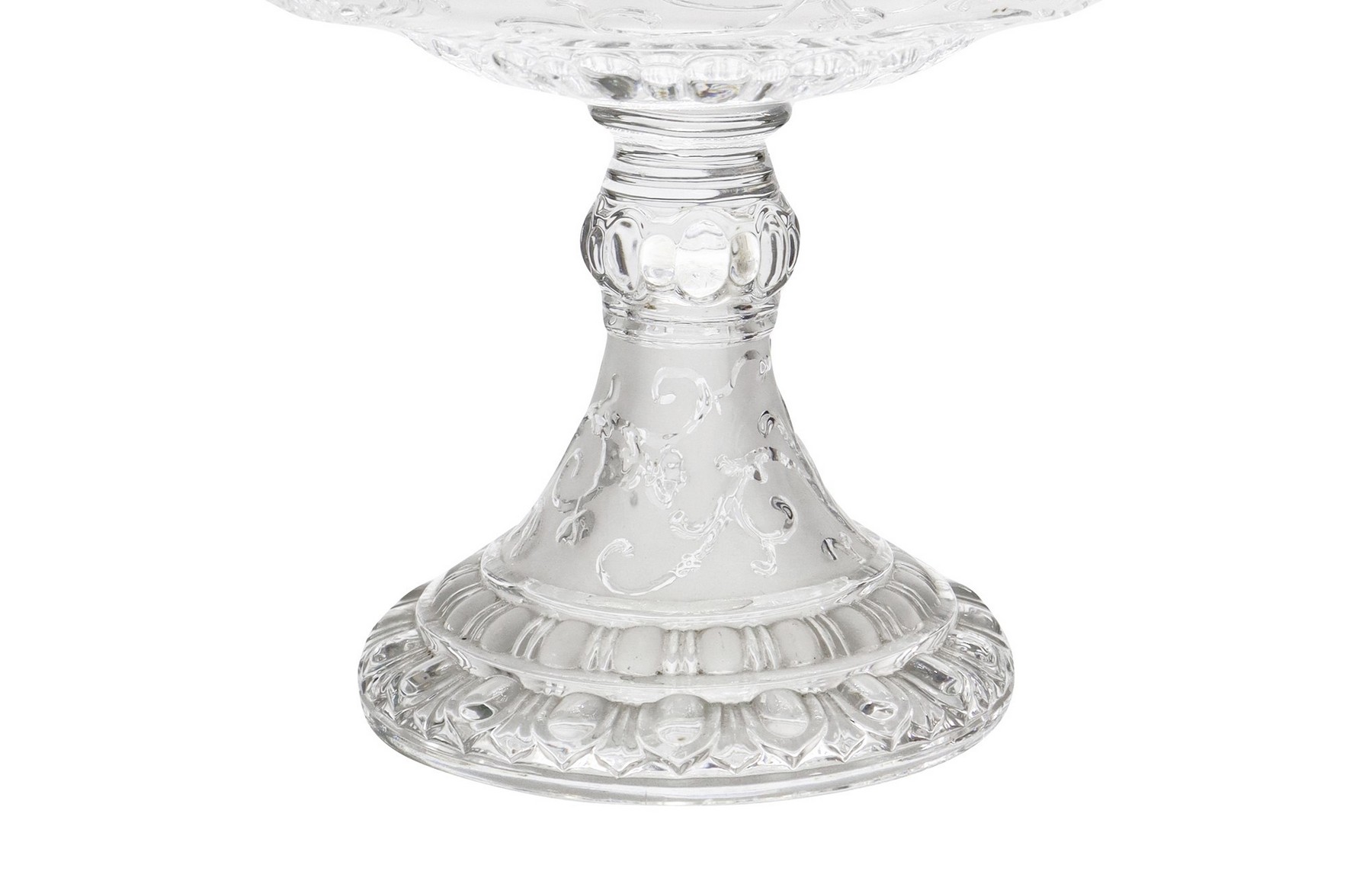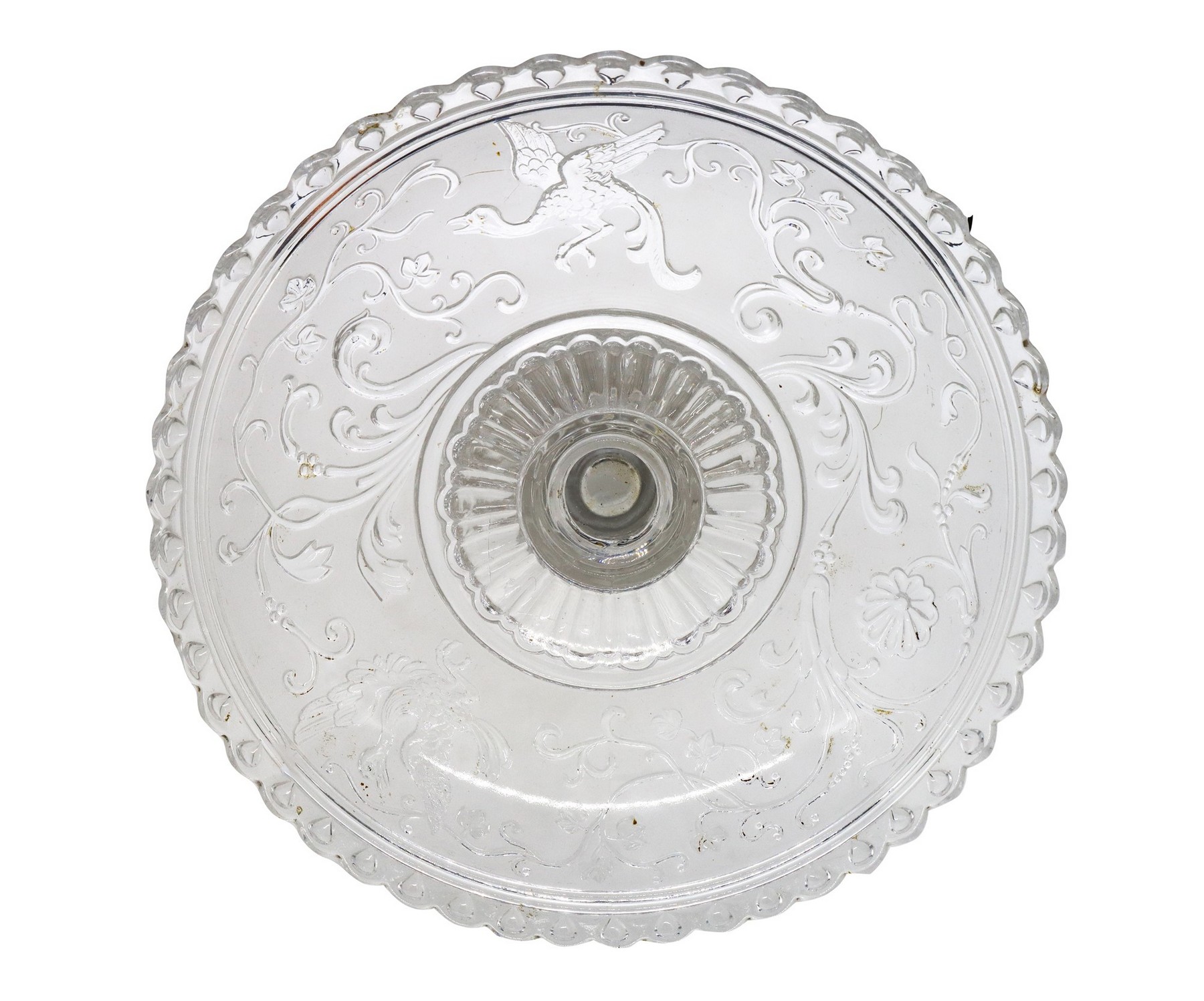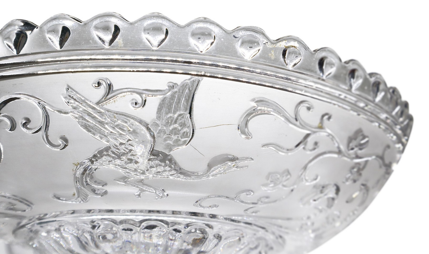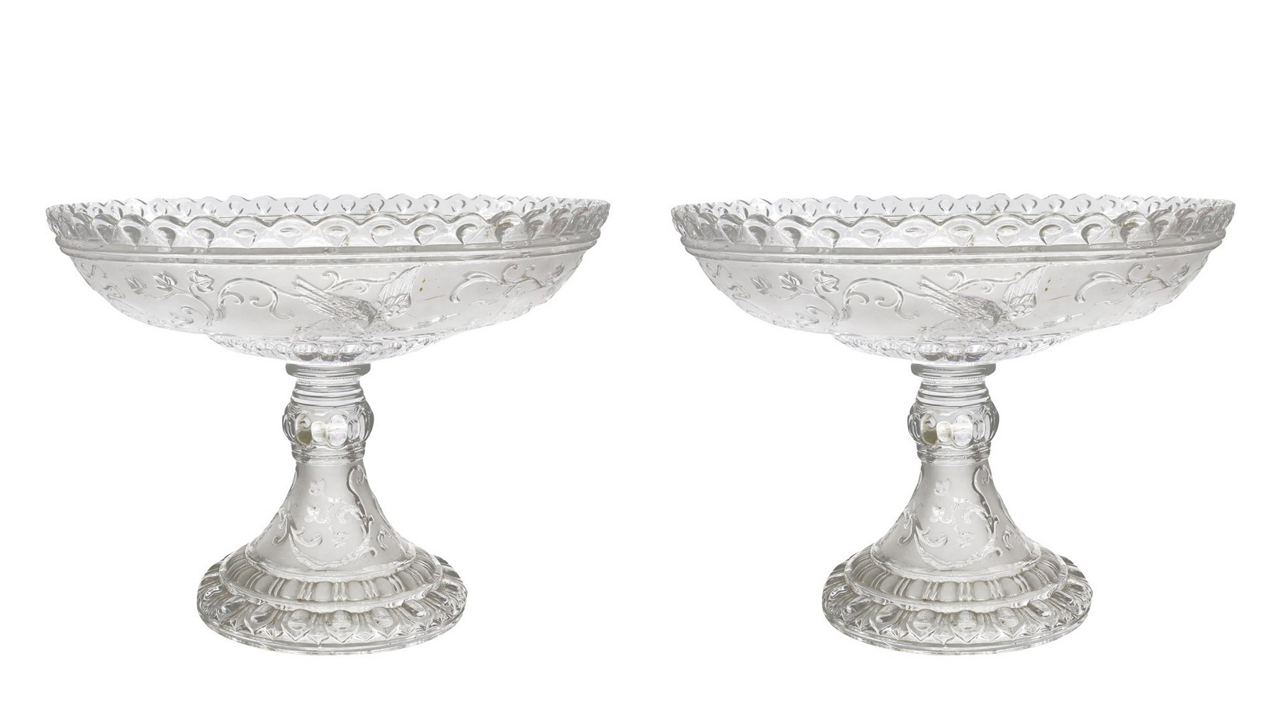 Coppia di alzate in cristallo bulinato e decorato con ramage fiori e uccelli smerlato alla bocca