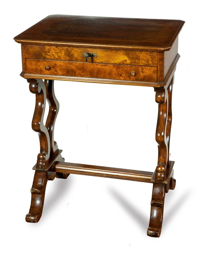 Tavolino da lavoro XX sec., in mogano, parti in noce e radica. Il piano sollevabile cela vari scomparti. Un