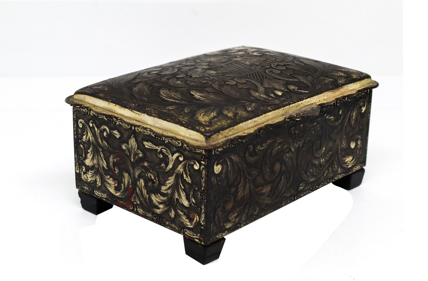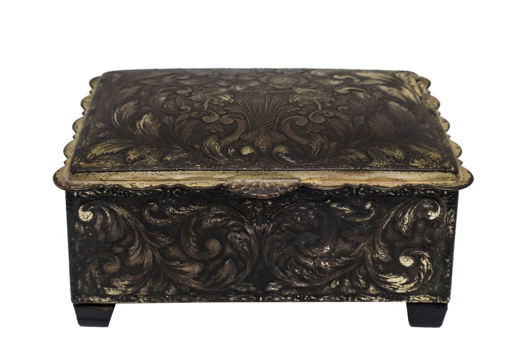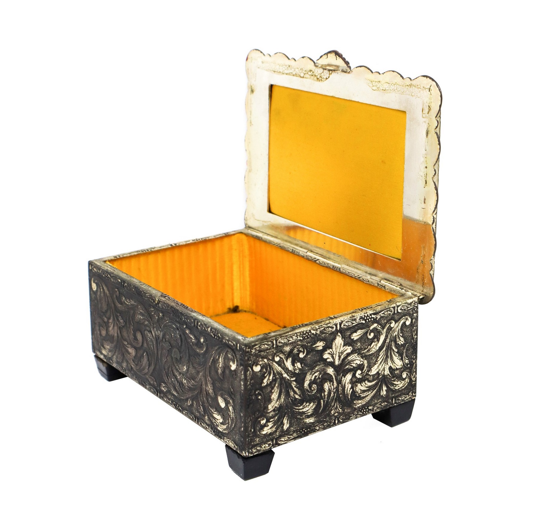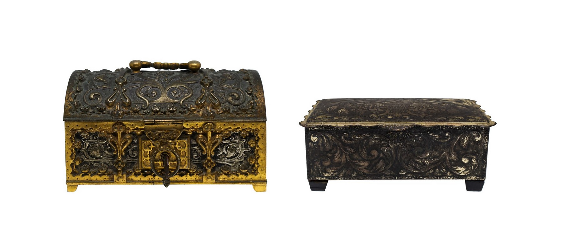 2 scatole in metallo patinato argento e oro h.6; 12x8 h.10; 16x9