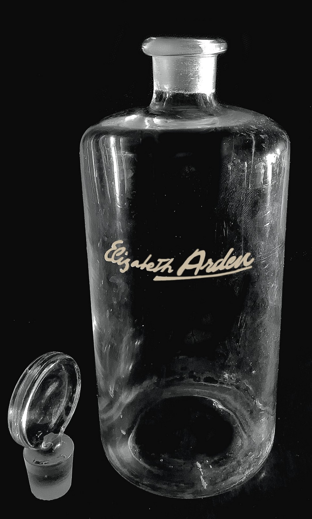 Coppia bottiglie Elisabe° Arden, tonico Rosa., 20° secolo H cm 28. Marchio dell'azienda di cosmesi dalla Red Door, il cui primo salone di bellezza è stato inaugurato nel 1910 sulla mitica Fif° Avenue di New York, diventato oggi iconico Brend. Piccola sbeccatura sul collo di una.
