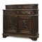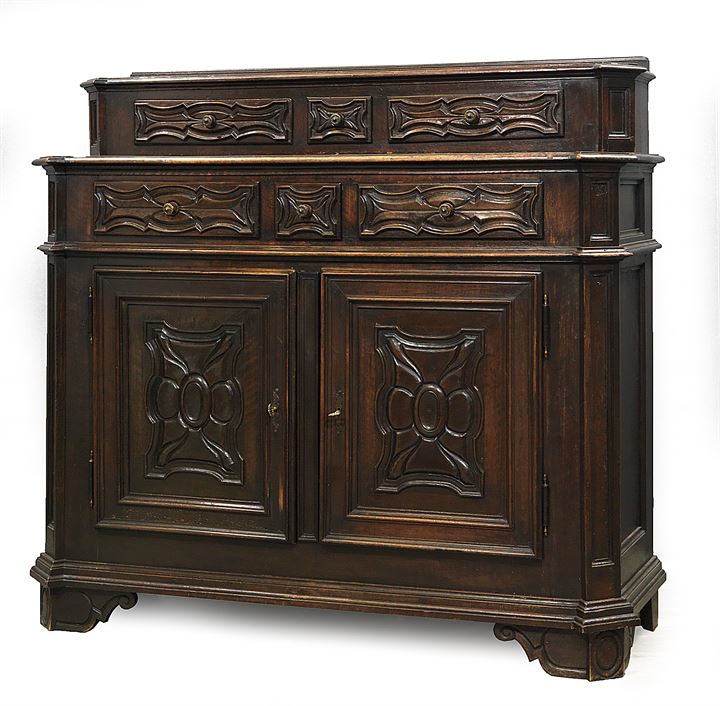 Credenza in legno scolpito, Piemonte, seconda metà XVIII secolo, in noce a formelle scolpite. Parte superiore a tre tiretti; parte inferiore a due ante e tre tiretti; fianchi a formelle. Piedi a mensola. Ricostruita con legni antichi