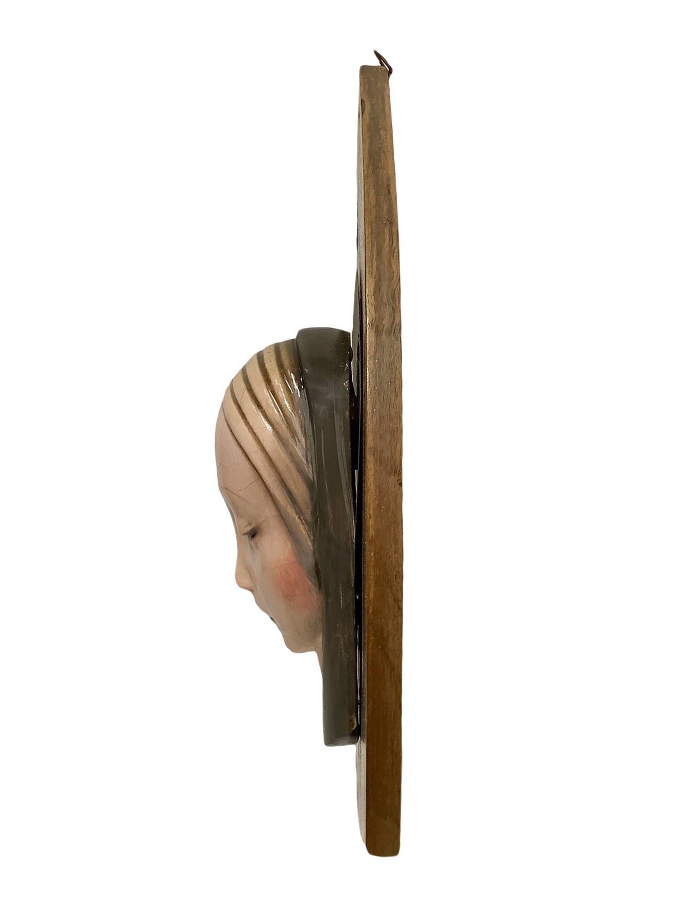 G. Launeck (XX secolo) - Capezzale con volto di Madonna in gesso policromo, Cm 41x36 Anni '50 Base in legno cuspidata