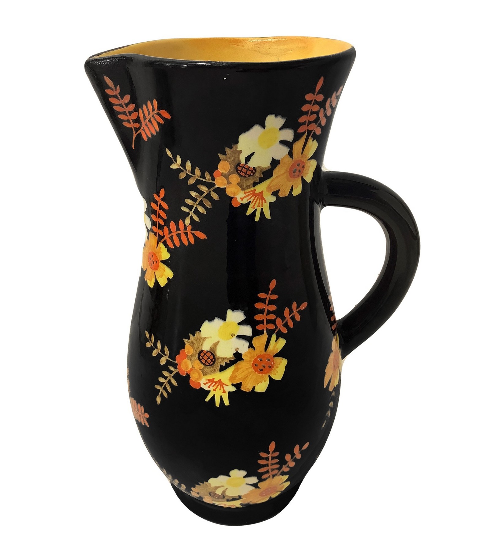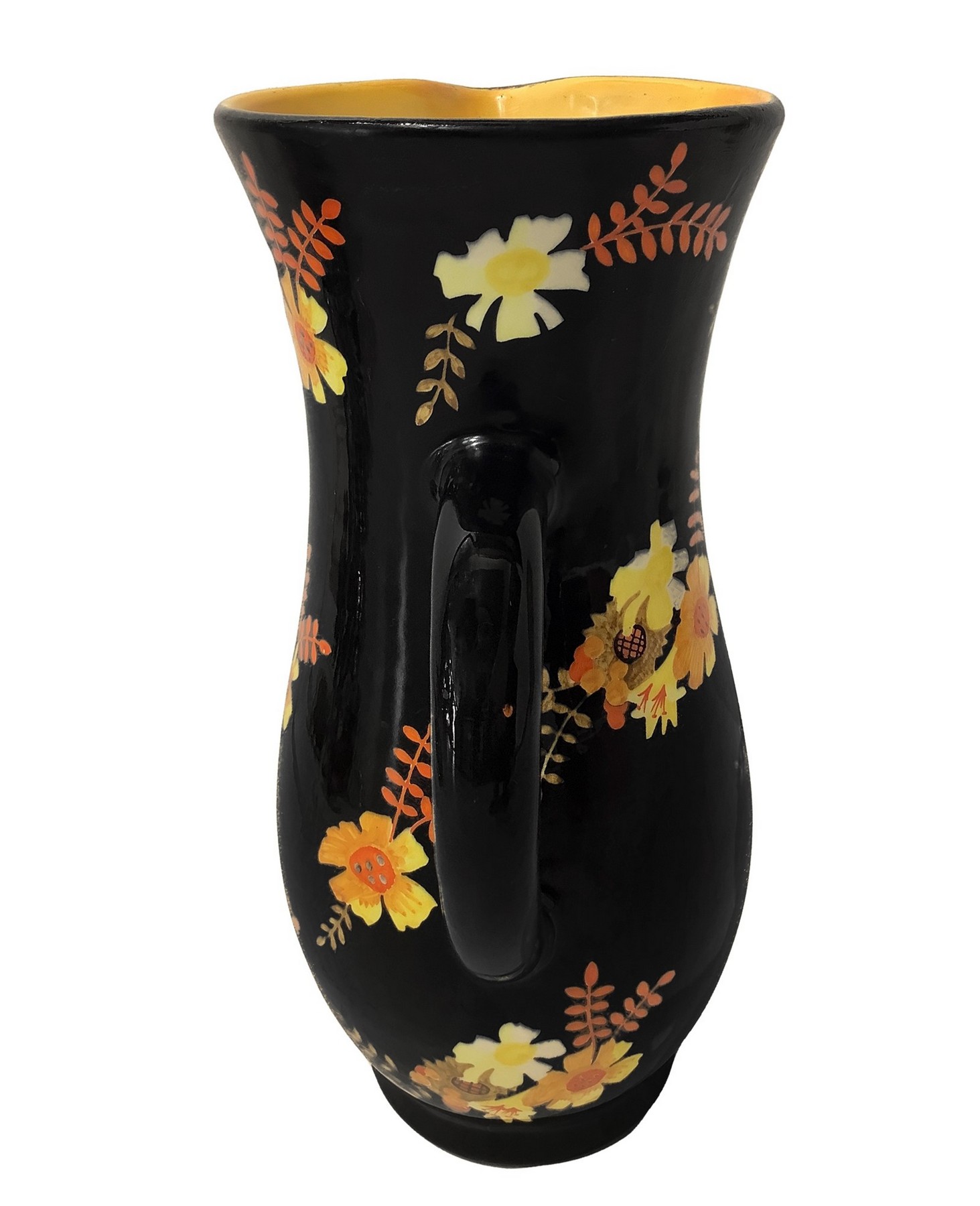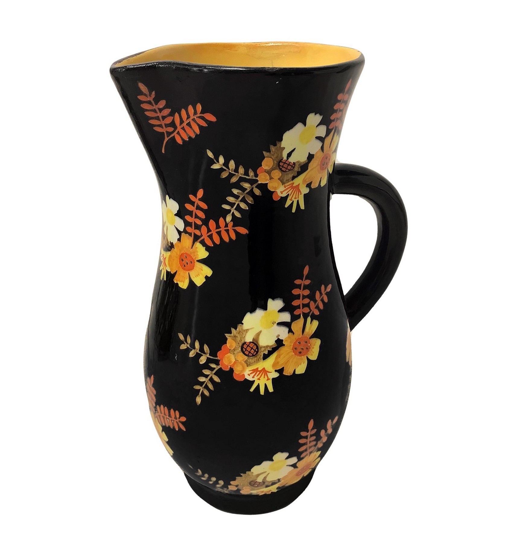 Lenci - Brocca con manico in terraglia a colaggio con decori floreali in policromia., 20° secolo H 36, dm 16 Ceramica Marchio sulla base. Presente filatura, effettuato restauro