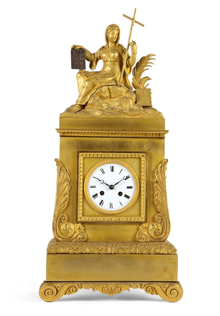 Pendola da tavolo, prima metà XIX secolo, in bronzo cesellato e dorato in oro zecchino; reca nella parte superiore con una figura femminile allegorica; quadrante in porcellana a numeri romani.