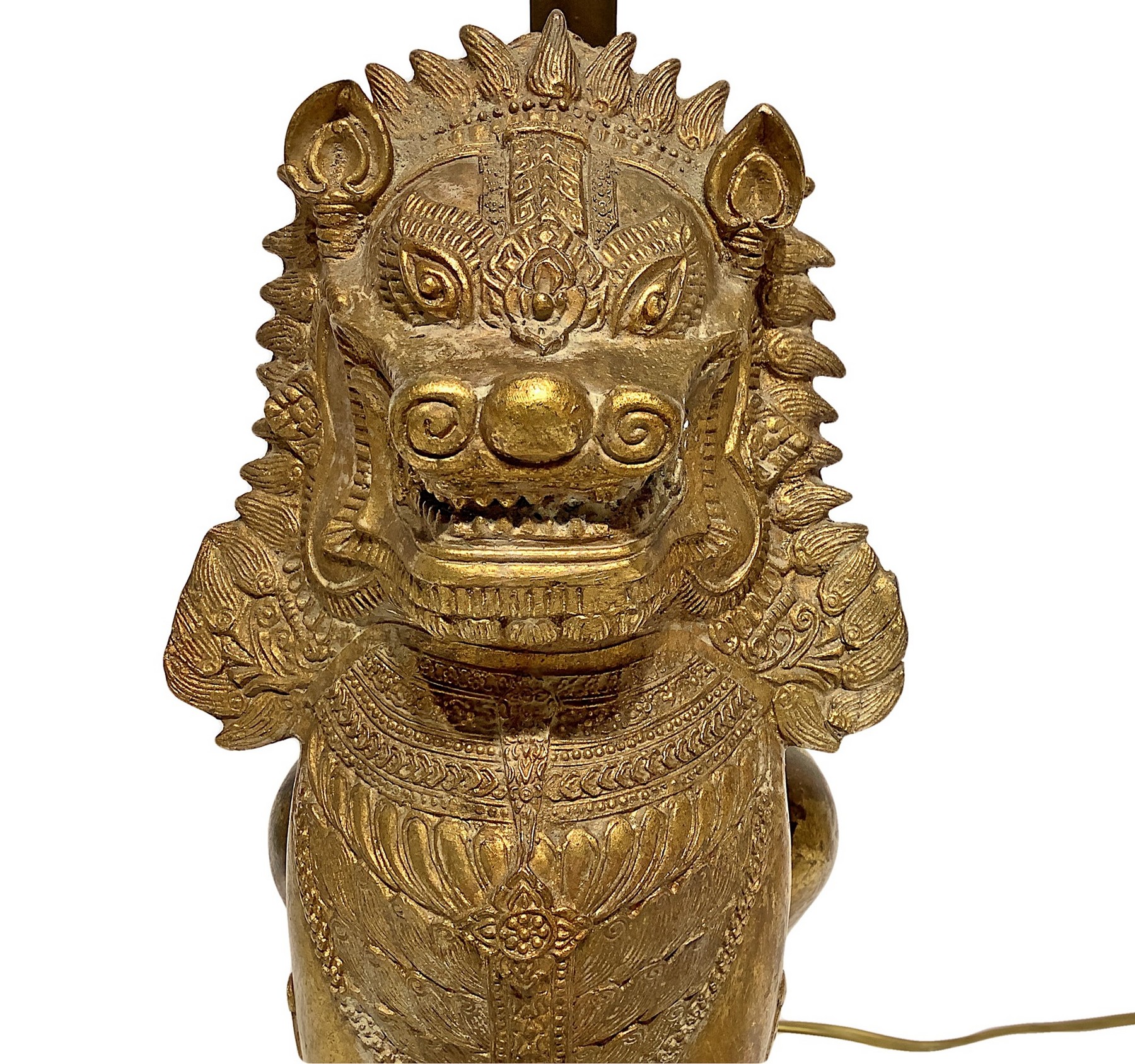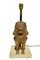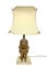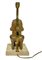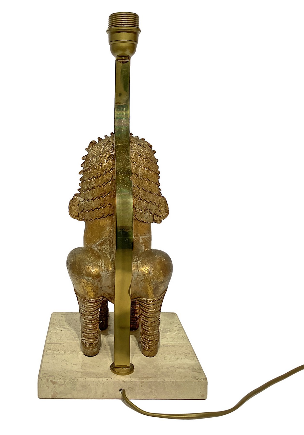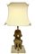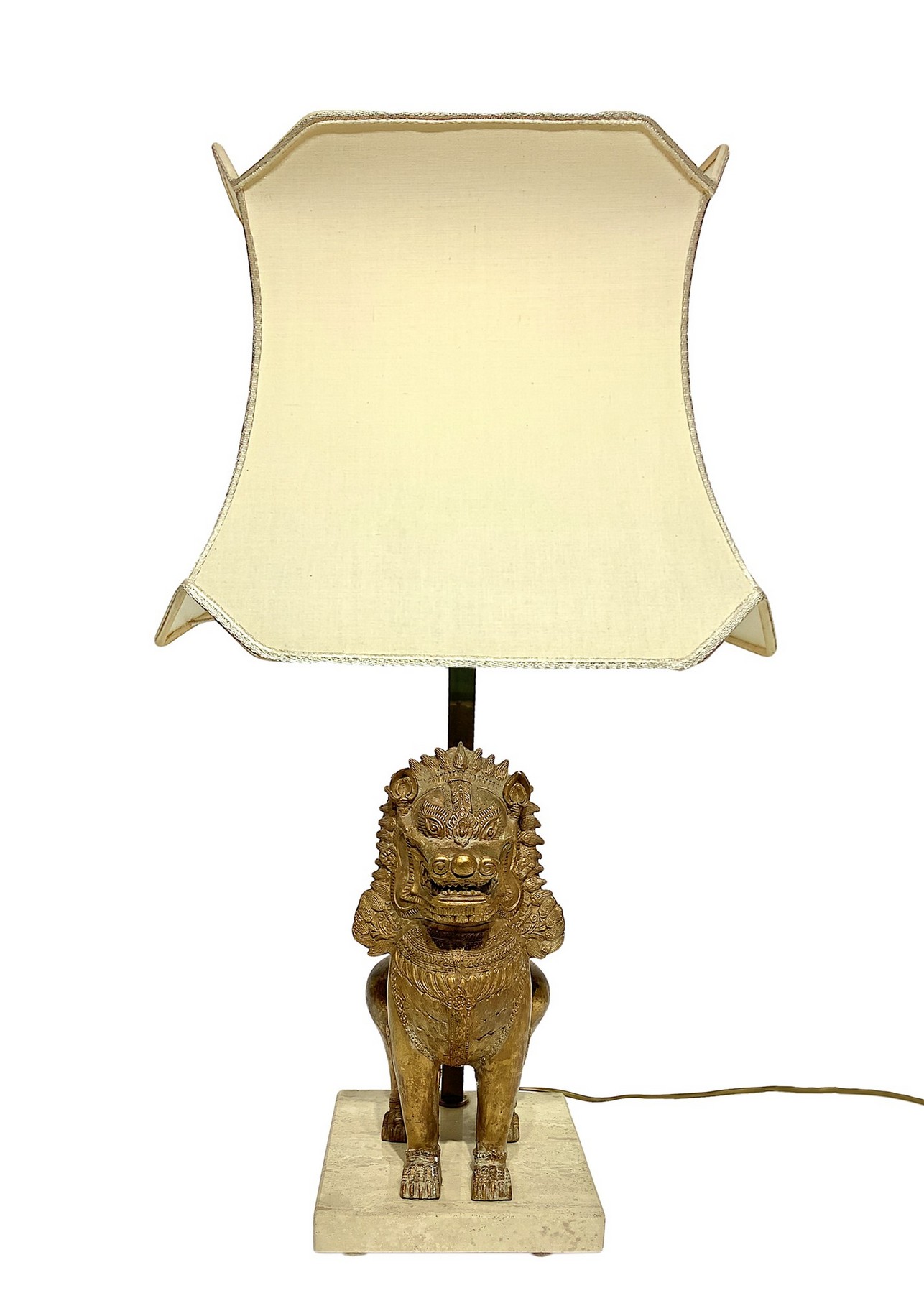 Lampada con base in marmo e corpo di leone in bronzo e paralume in tessuto