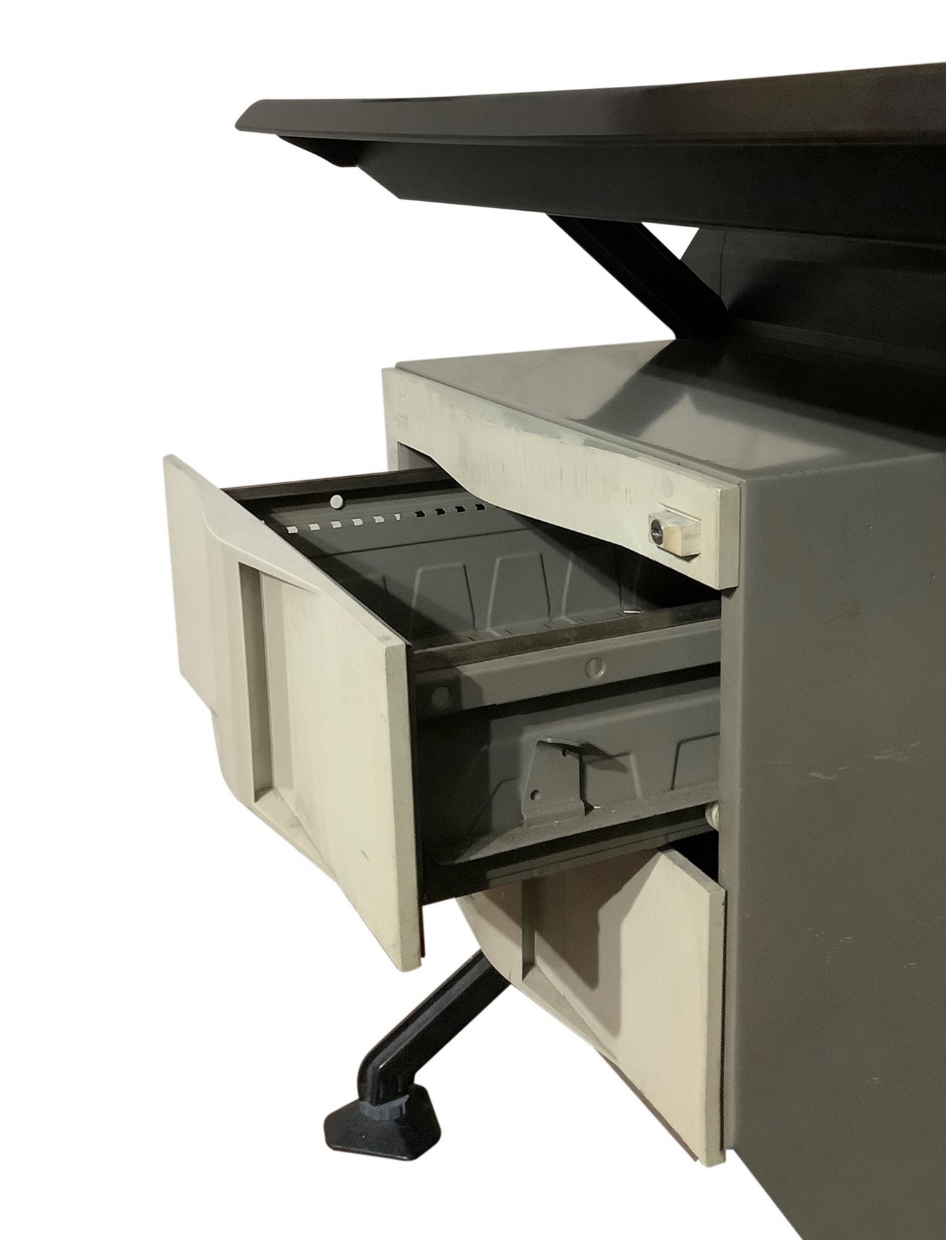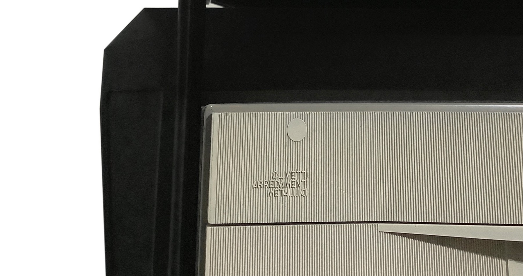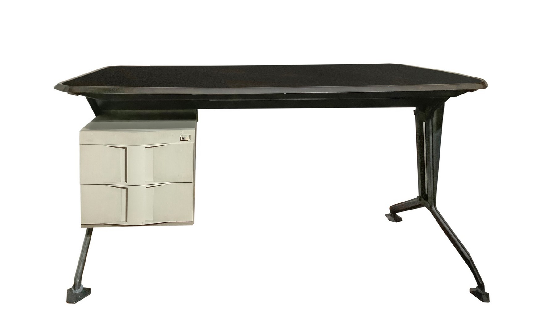 Disegno B.B.P.R Produzione Olivetti - Modello Synthesis, scrivania in metallo laccato nei toni del nero h79 x piano 160 cm, p 79 cm Piano in formica, cassettiera due cassetti in mettalo e plastica. Segni d'uso.