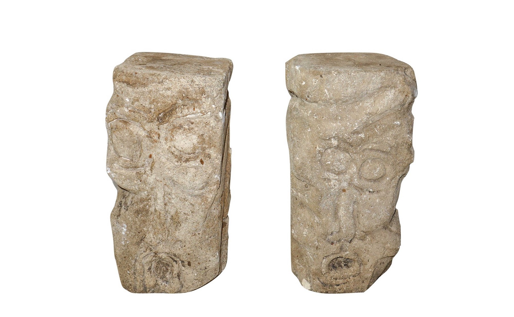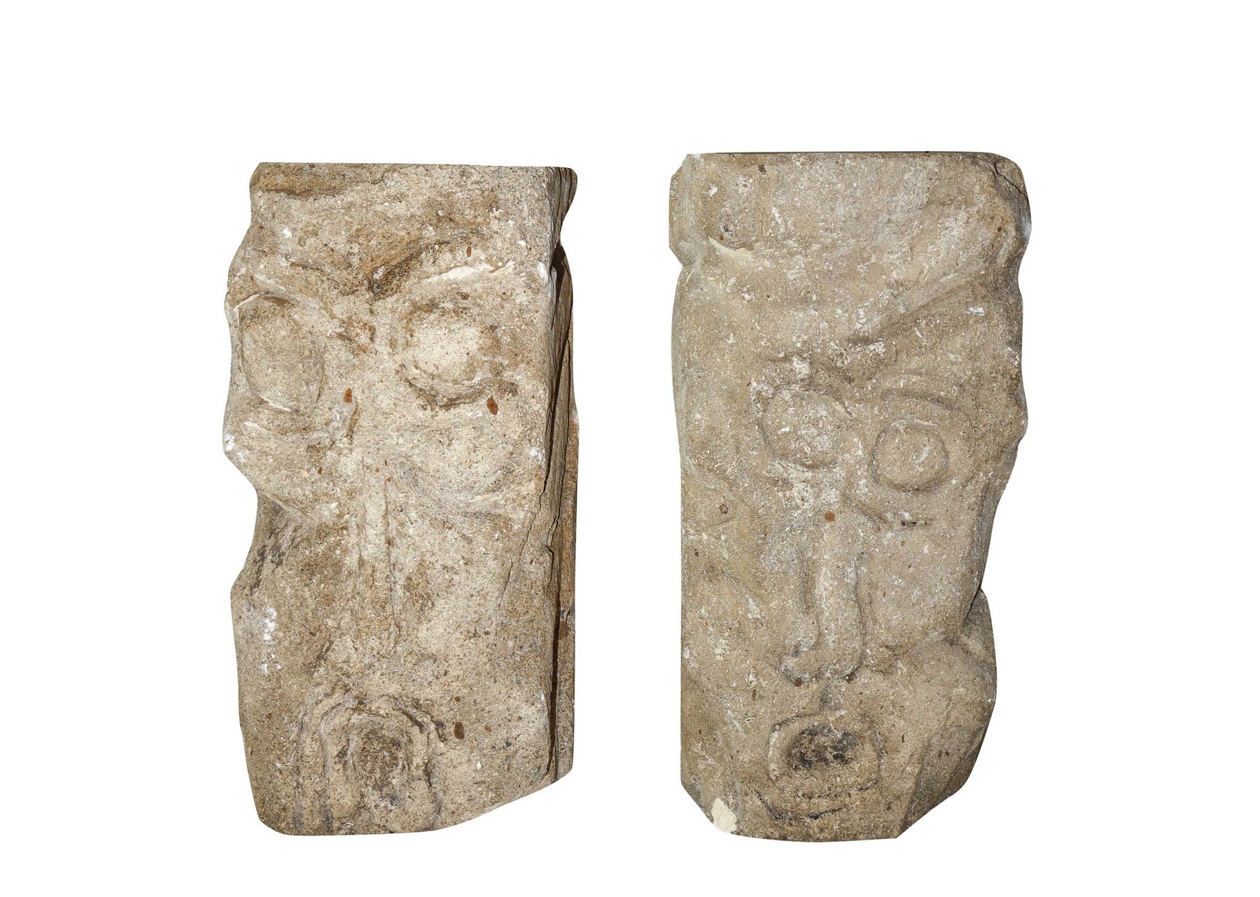 Coppia di Sculture in pietra arenaria, con raffigurazioni di volti