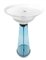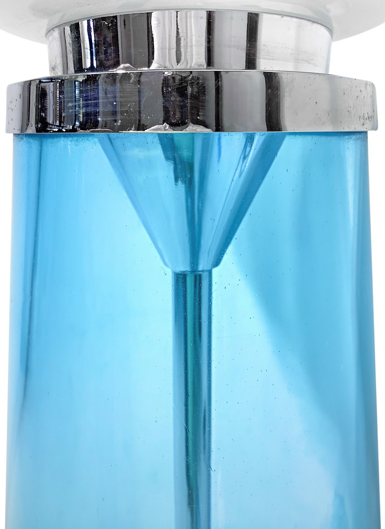 Struttura in metallo cromato, corpo in vetro trasparente di forma tronco-conica nei toni dell’azzurro, diffusore in vetro bianco incamiciato, controdiffusore in vetro satinato