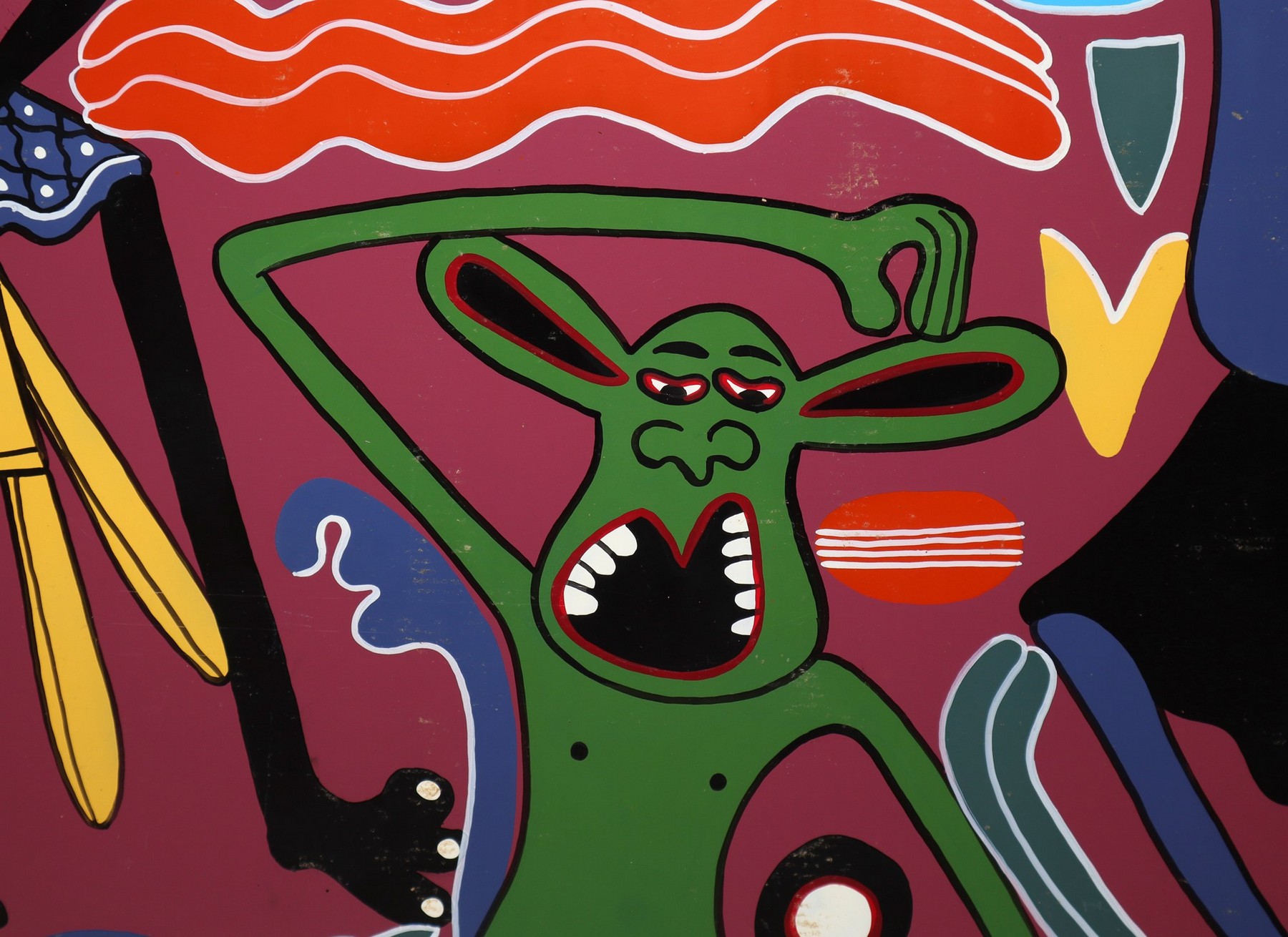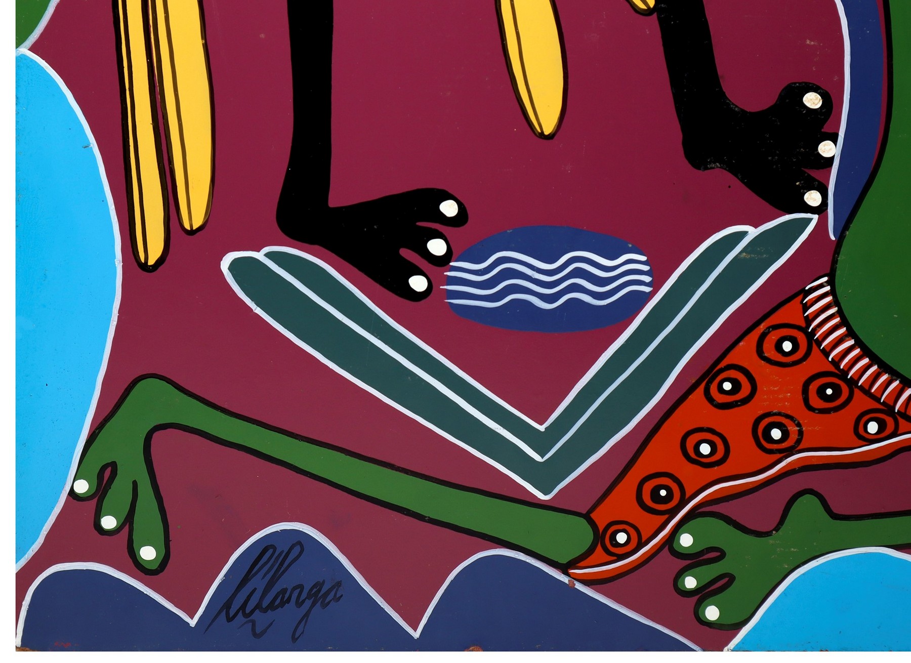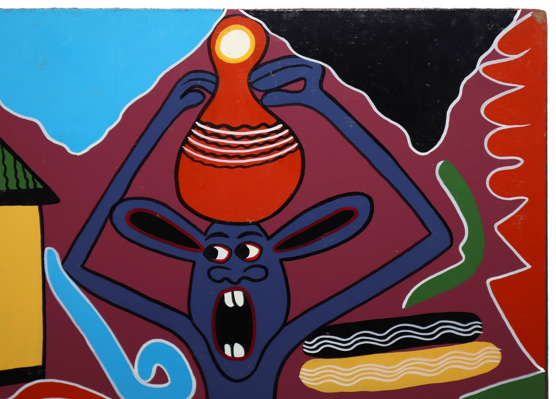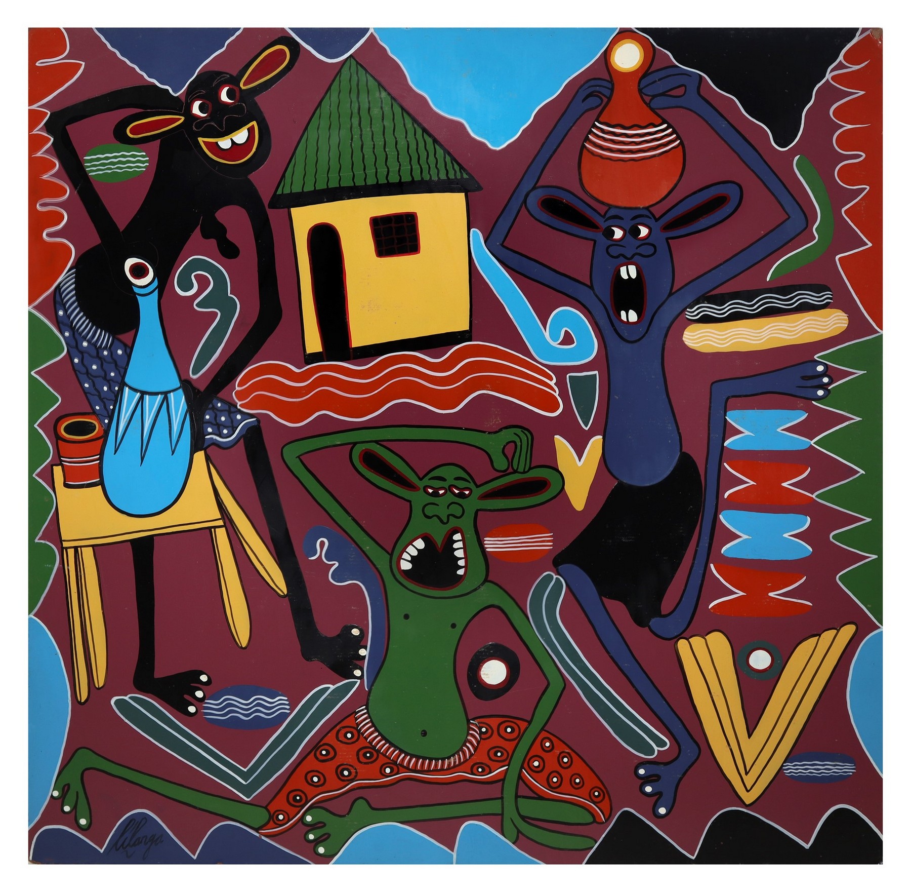 Lilanga George (Kikwetu 1934-Dar es Salaam 2005) - Maadalizi Yachakula Cha Baba cm 61x61, senza cornice Olio su faesite Firmato in basso a sinistra, autentica Capt Felix Lorenz su fotografia