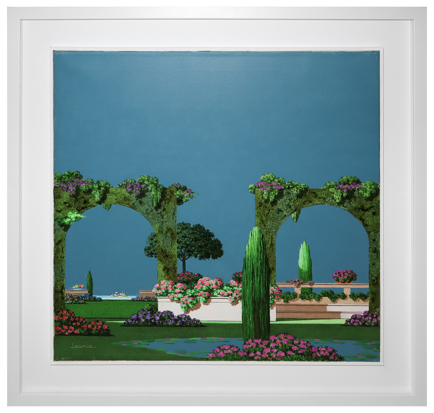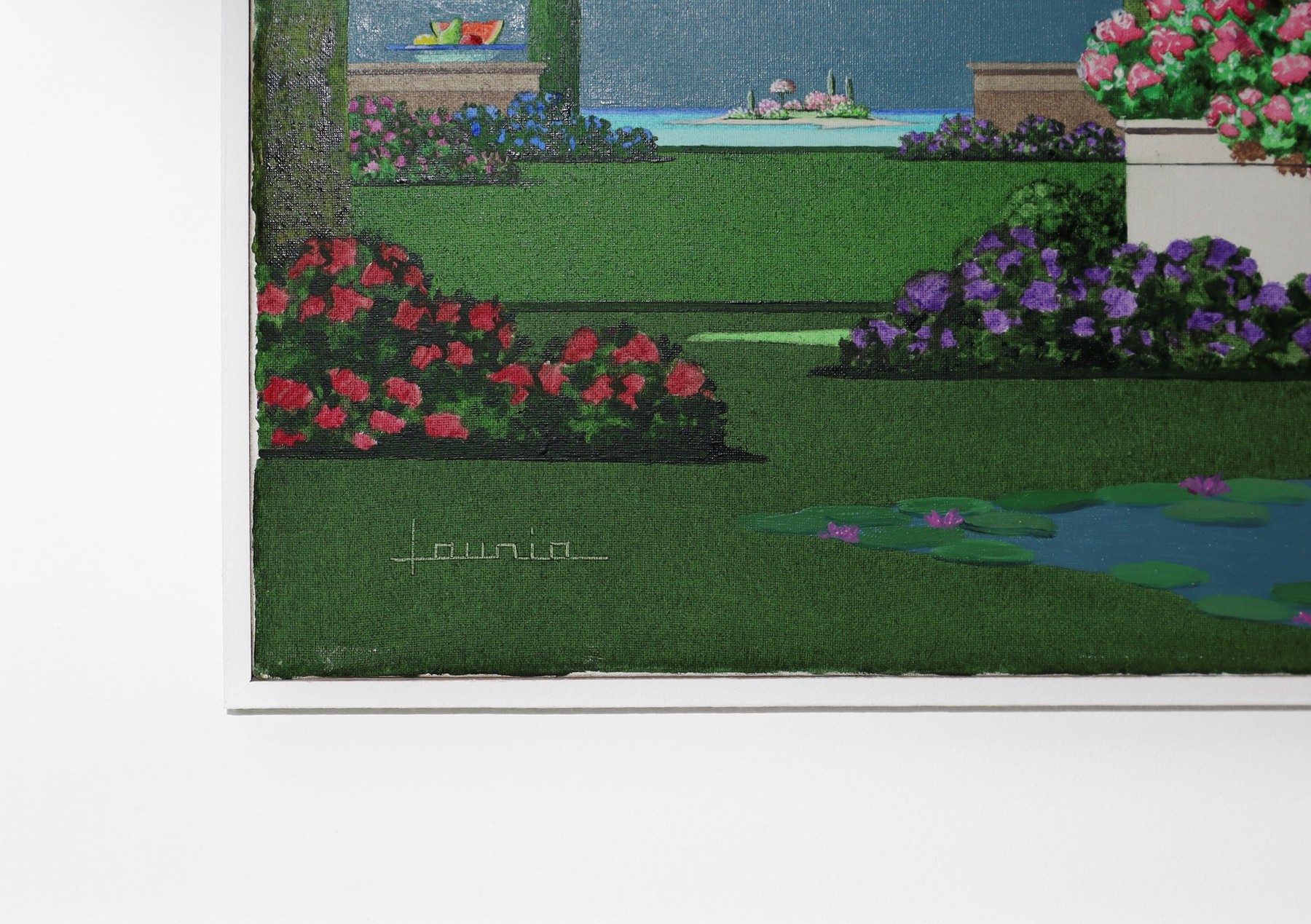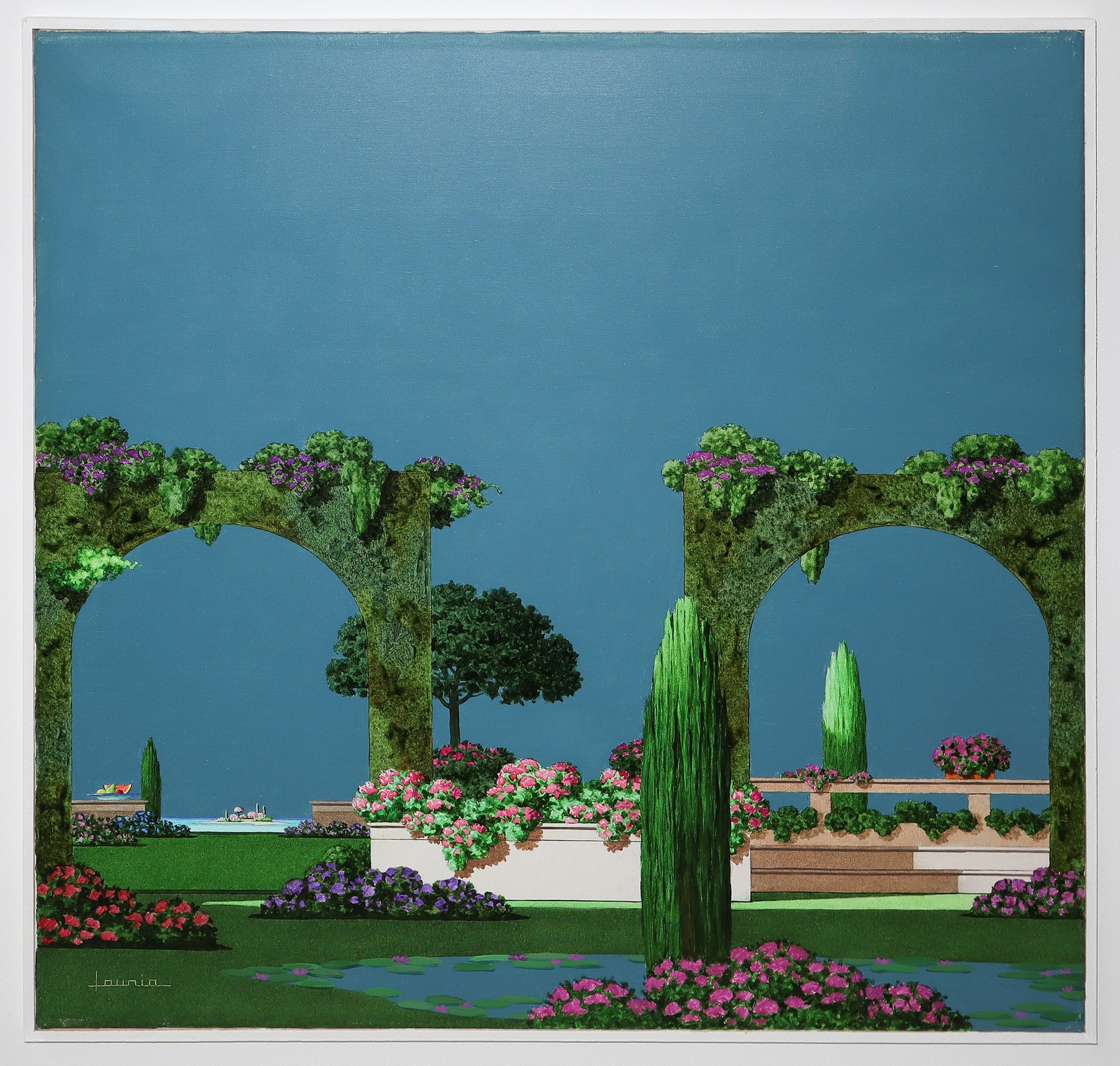 Giuseppe Lauria (Accettura 1940) - Giardino incantato, le città dell'utopia cm 50x50, in cornice cm 65x65 Olio su tela Firmato in basso a sinistra. Autentica della Telemarket2.
