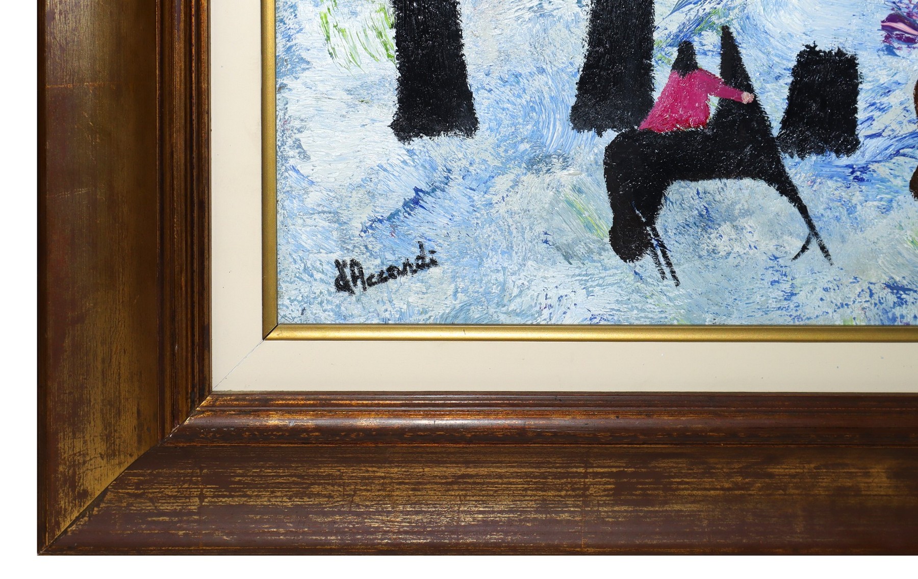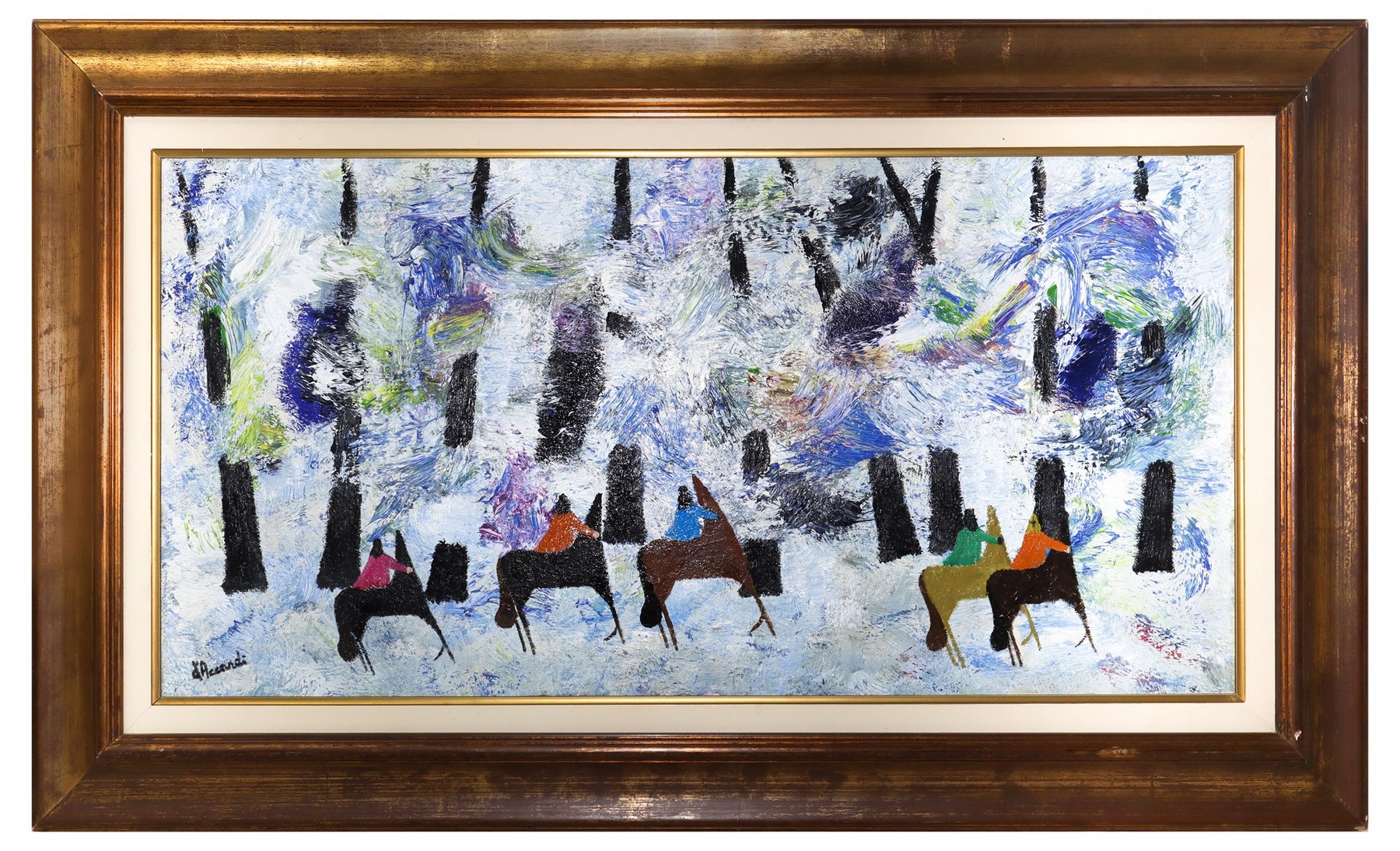 Gian Rodolfo D'Accardi (Palermo 1906-Varese 1993) - Cavalli su paesaggio innevato, 1970 Cm 40x80, in cornice cm 60x100 Olio su masonite. Firmato in basso a sinistra e firmato e dedicato al retro . Autentica dell'artista su fotografia