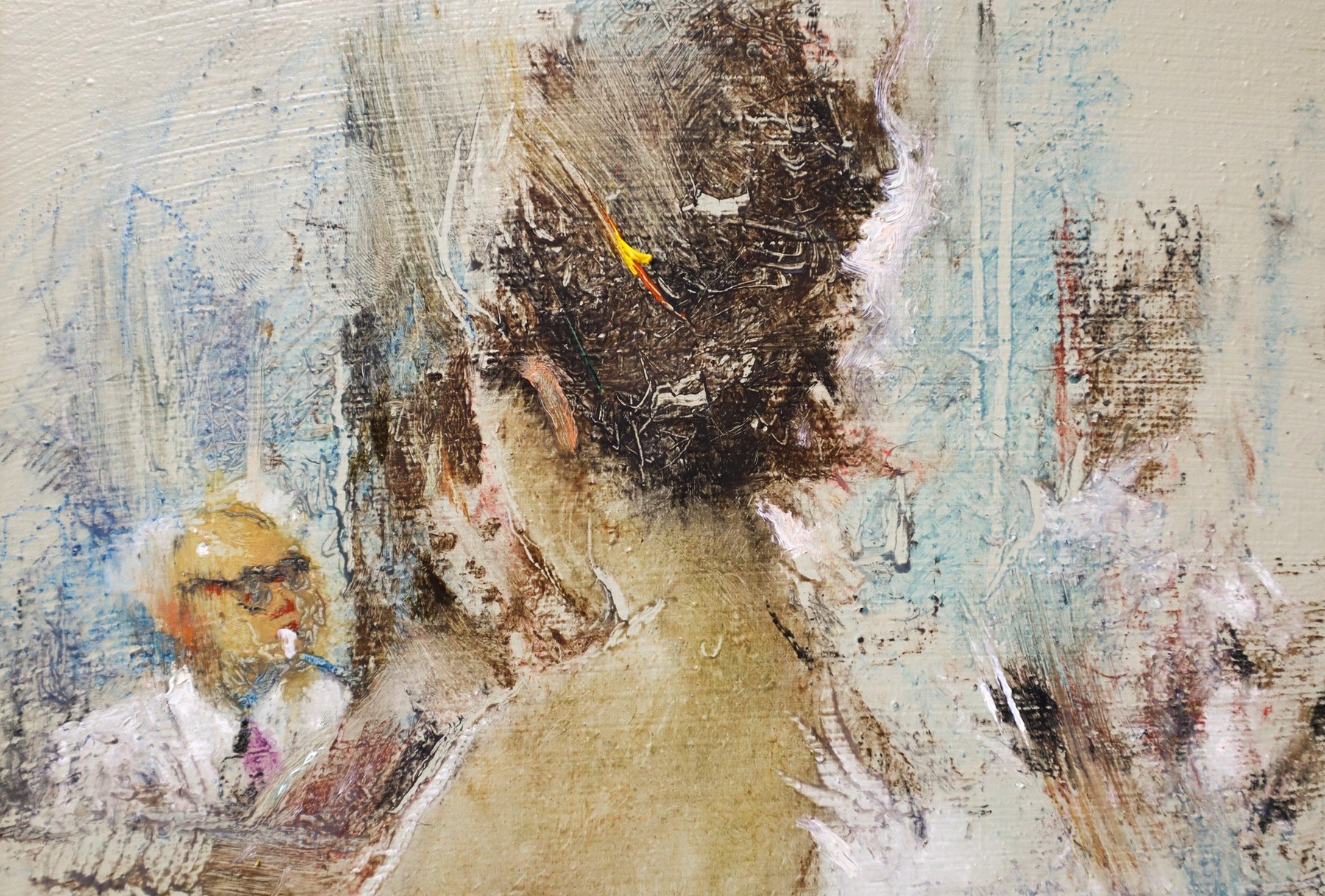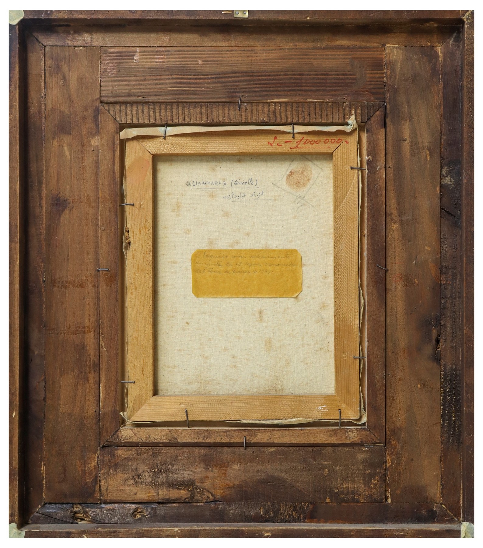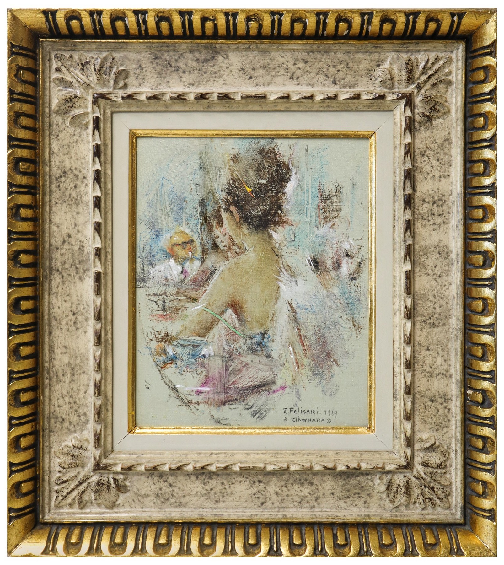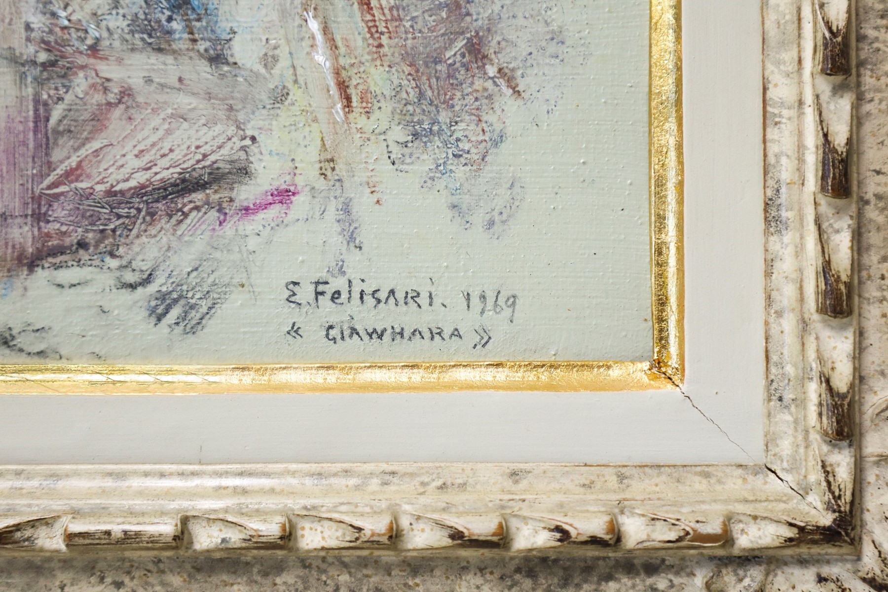 Enrico Felisari - jiawhar, 1969 Cm 30x24, in cornice cm 5548 Dipinto ad olio su tela Firmato in basso a destra e sul retro e datato 1969, presente cartiglio sul retro che recita che è stato realizzato durante la 1° tappa del Tour De France del 1969