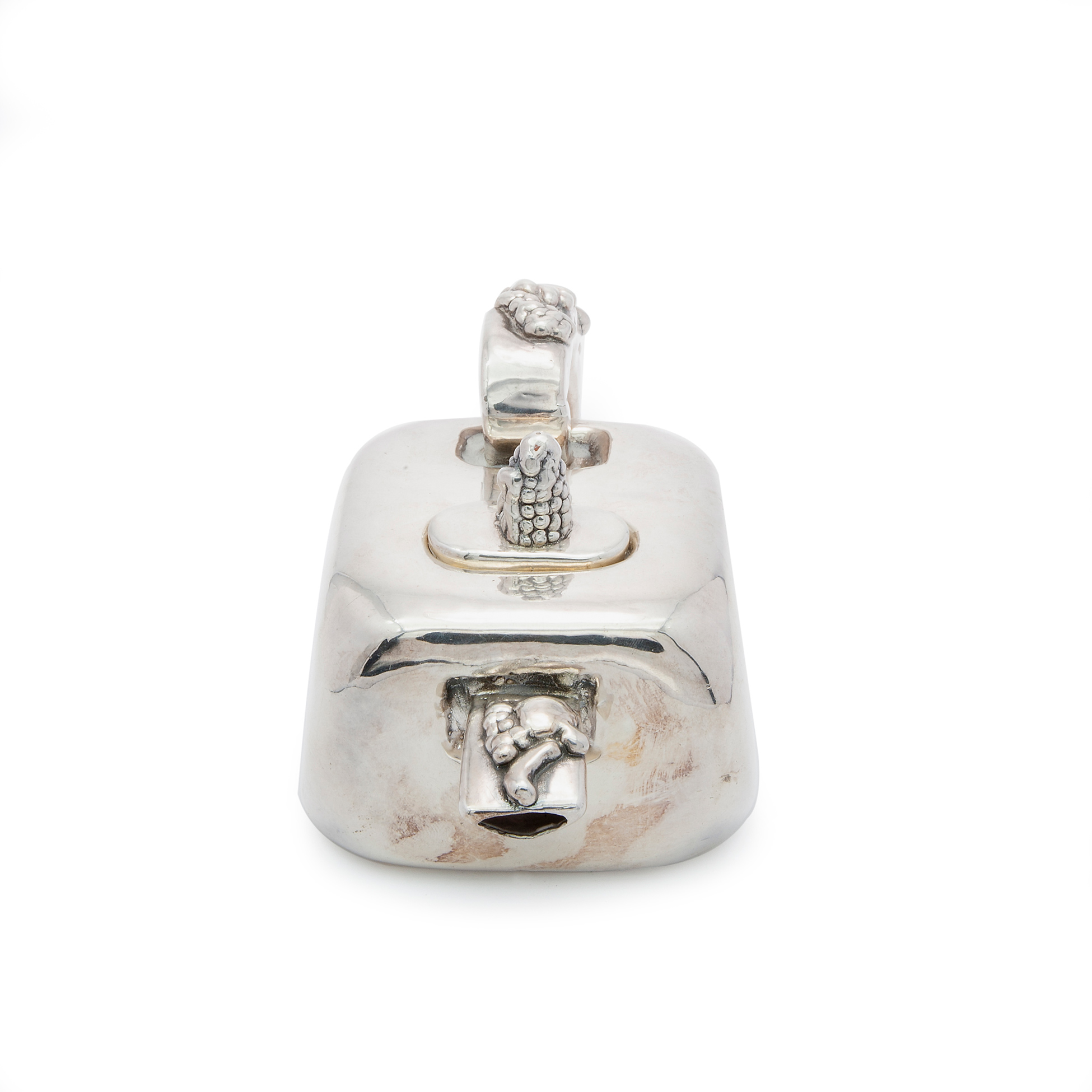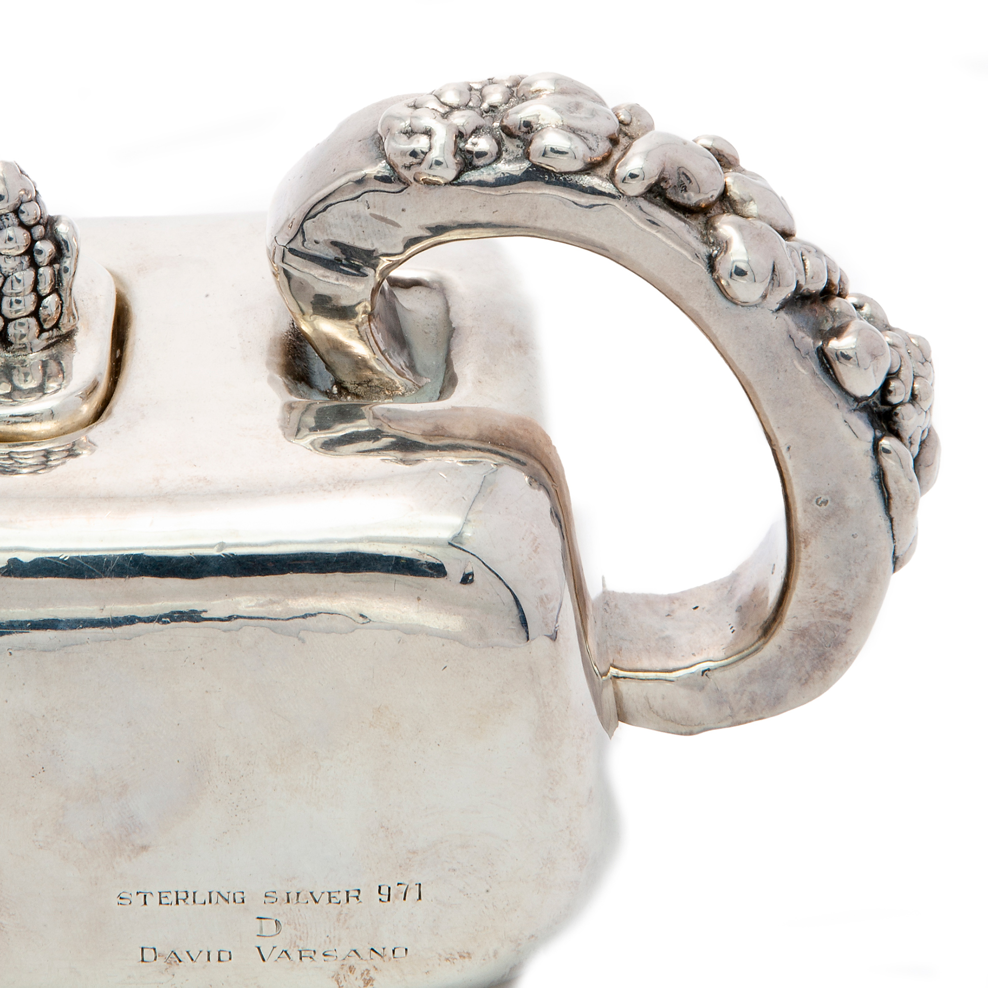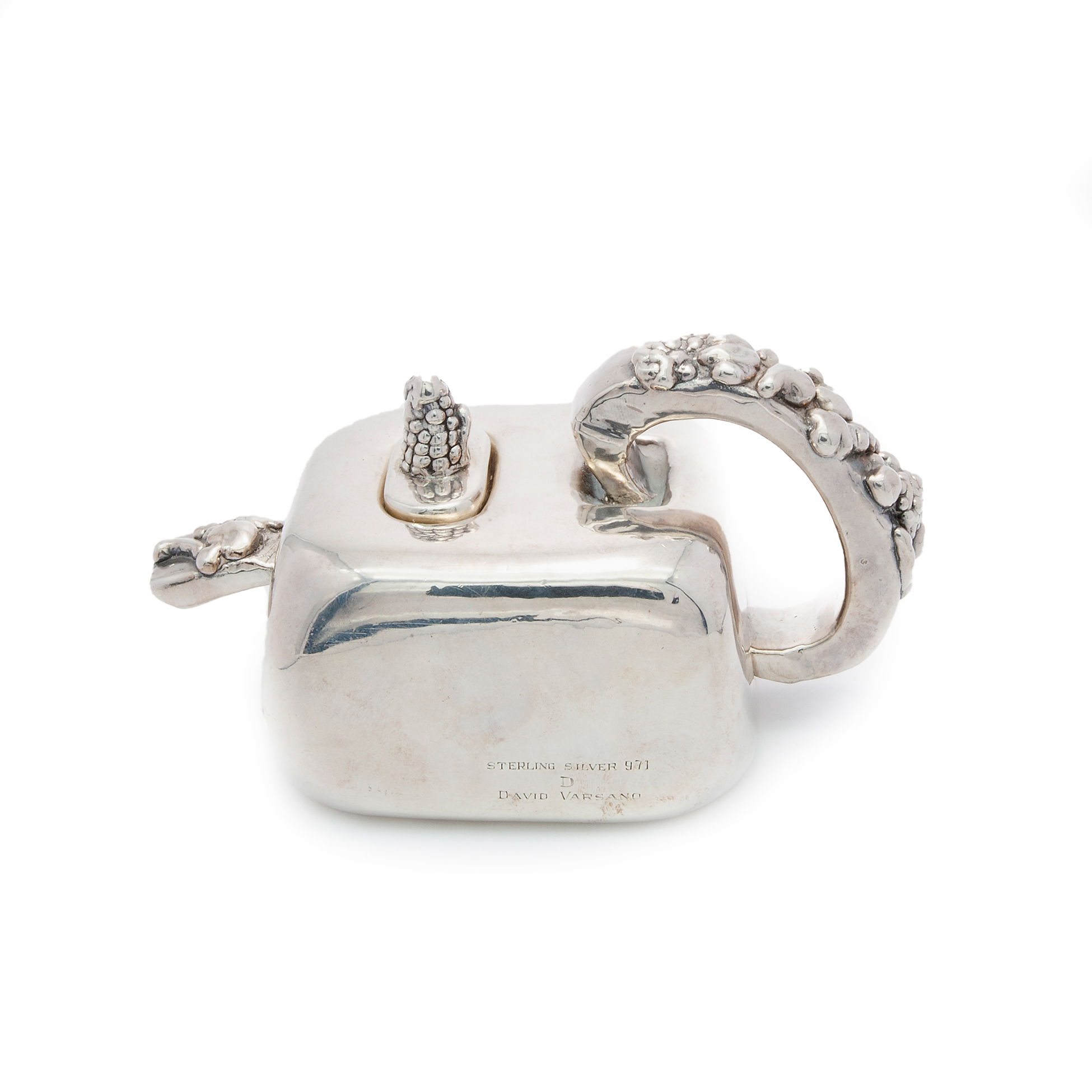 Originale teiera in argento, David Varsano XX secolo Manufatta a base quadrata, corpo a superficie liscia, con manico e presa con decorazioni naturalistiche; peso complessivo gr. 360 Dimensioni 9x16x9 cm.