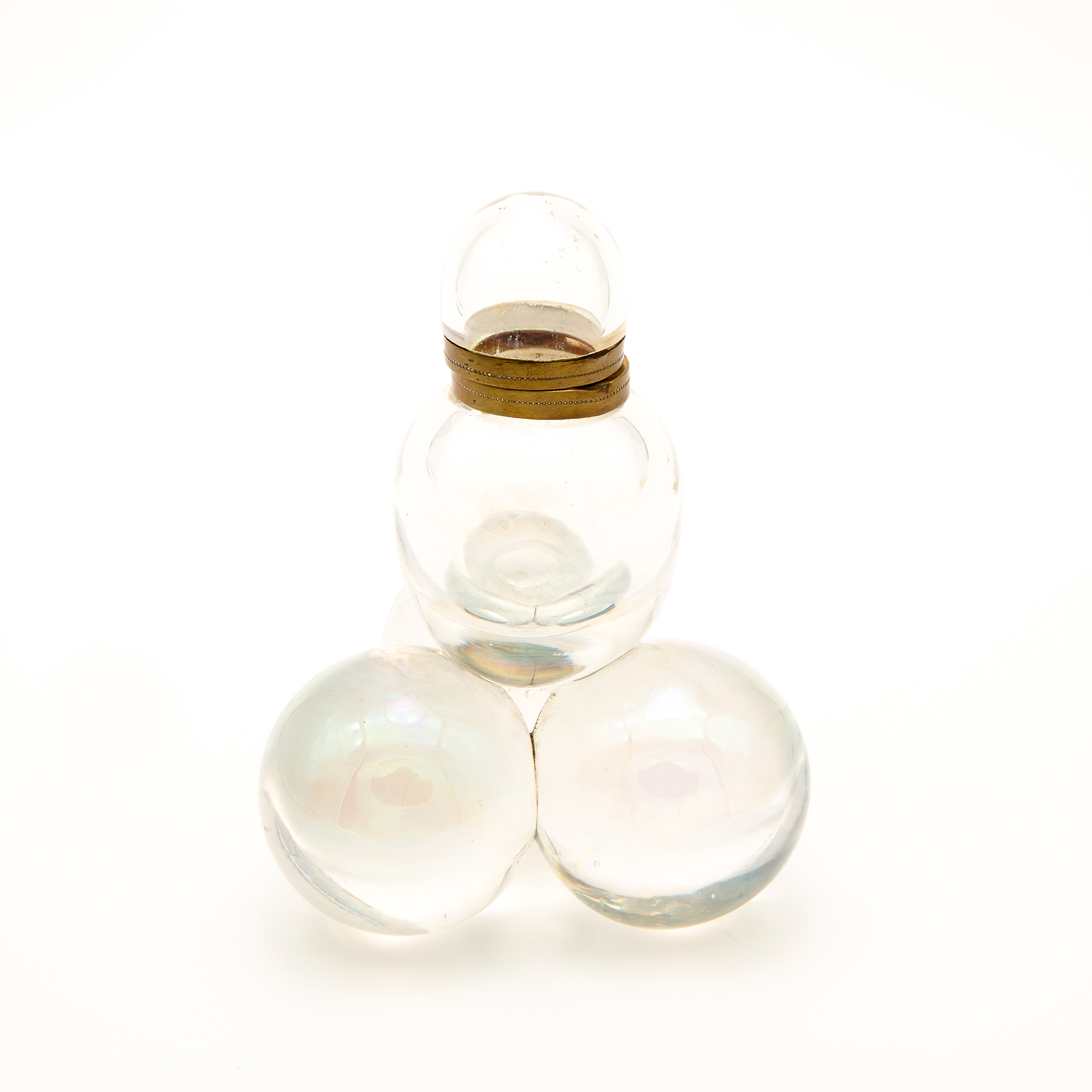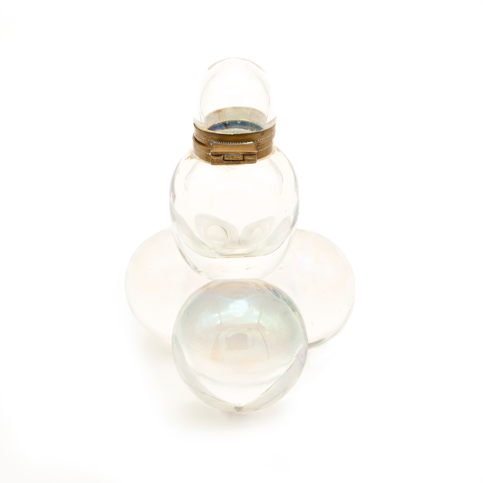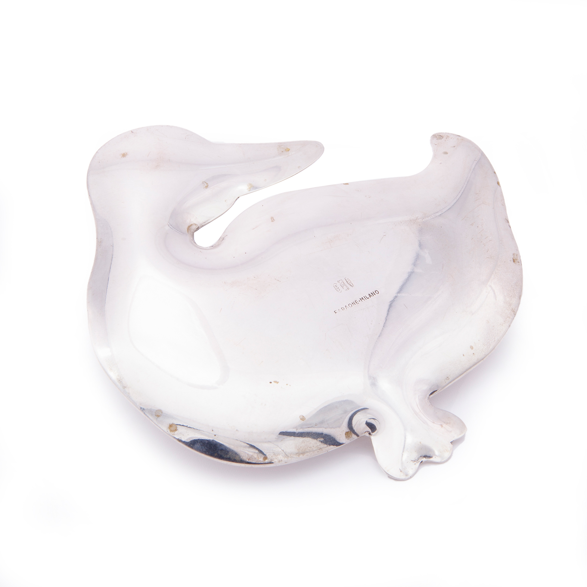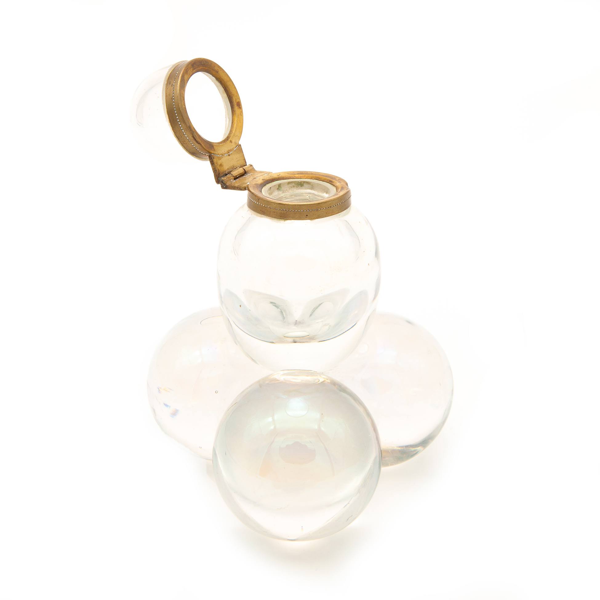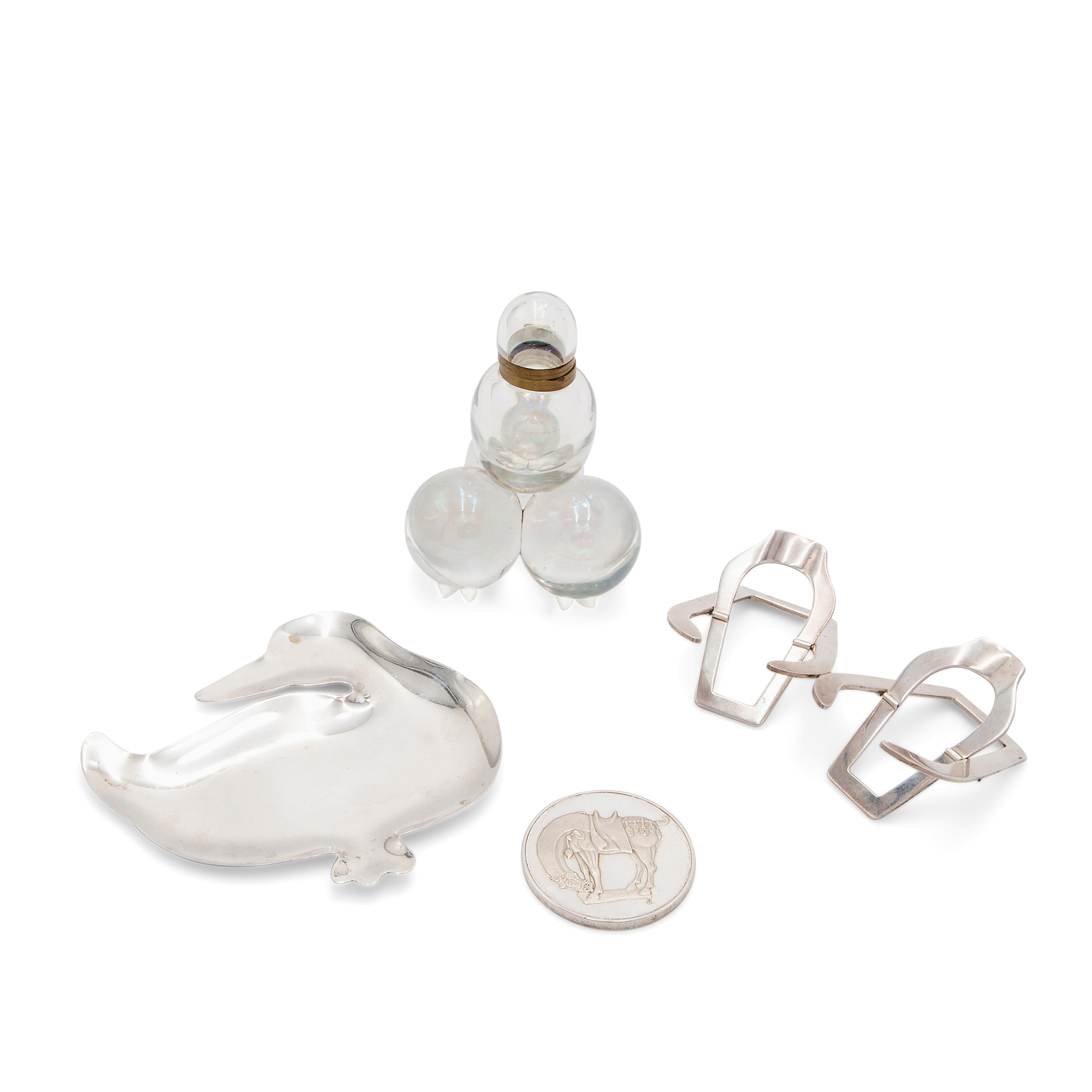 Set da scrivania in vetro e argento Gruppo composto da: un calamaio a cinque sfere in vetro e metallo dorato, un posacenere in argento in forma di anatra recante la firma 'Faraone Milano' -peso gr. 66 - e un reggi sigaretta da tavola in argento 925, peso