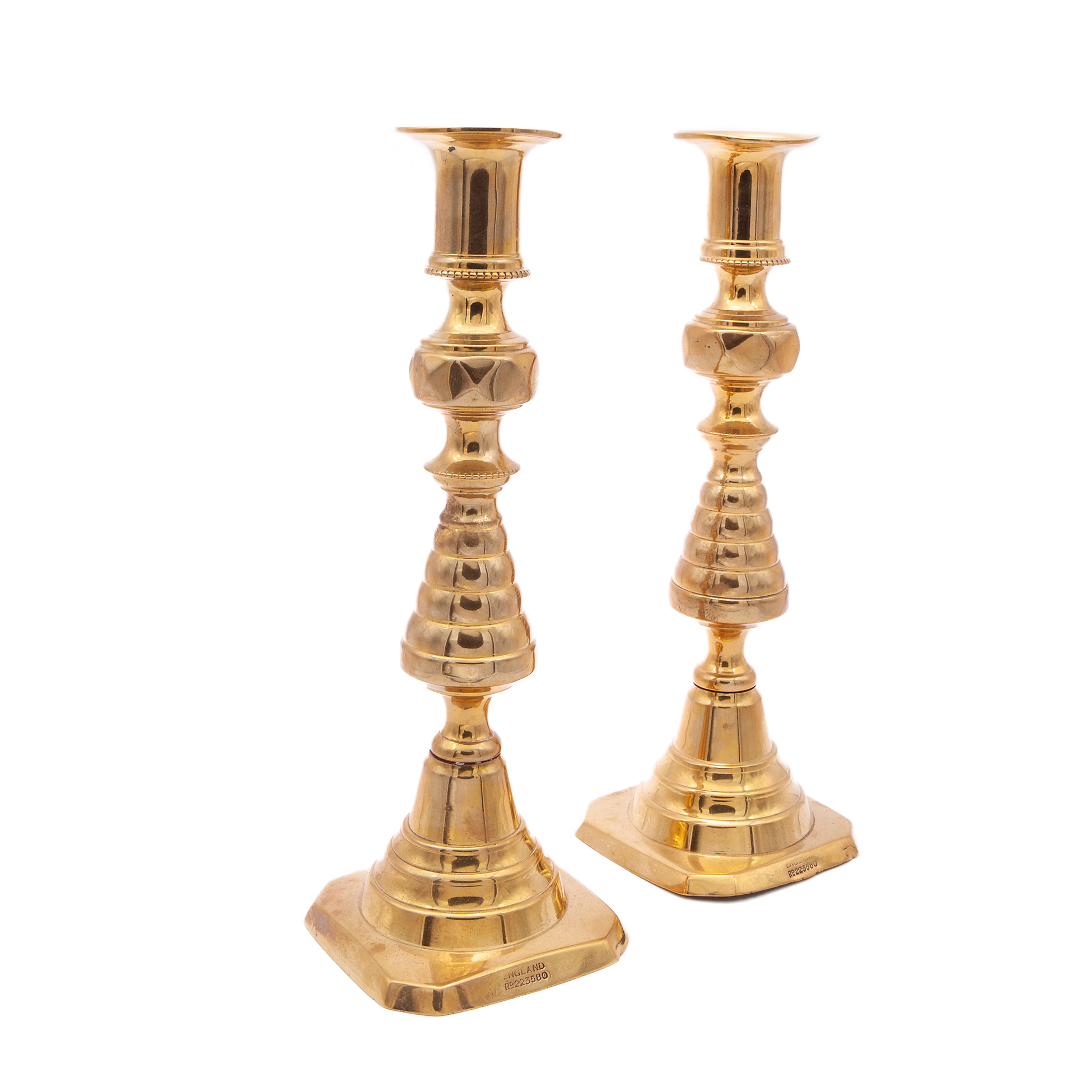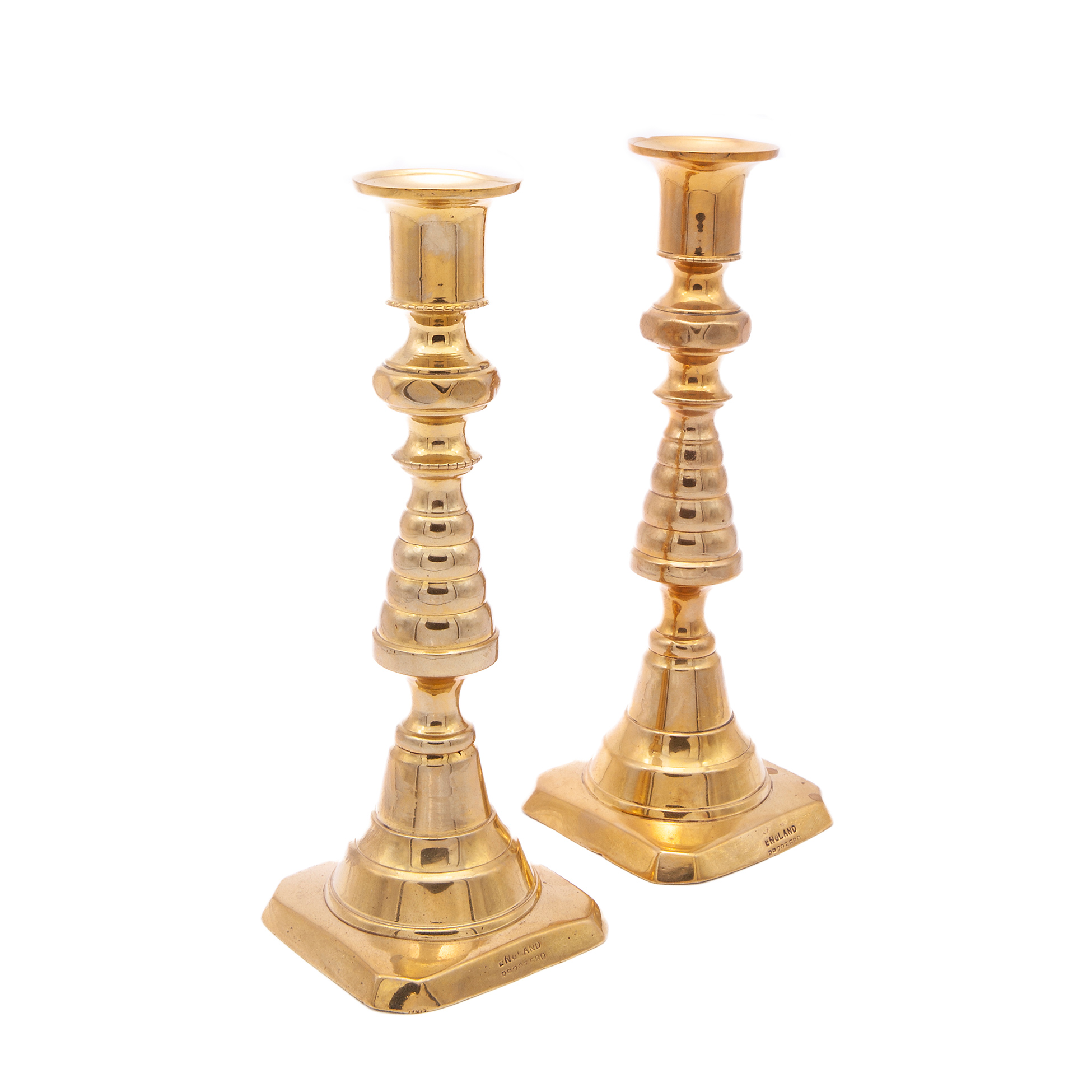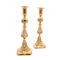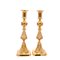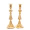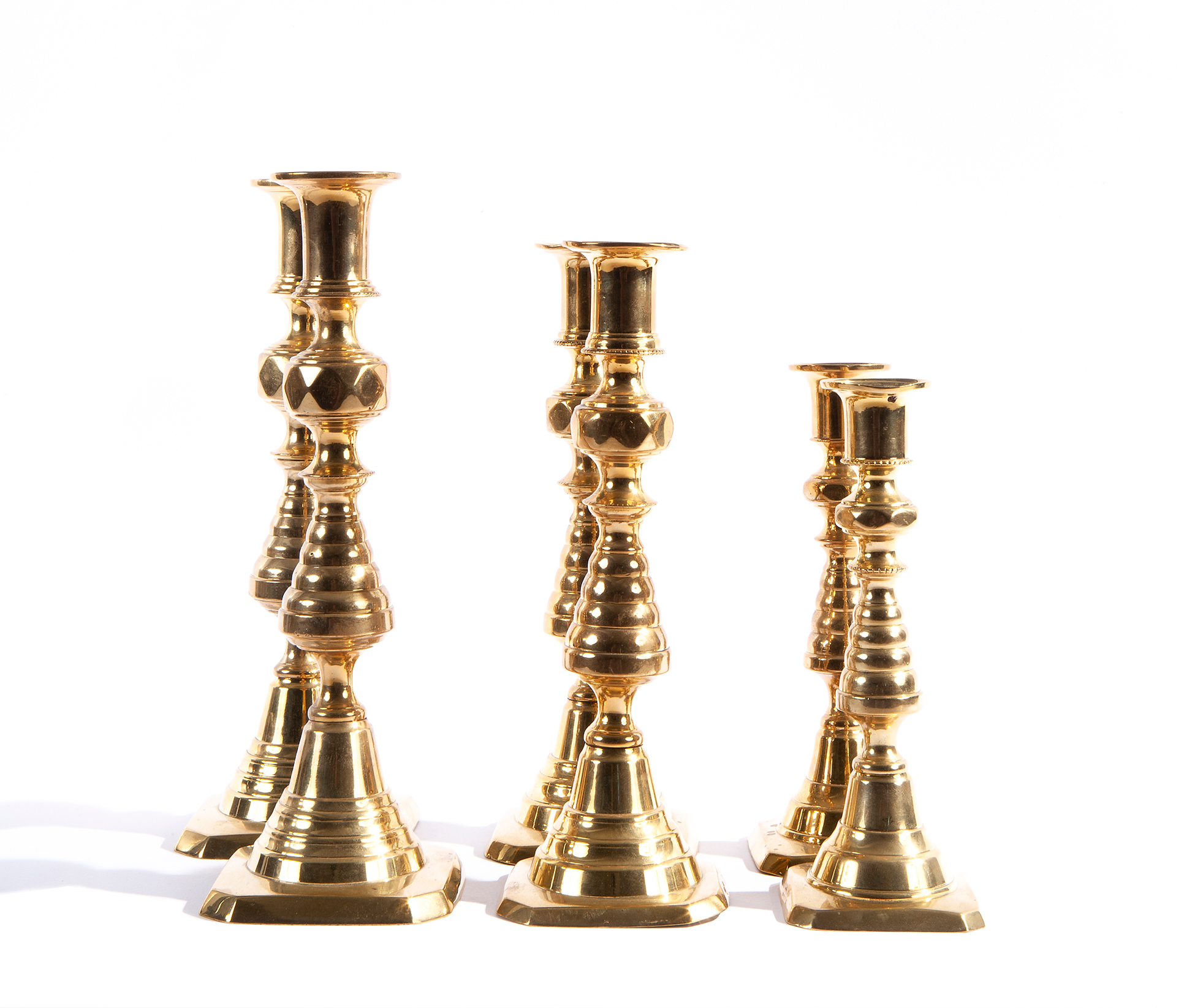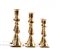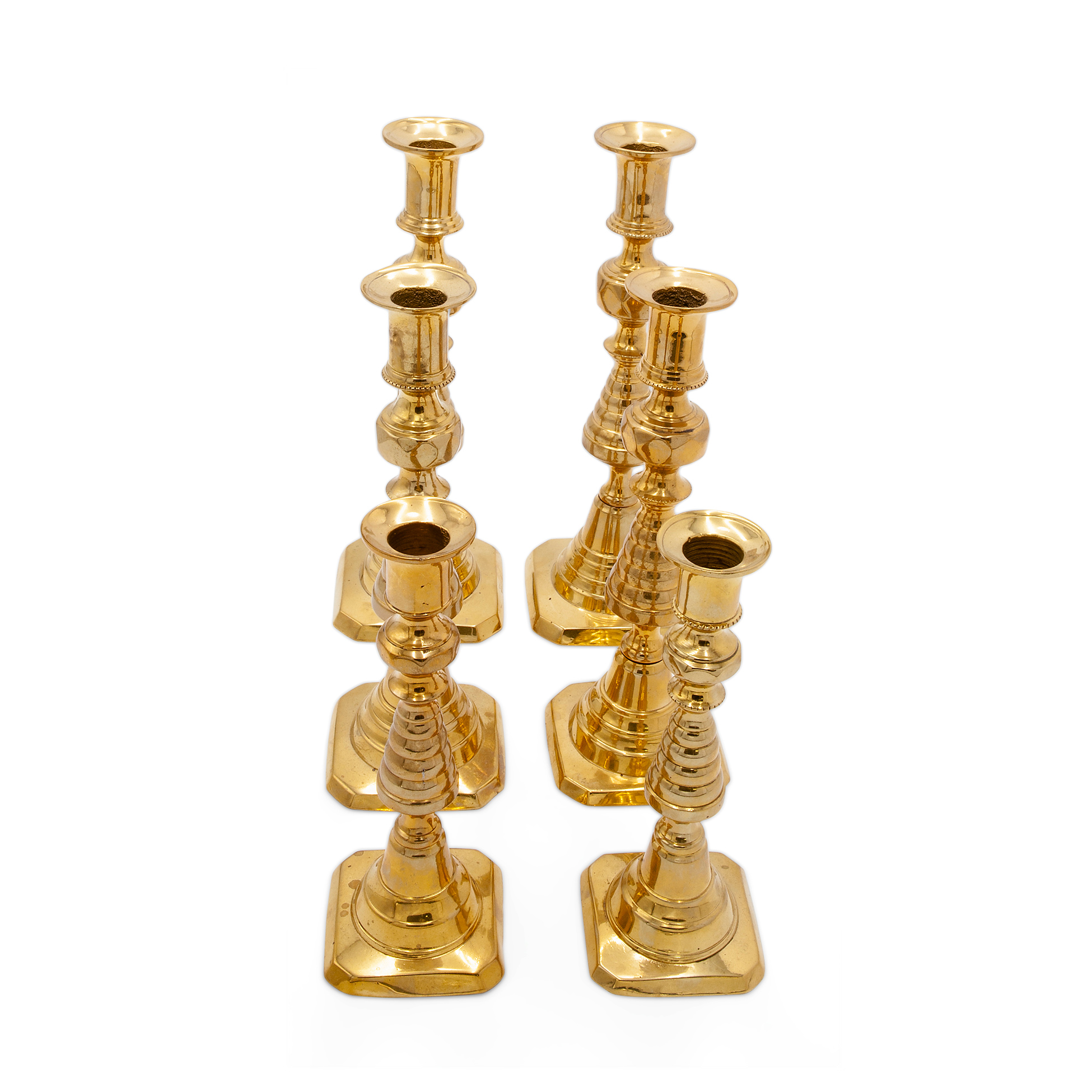 Gruppo di sei candelabri in metallo dorato Due reggicandela alti, recanti timbro 'England R. 223580', due reggicandela medi, recanti timbro 'England R. 223581', reggicandela bassi, recanti timbro 'England R. 223582'. Dimensioni 25x8x8, 23x7,5x7,5 e