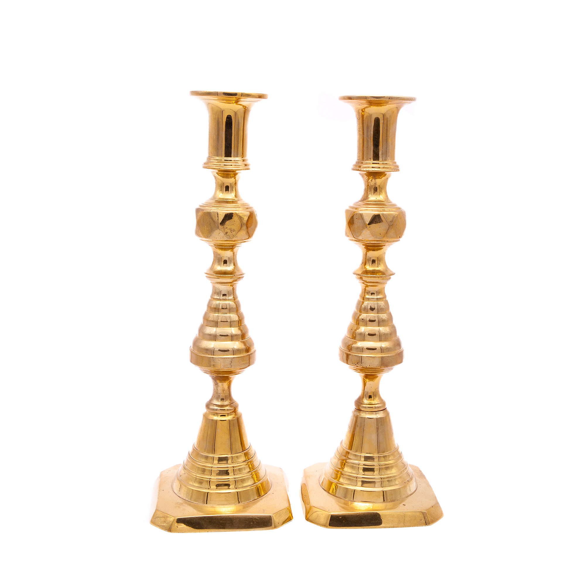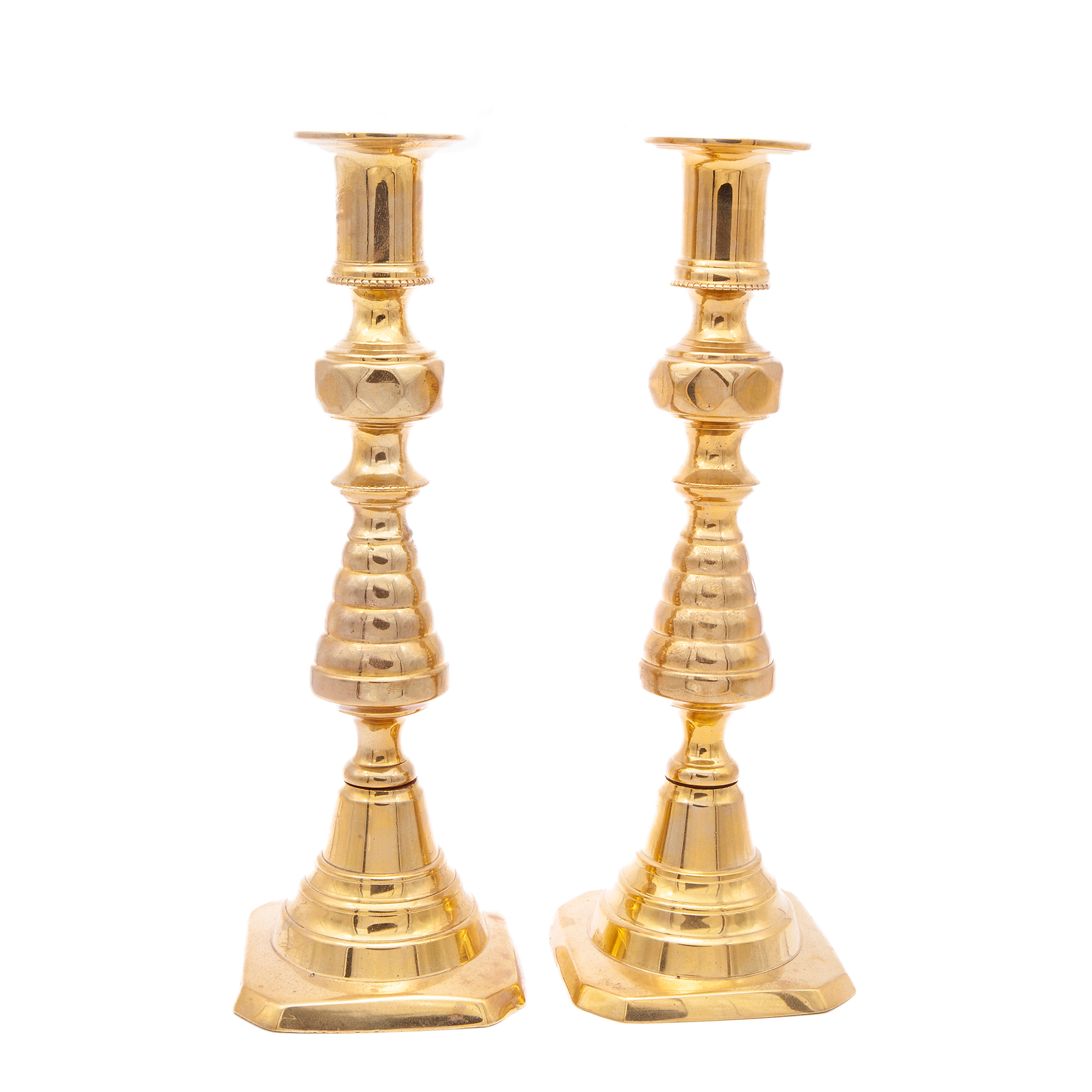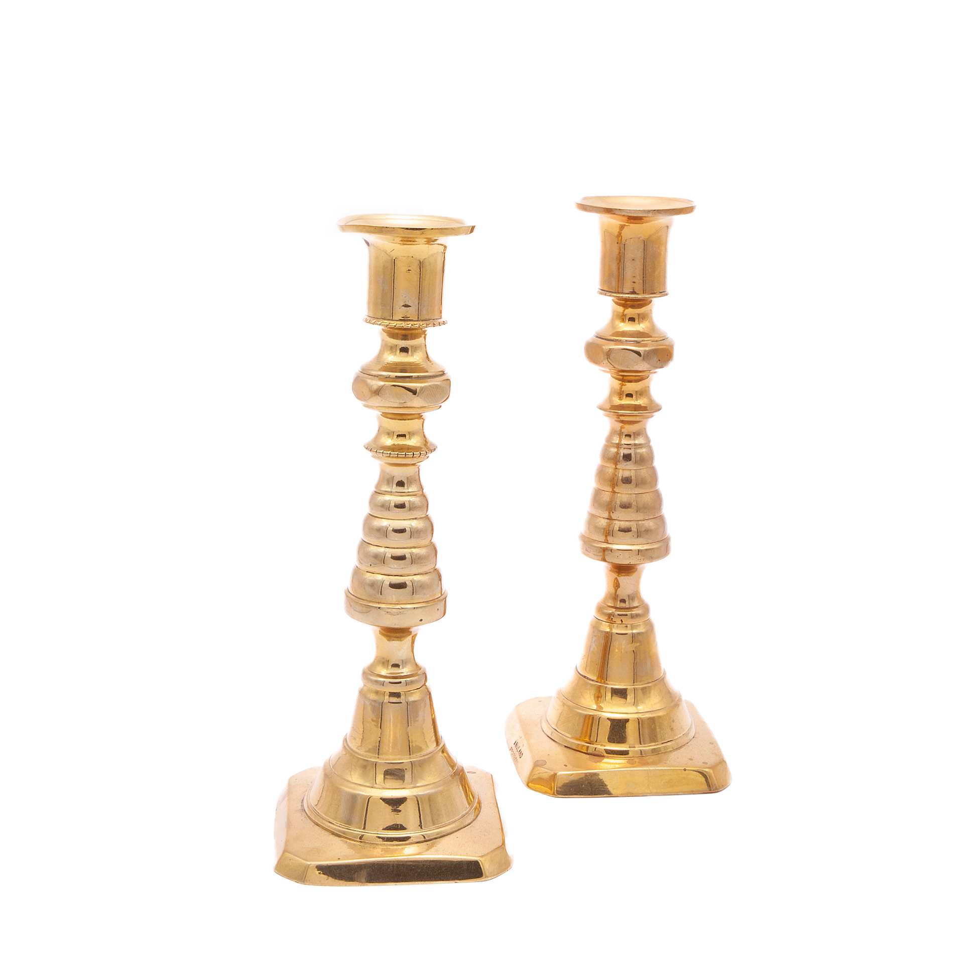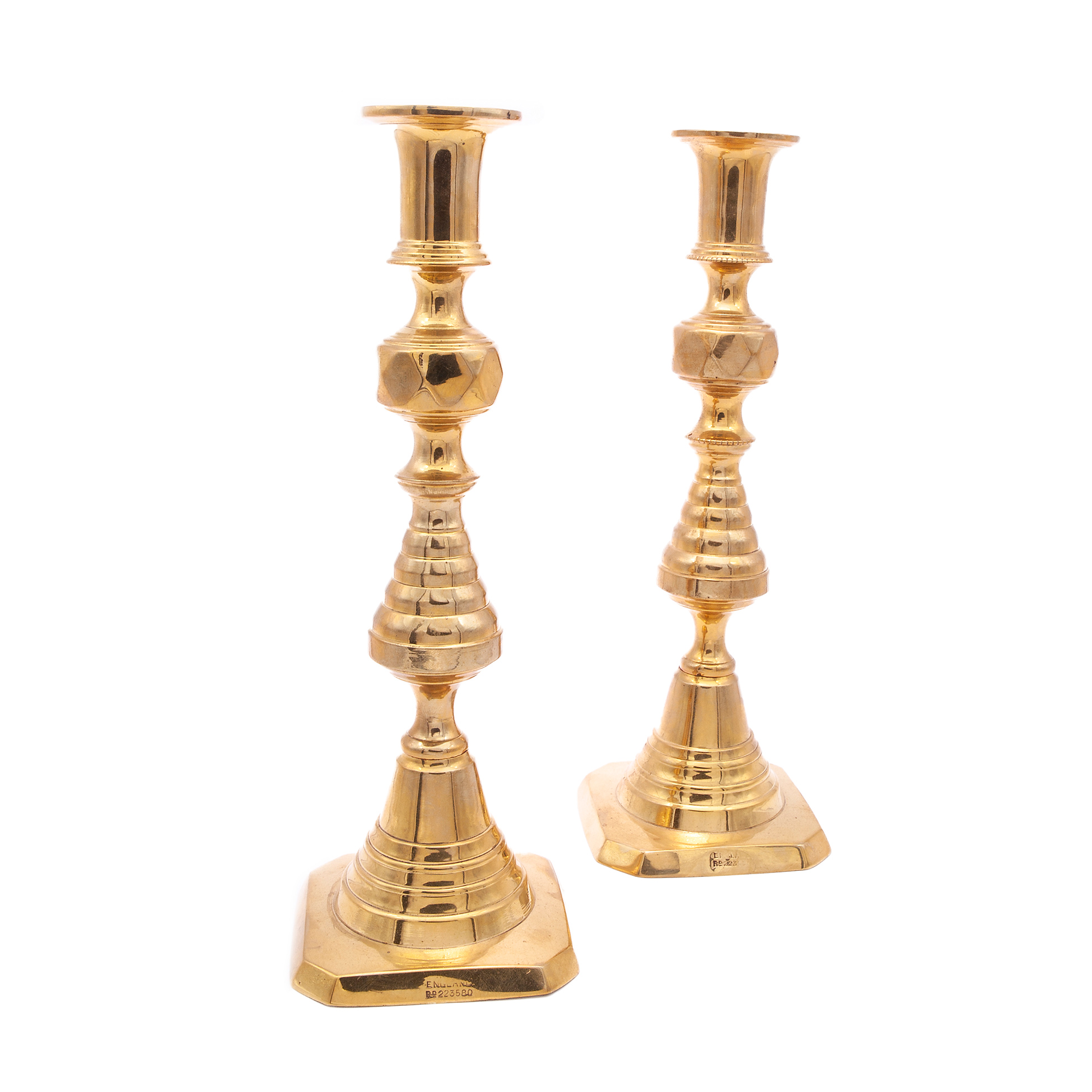 Gruppo di sei candelabri in metallo dorato Due reggicandela alti, recanti timbro 'England R. 223580', due reggicandela medi, recanti timbro 'England R. 223581', reggicandela bassi, recanti timbro 'England R. 223582'. Dimensioni 25x8x8, 23x7,5x7,5 e