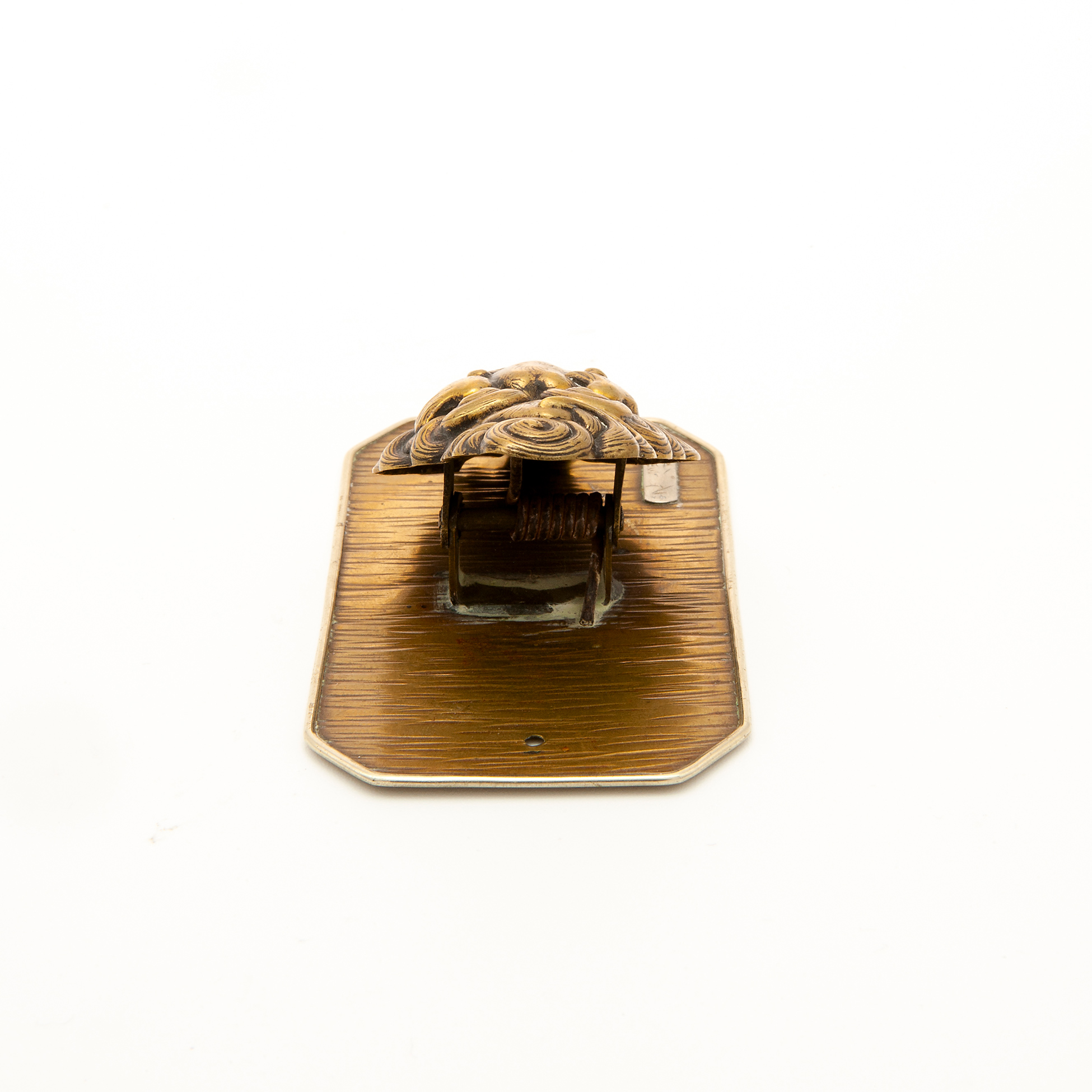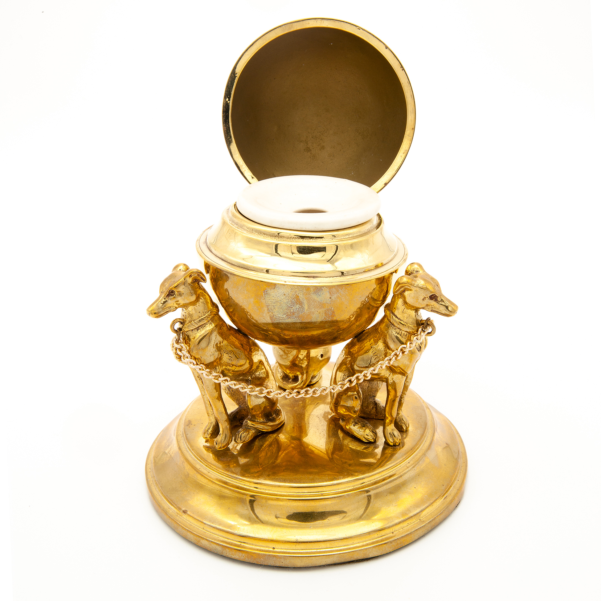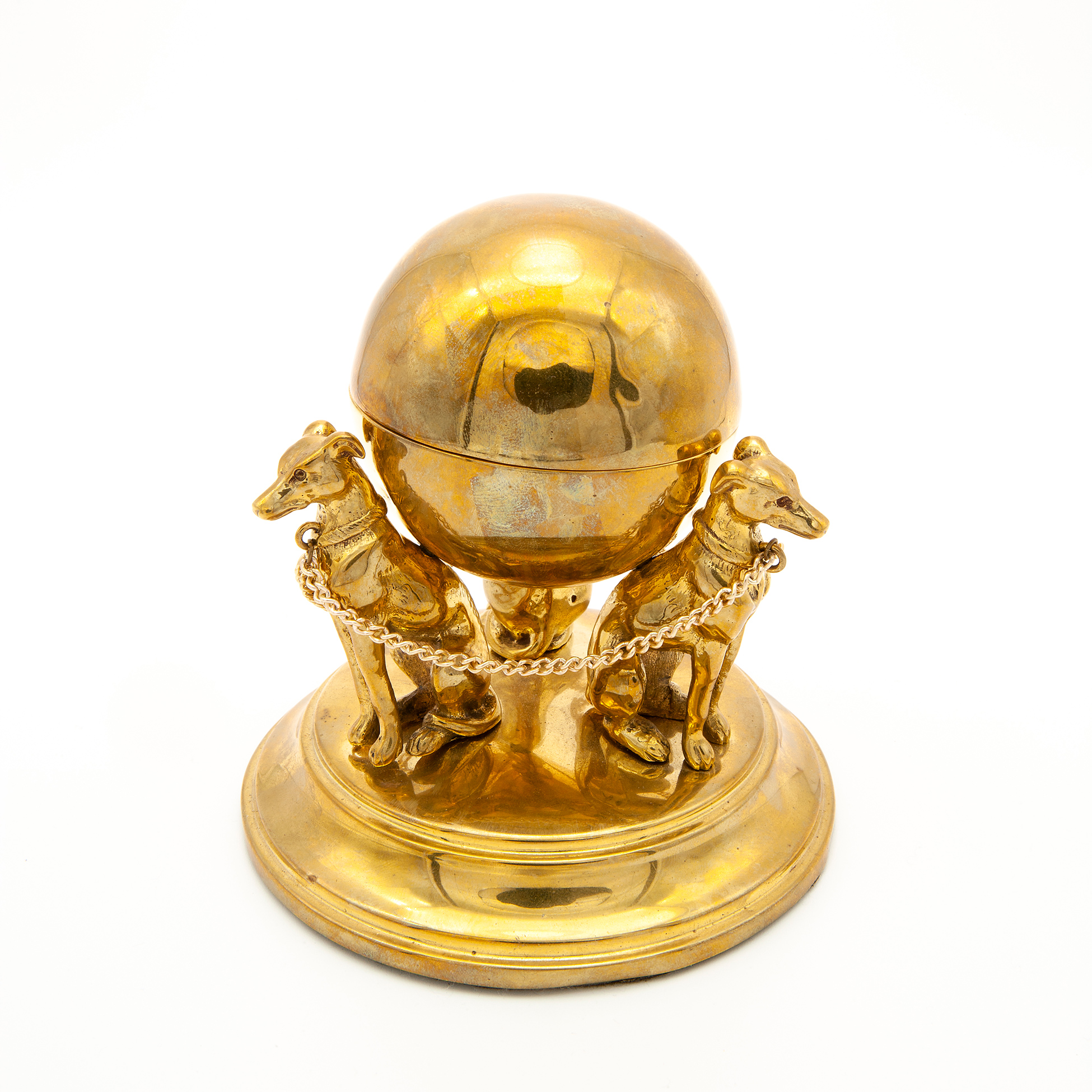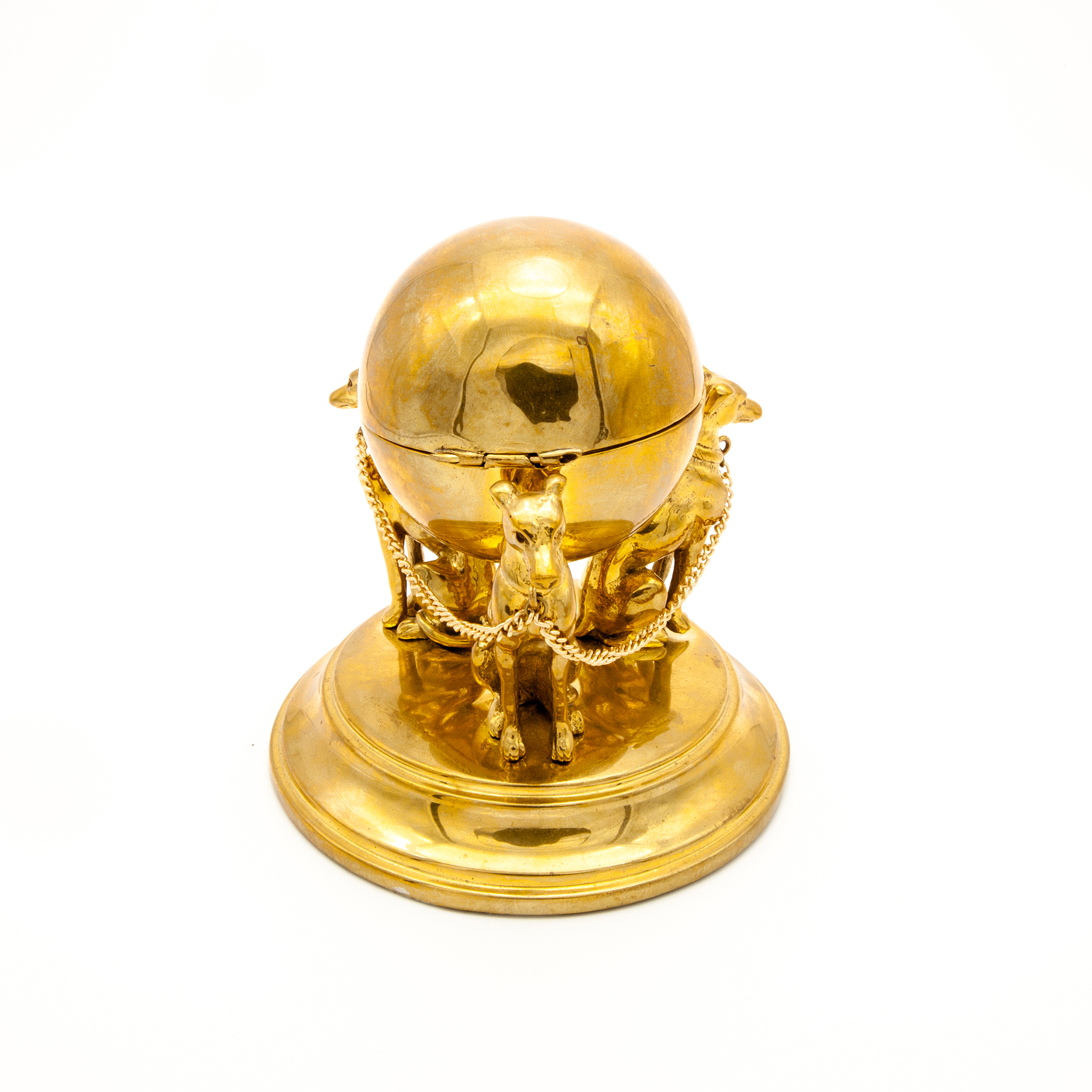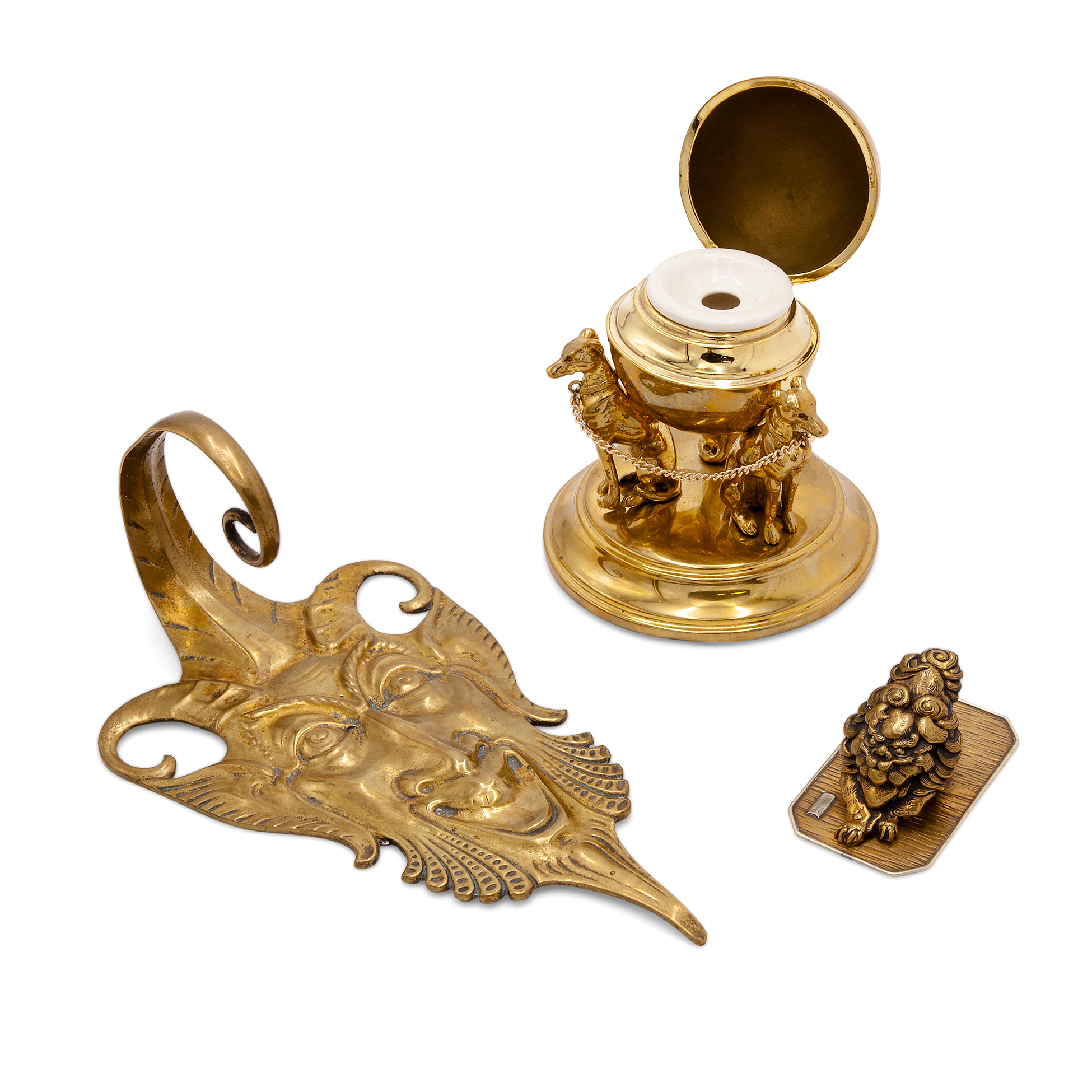 Set da scrivania in metallo dorato Calamaio in forma di sfera con tre levrieri in metallo dorato. Un appendiabiti in forma di mascherone realizzato in metallo dorato e una pinza fermacarte in forma di leone, di probabile manifattura asiatica e realizza