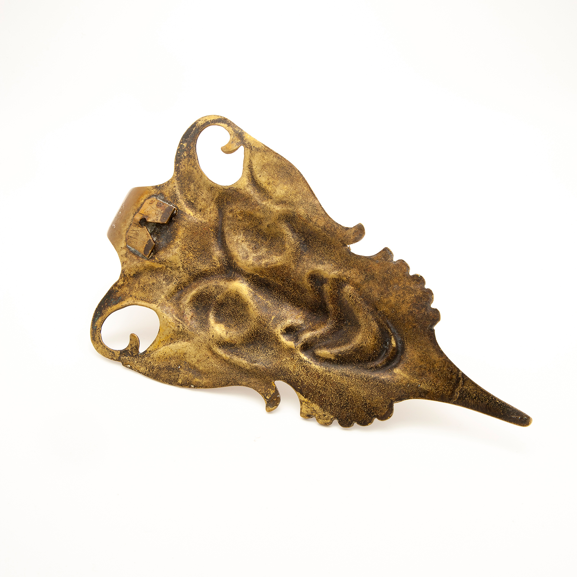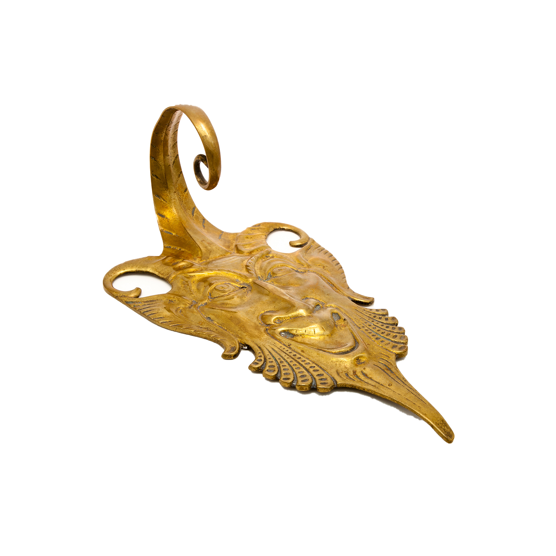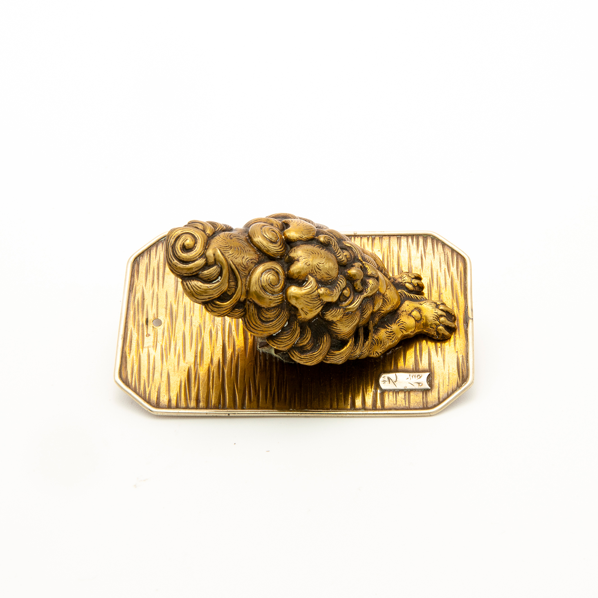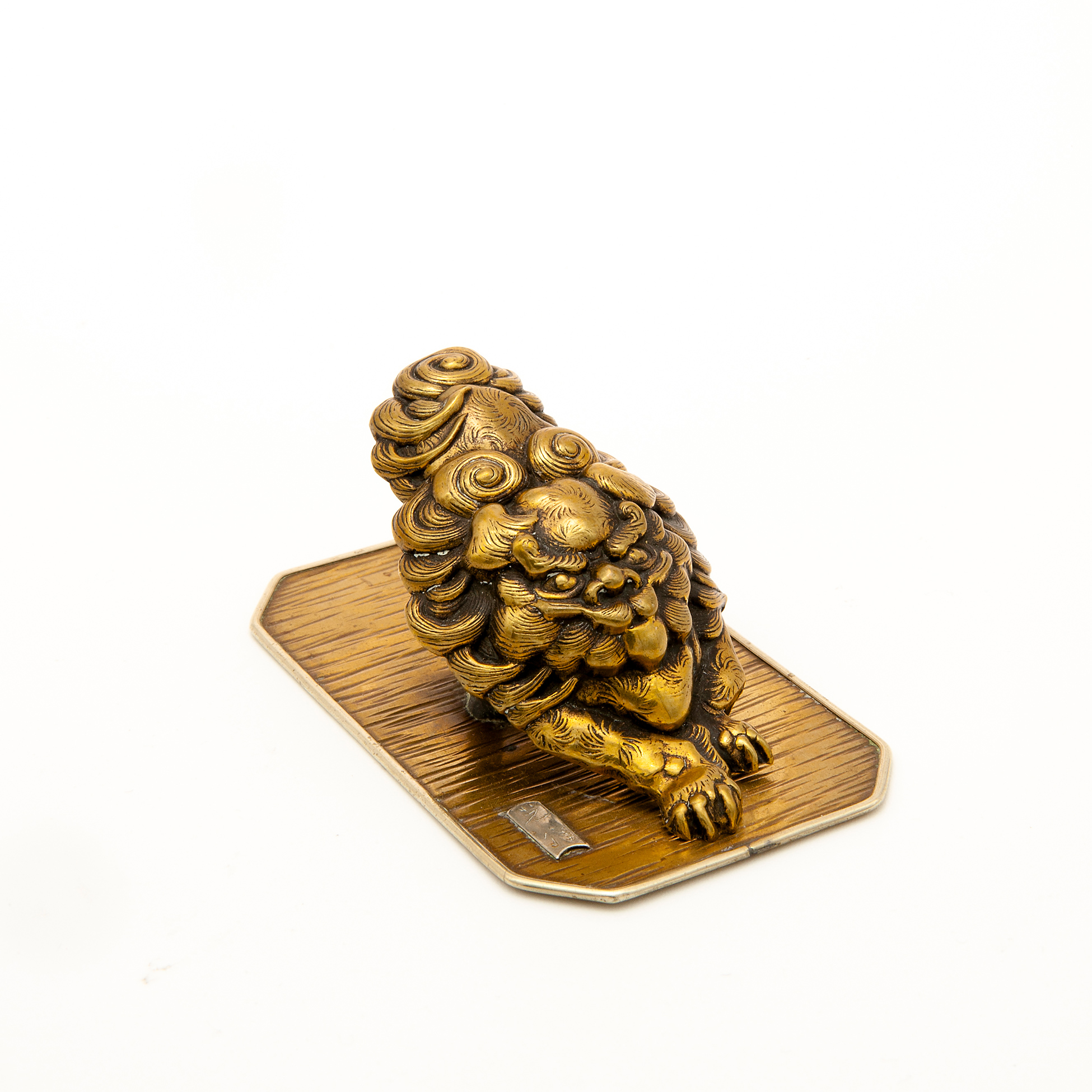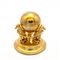 Set da scrivania in metallo dorato Calamaio in forma di sfera con tre levrieri in metallo dorato. Un appendiabiti in forma di mascherone realizzato in metallo dorato e una pinza fermacarte in forma di leone, di probabile manifattura asiatica e realizza