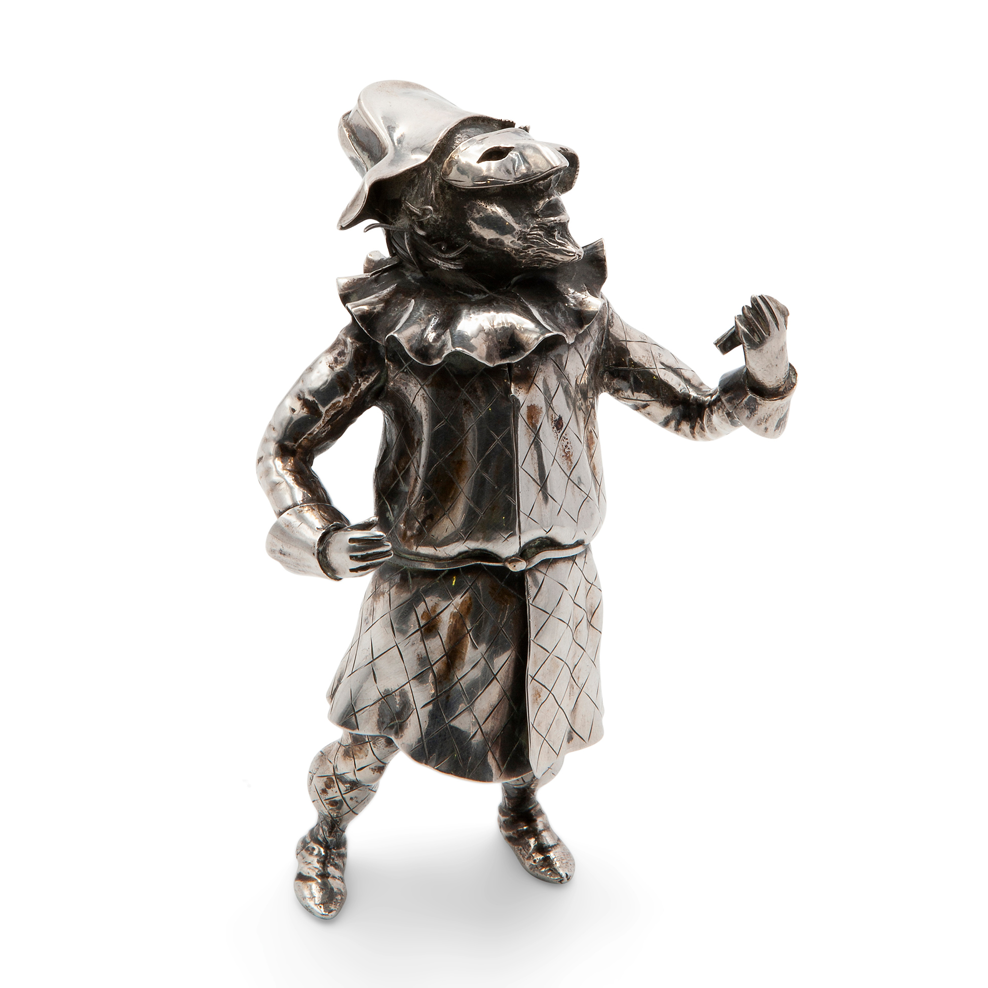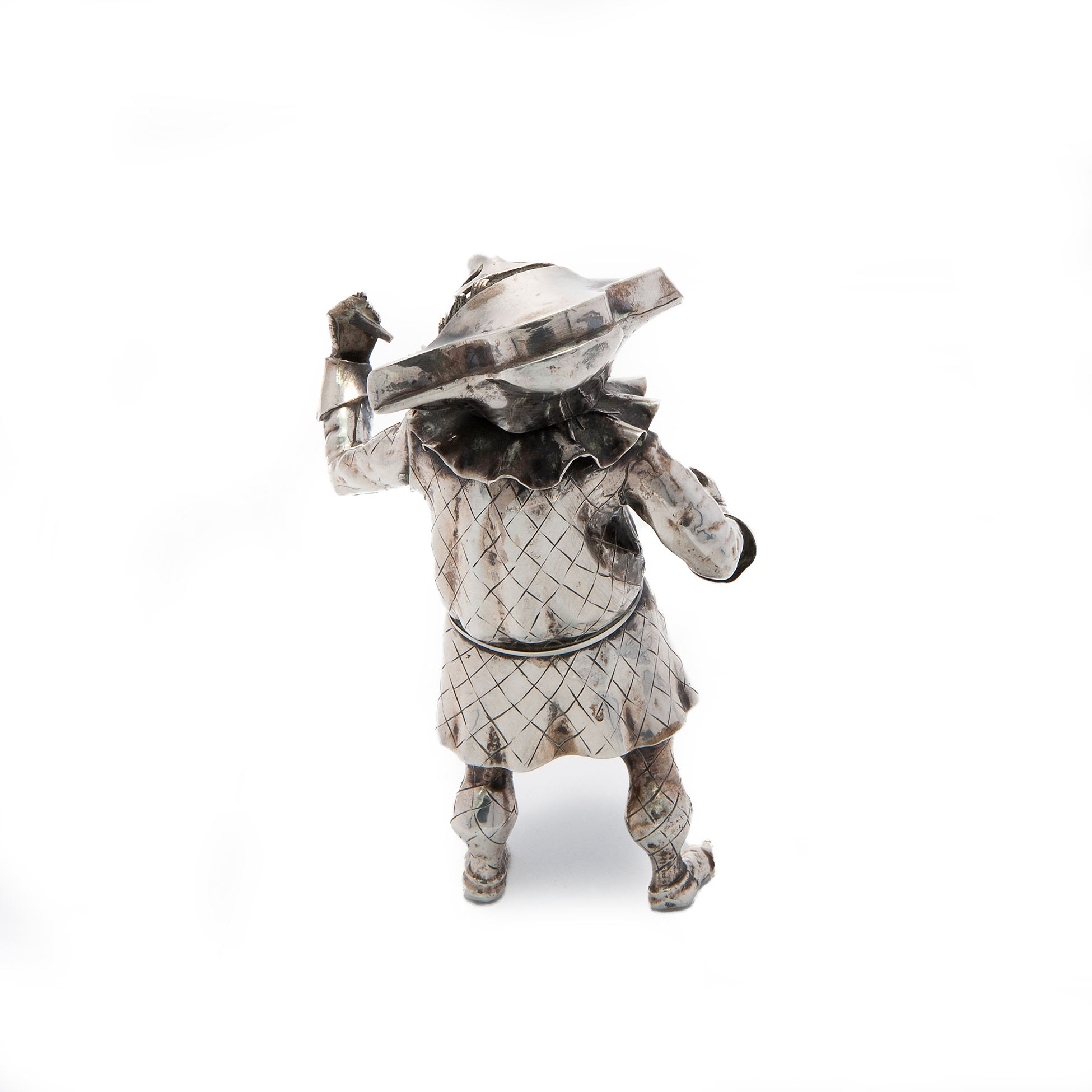 Arlecchino in argento, probabile manifattura Buccellati Scultura tridimensionale interamente in argento, peso complessivo gr. 150 Incisione su rame, Dimensioni 11x6,5x5,5 cm.