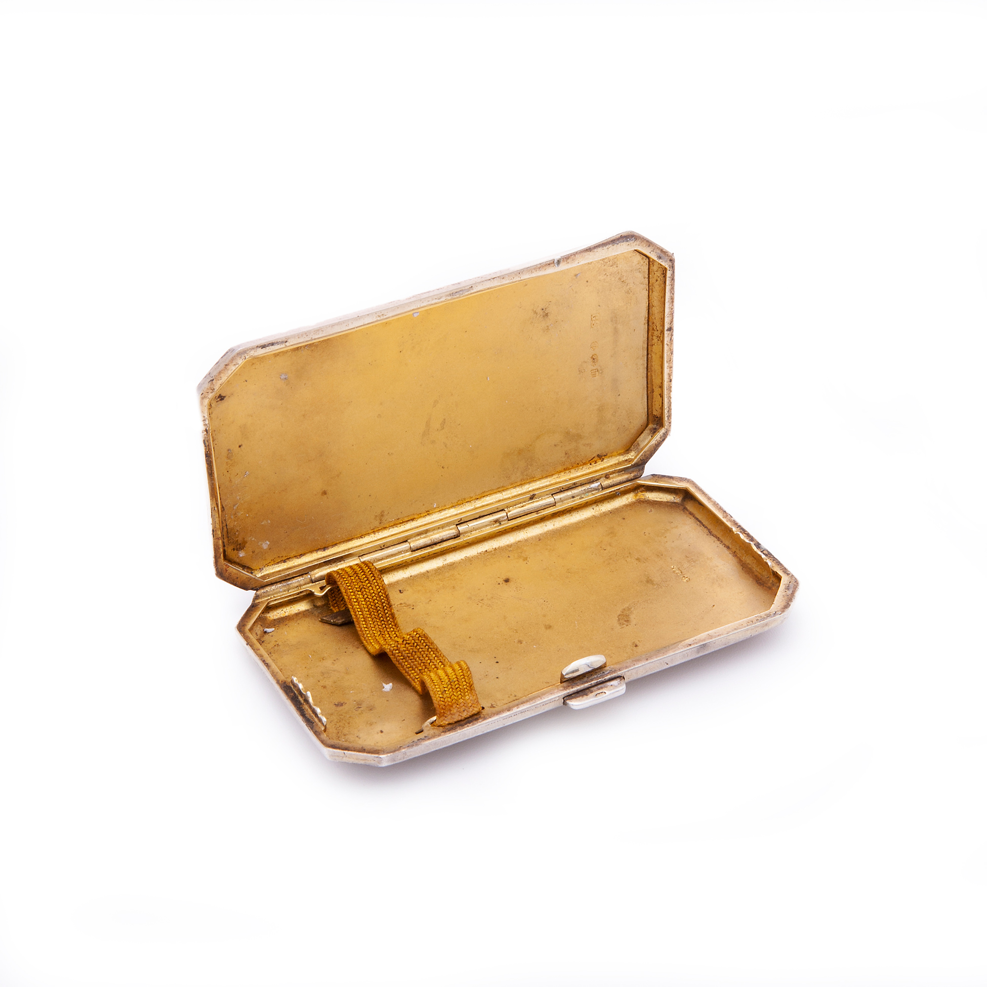Portasigarette con scena popolare in argento e smalti, manifattura europea del XX secolo Presenti timbri argento Sterling e smalti, peso complessivo gr. 57,2 Dimensioni 8x4,5x1 cm.