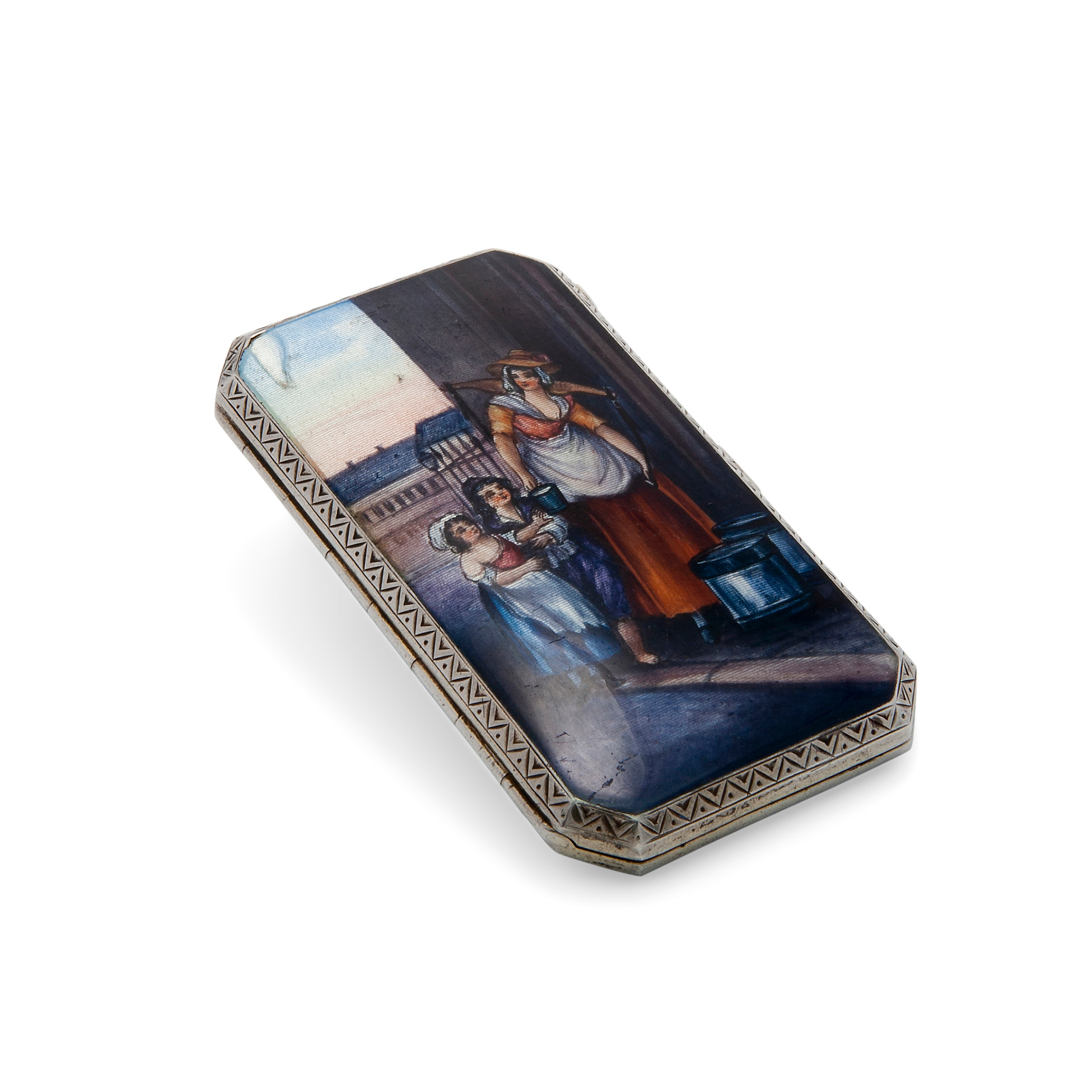 Portasigarette con scena popolare in argento e smalti, manifattura europea del XX secolo