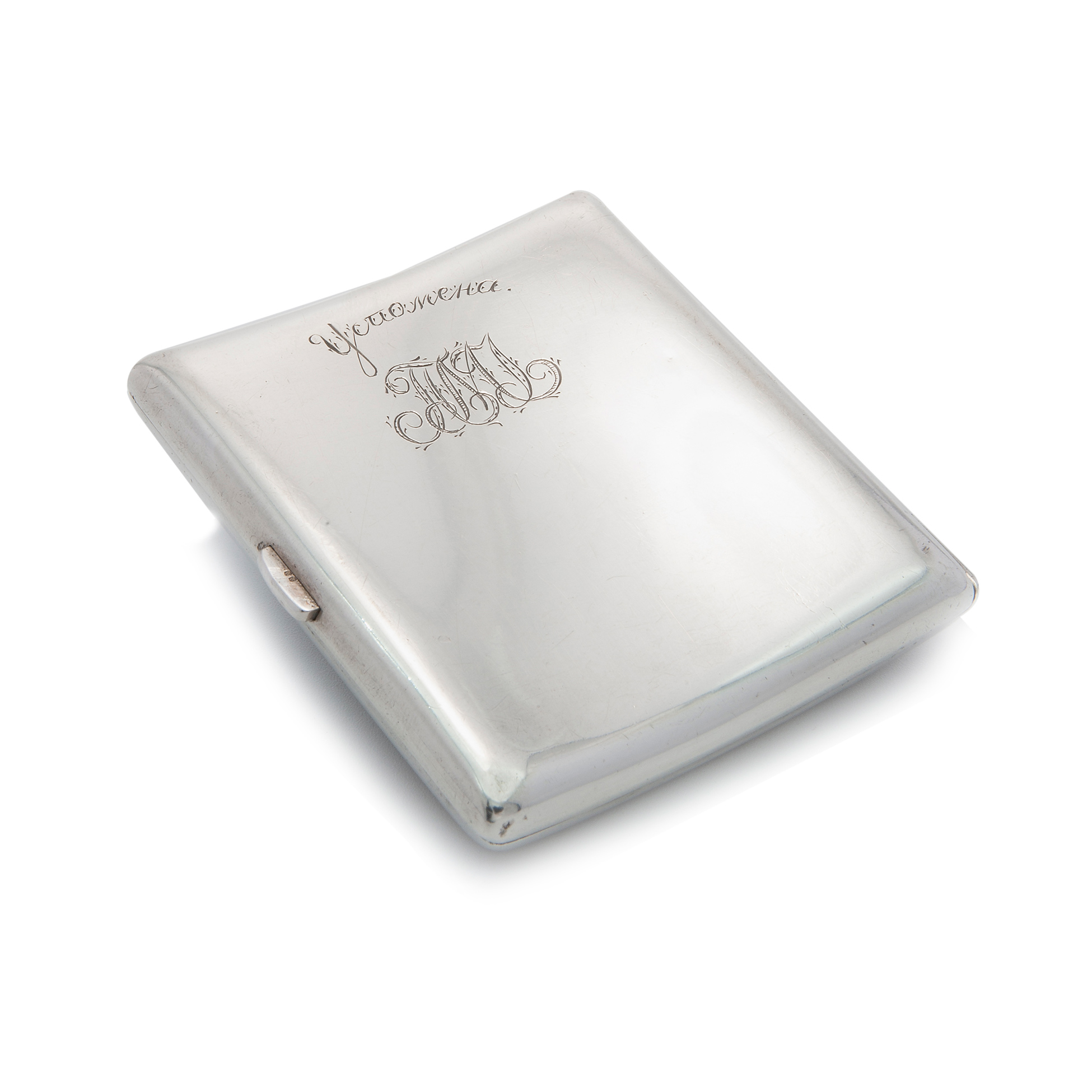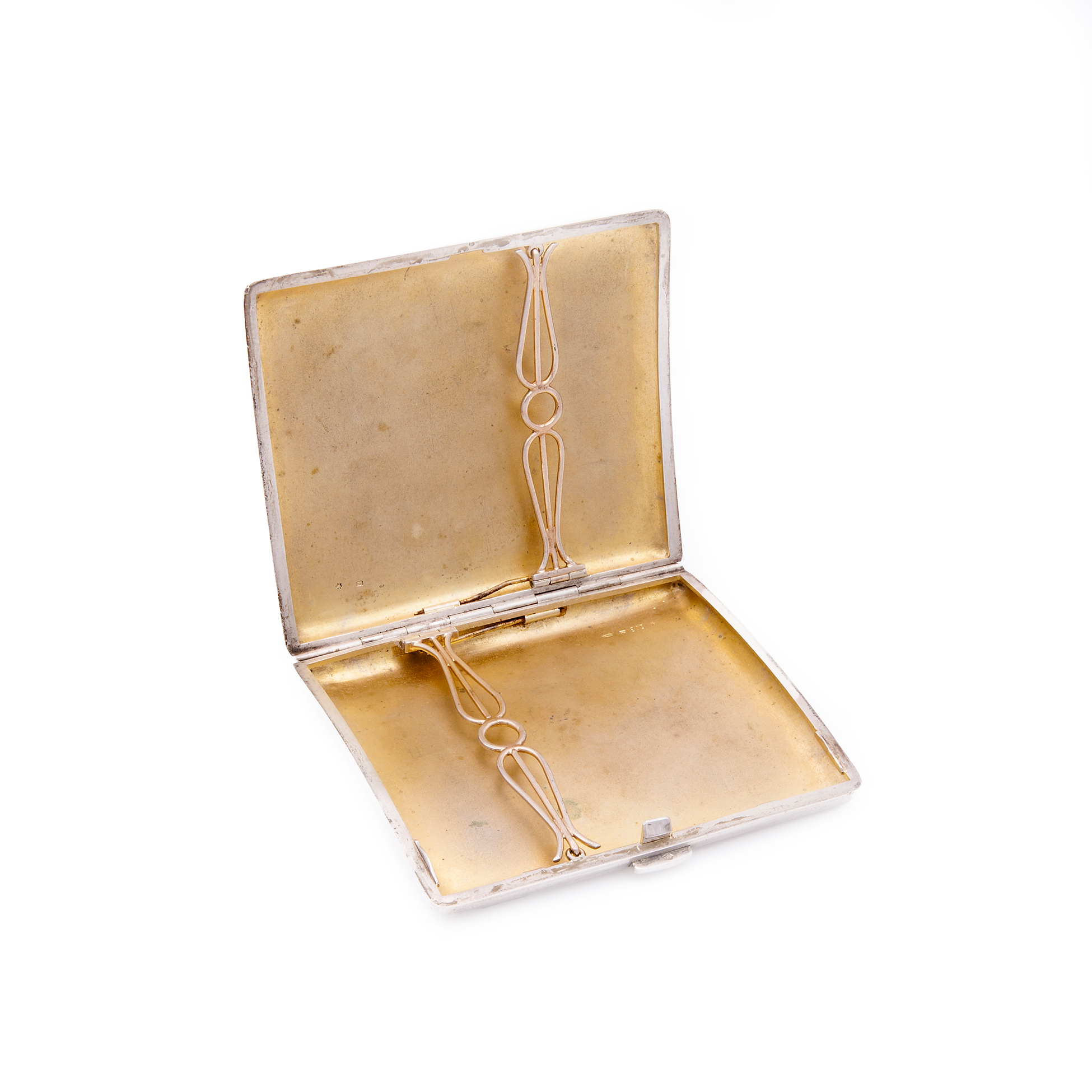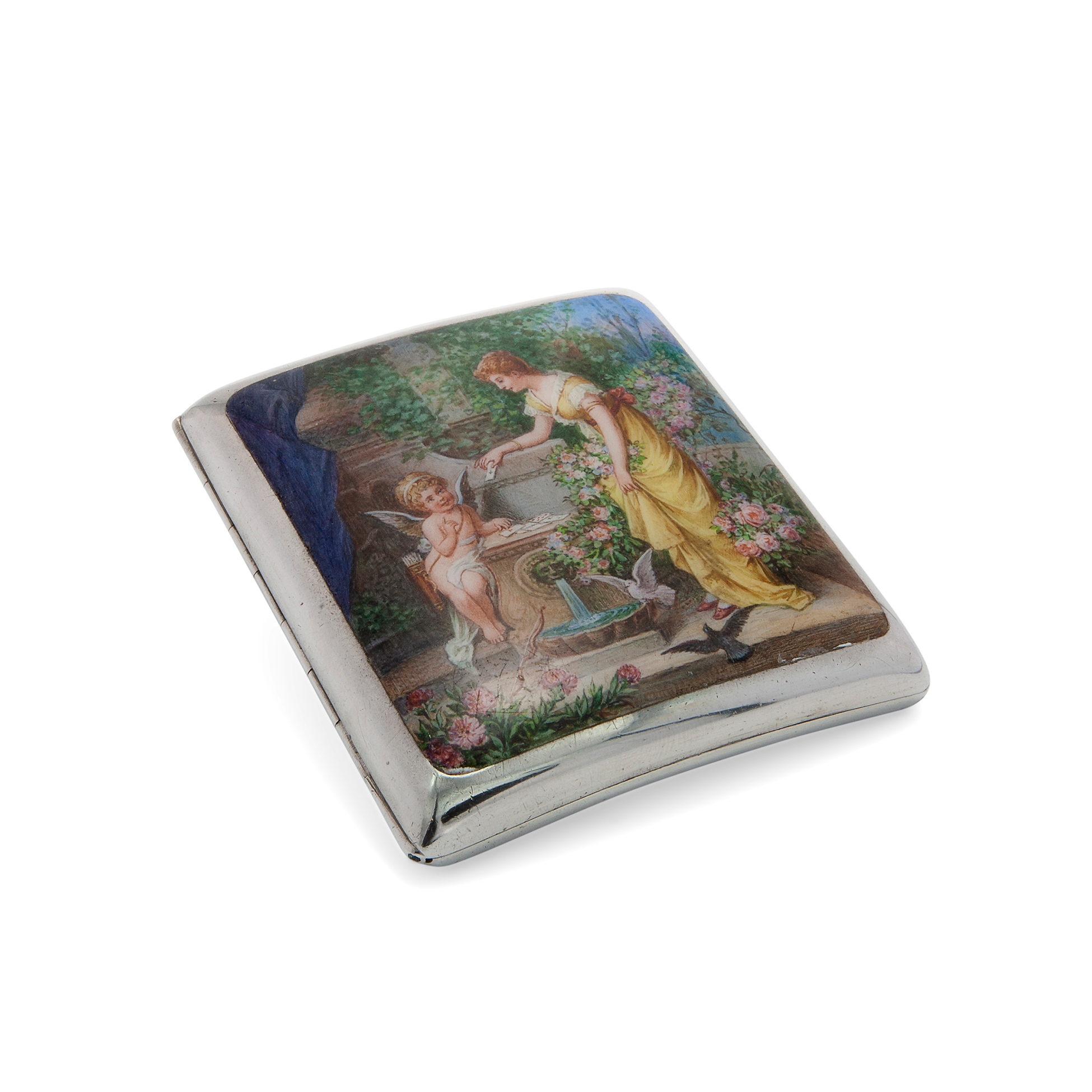 Portasigarette con fanciulla e Cupido in argento e smalti, manifattura europea del XX secolo Presenti marchi argento e smalti, peso complessivo gr. 155,7 Dimensioni 8,5x7,5x1,5 cm.
