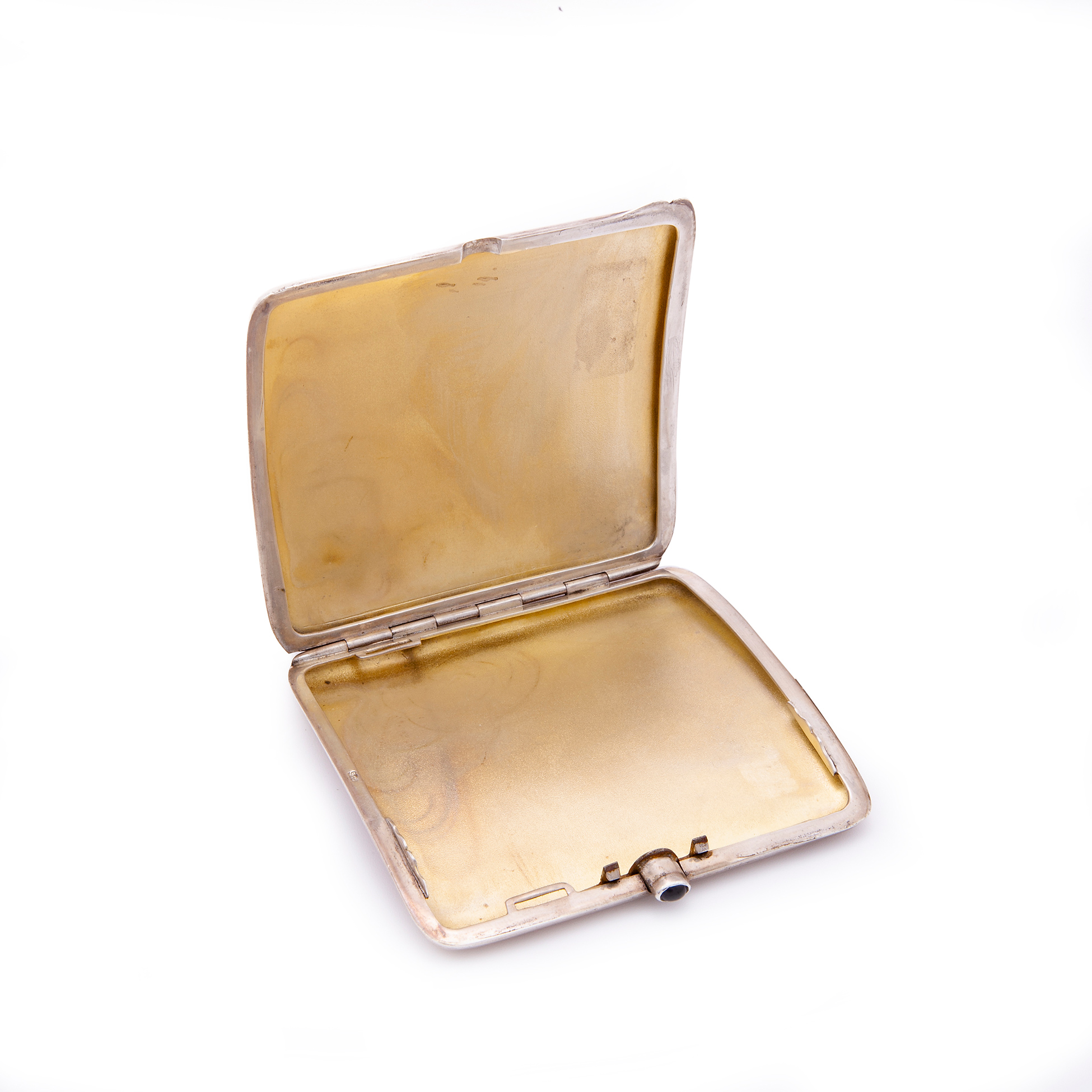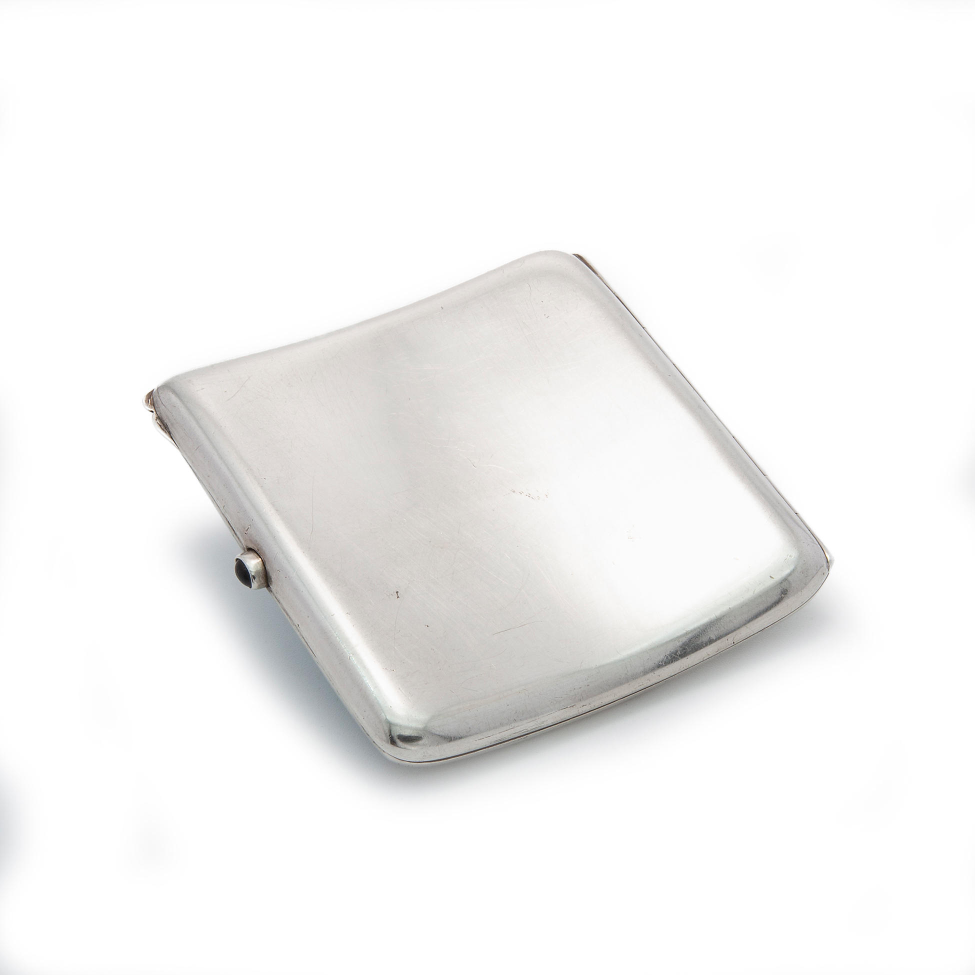 Portasigarette con tennista in argento e smalti, manifattura europea del XX secolo Presente timbro argento Sterling, smalti guillochè e piccolo zaffiro cabochon, peso complessivo gr. 136,5 Dimensioni 8,5x8,5x1,5 cm.