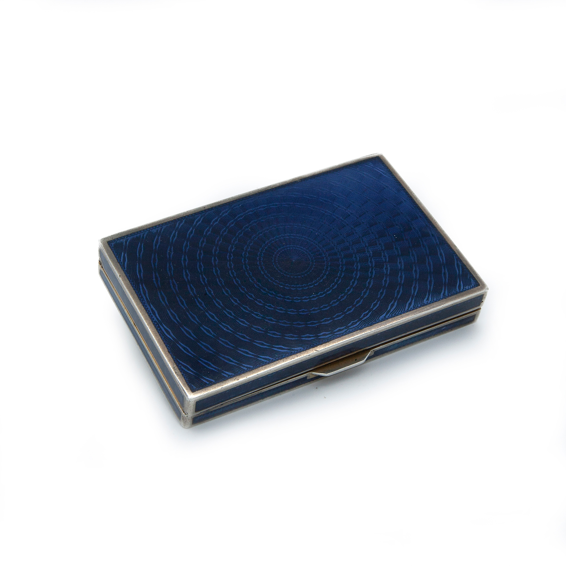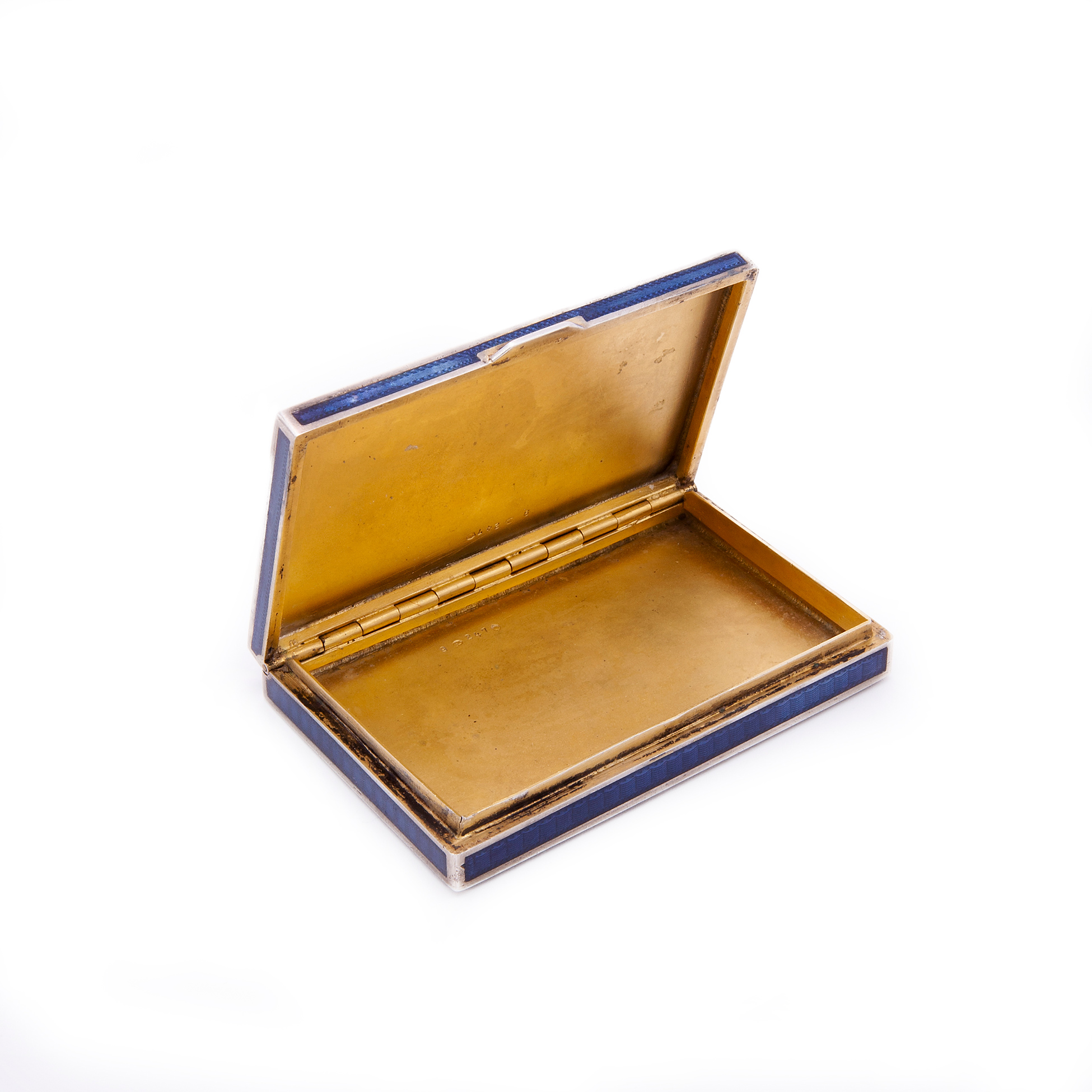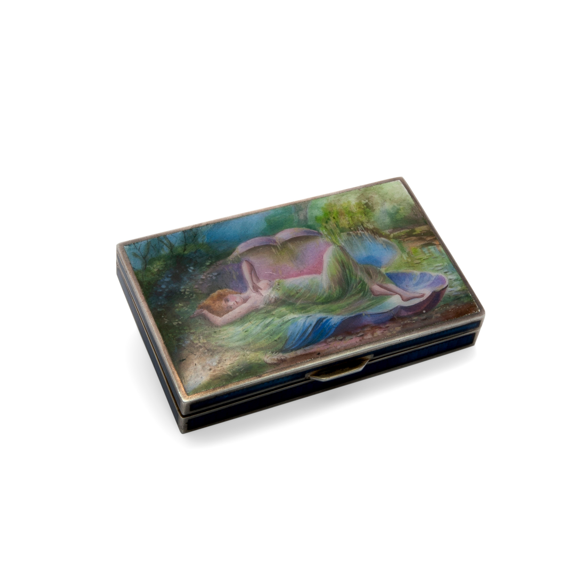Tabacchiera con scena fantastica, manifattura europea del XX secolo Manufatta in argento e smalti guillochè, peso complessivo gr. 153,7; presenti timbri identificanti la manifattura Dimensioni 8x5x1,5 cm.