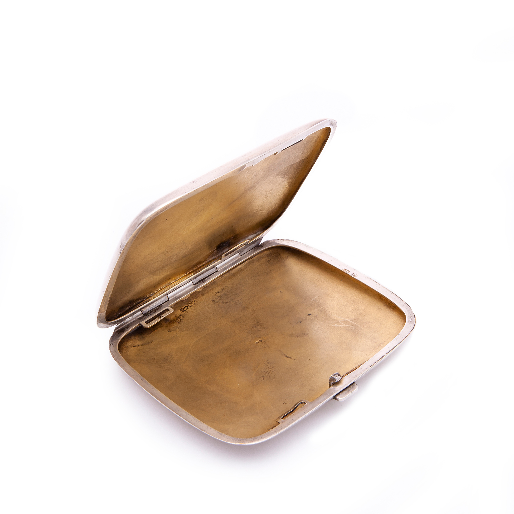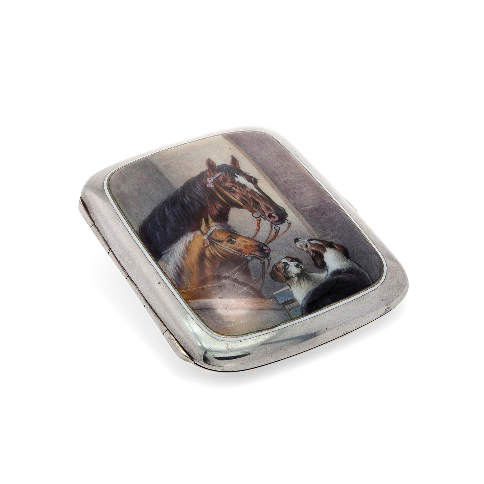 Portasigarette con due cavalli e due cani, manifattura europea del XX secolo Presente timbro argento 935 e decorata a smalto, peso complessivo gr. 131,3 Dimensioni 9x7,5x2 cm.