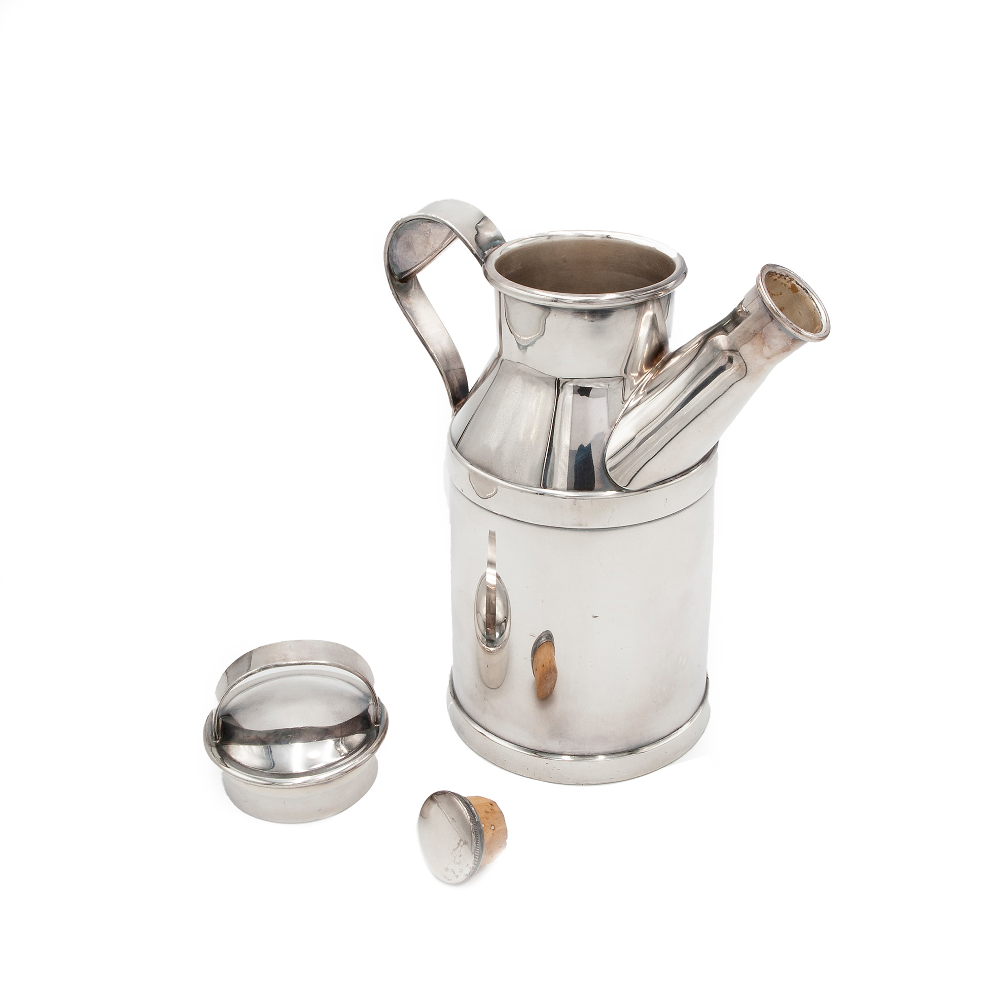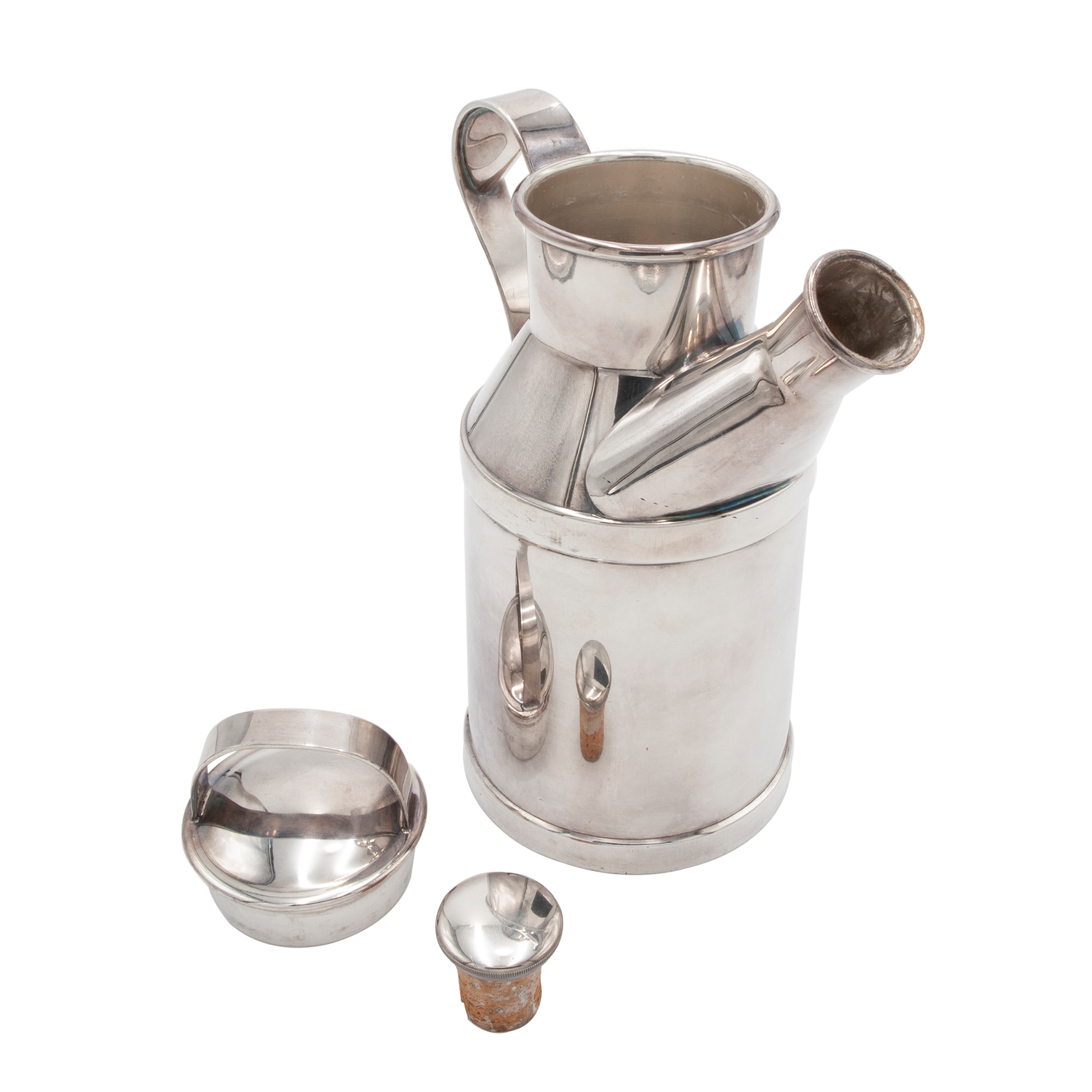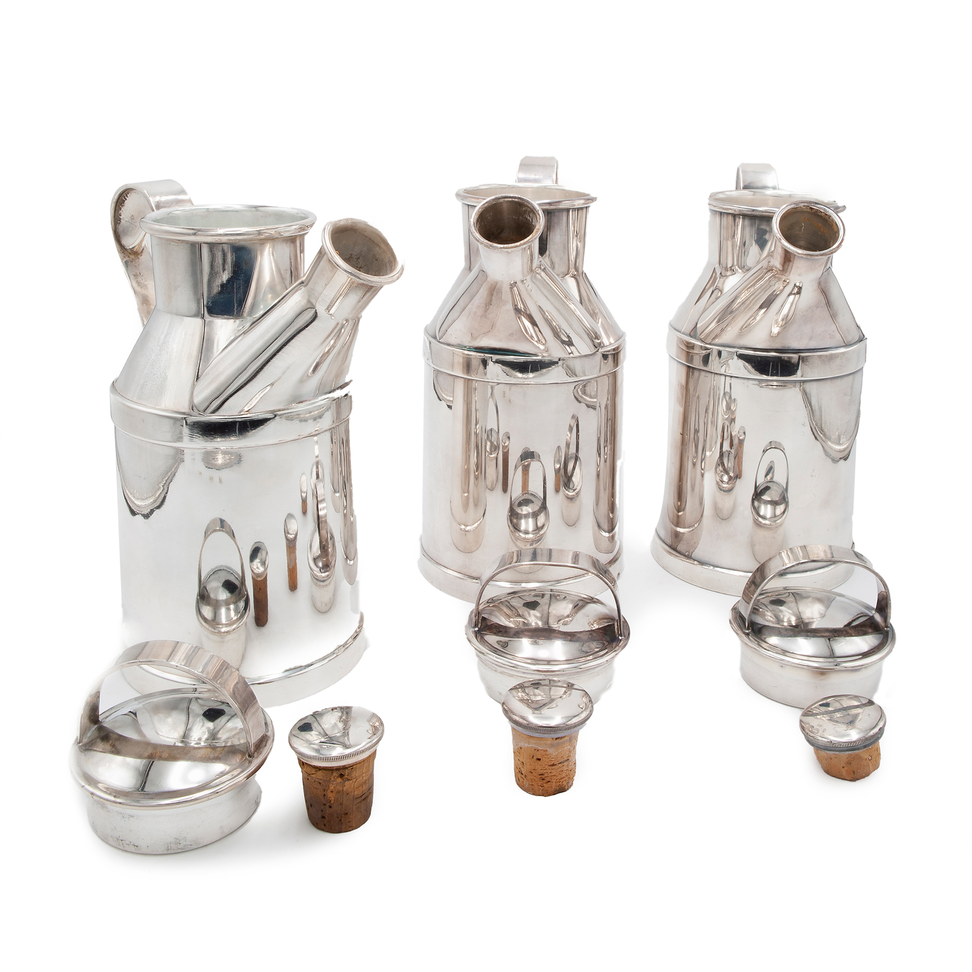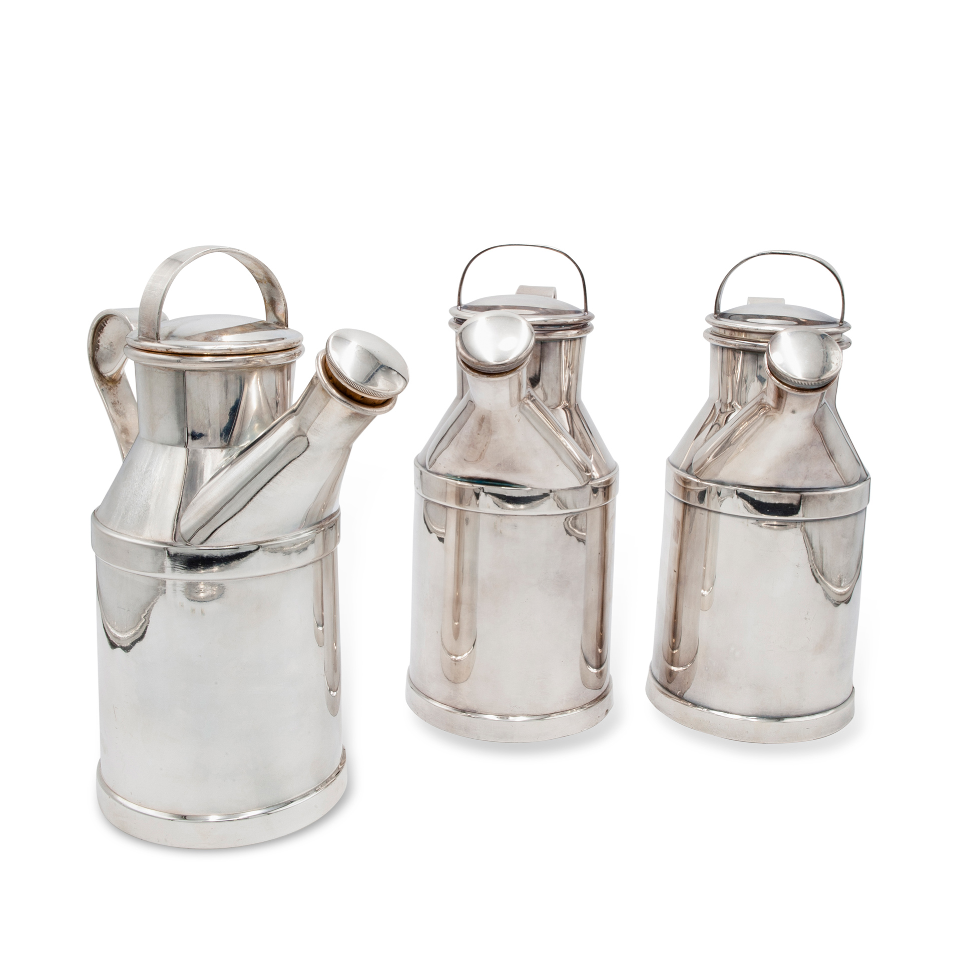 Gruppo di tre shaker in forma di bricco del latte, Reed & Barton 1934 circa Set realizzato interamente in metallo cromato, presente marchio 'Reed & Barton - 25/64 oz.' Dimensioni 28x21x12 cm. ca cad.
