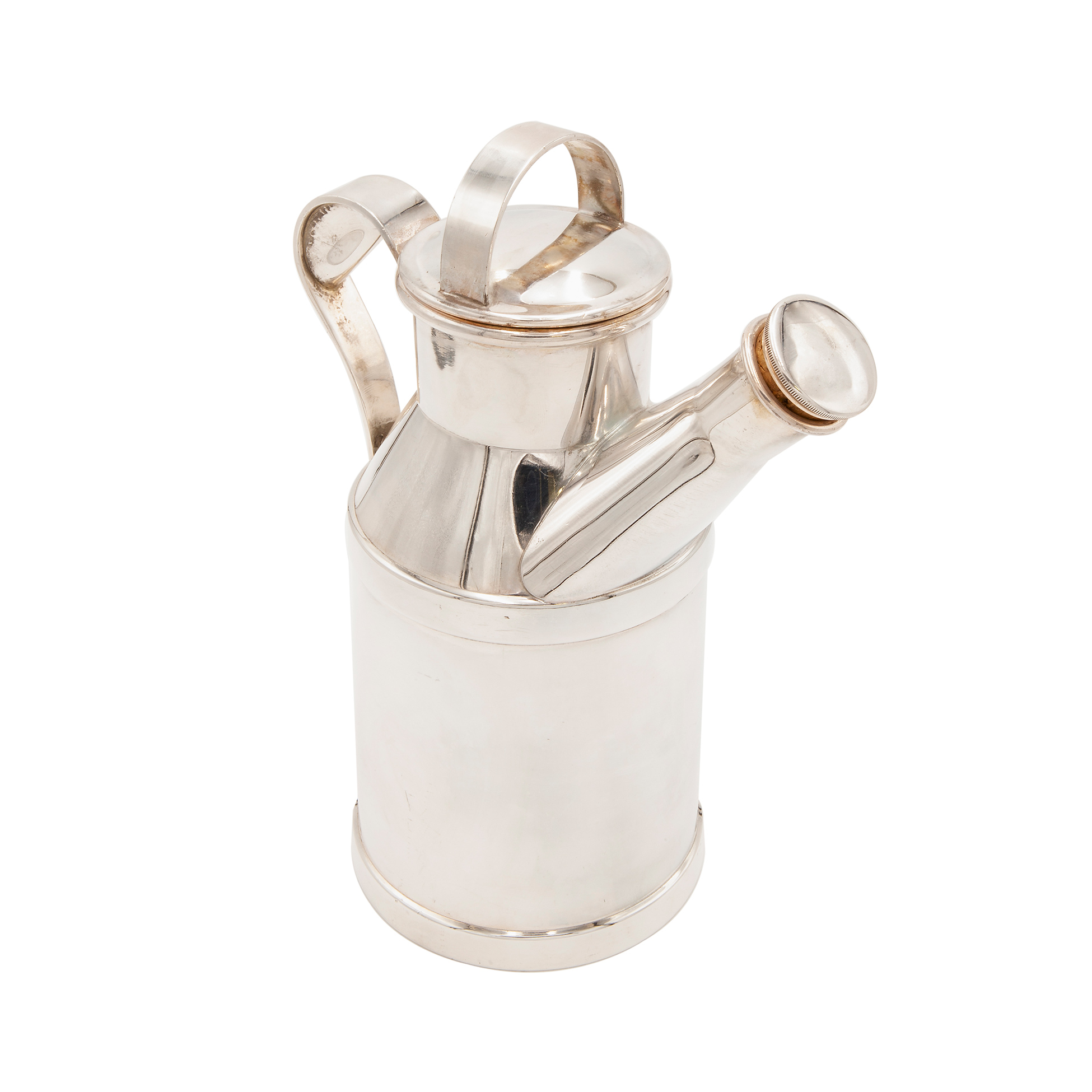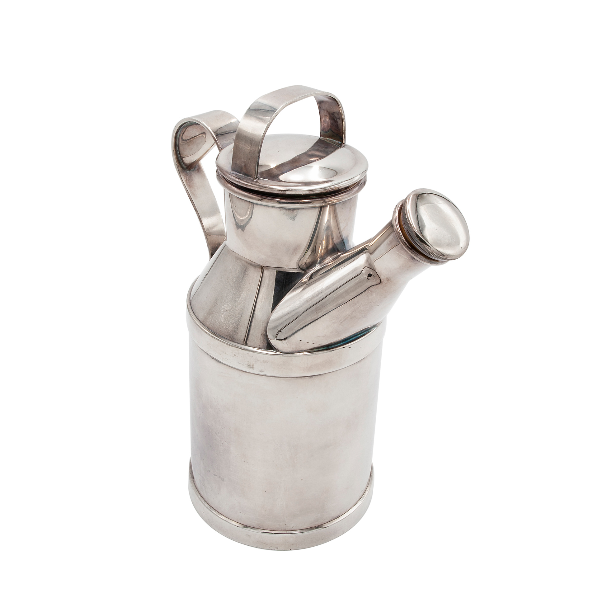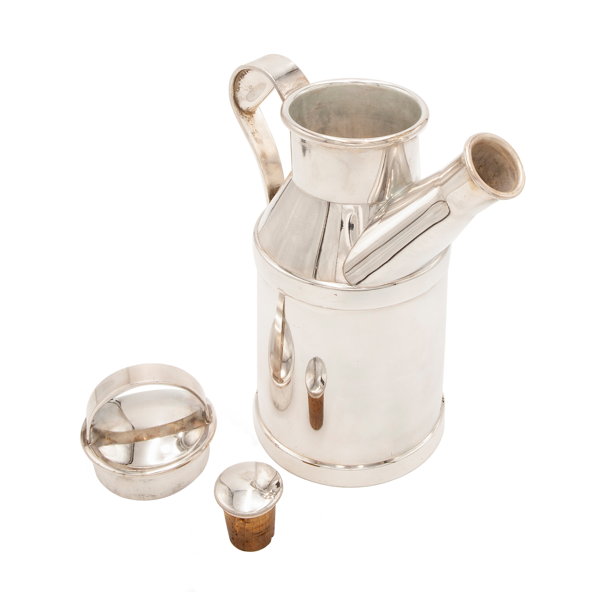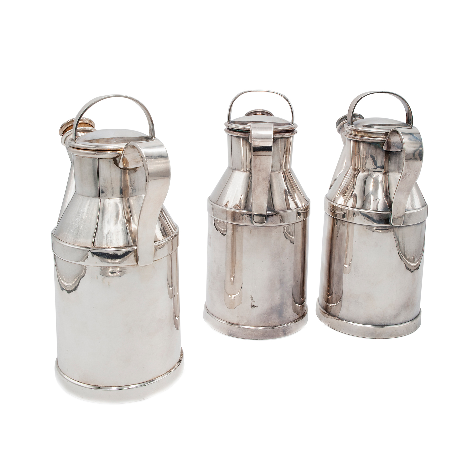 Gruppo di tre shaker in forma di bricco del latte, Reed & Barton 1934 circa Set realizzato interamente in metallo cromato, presente marchio 'Reed & Barton - 25/64 oz.' Dimensioni 28x21x12 cm. ca cad.