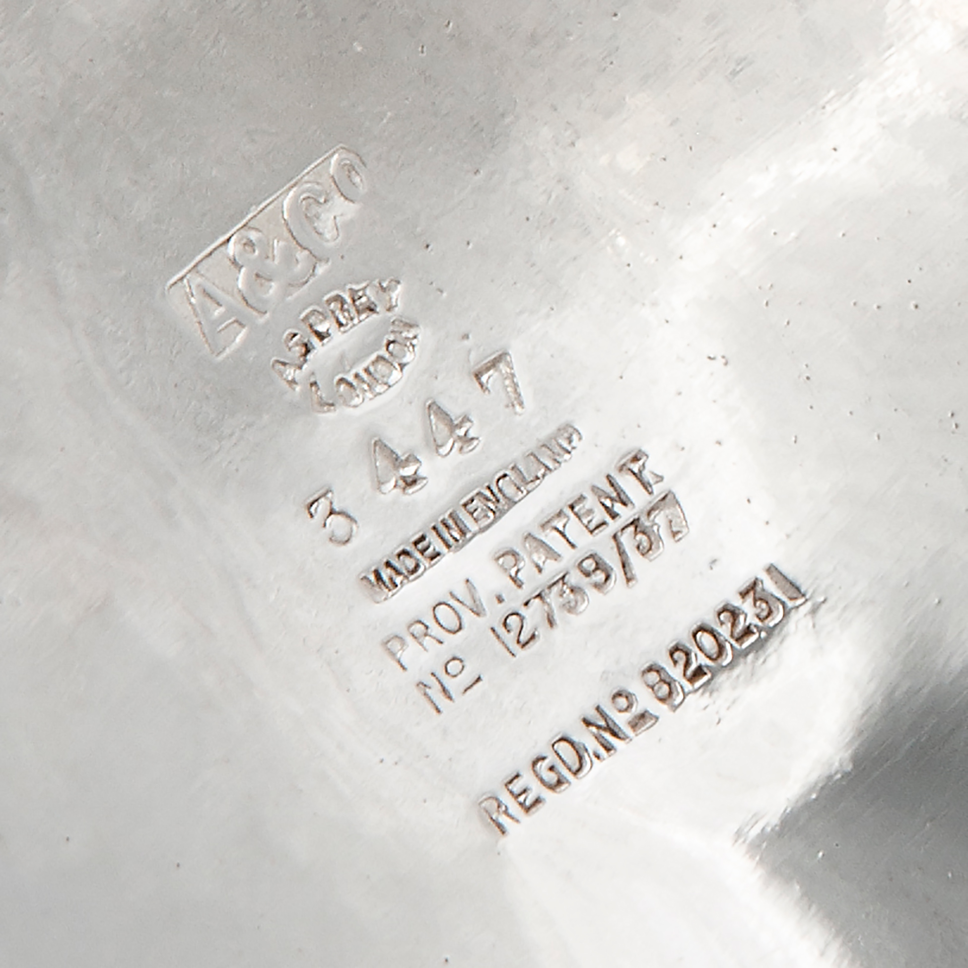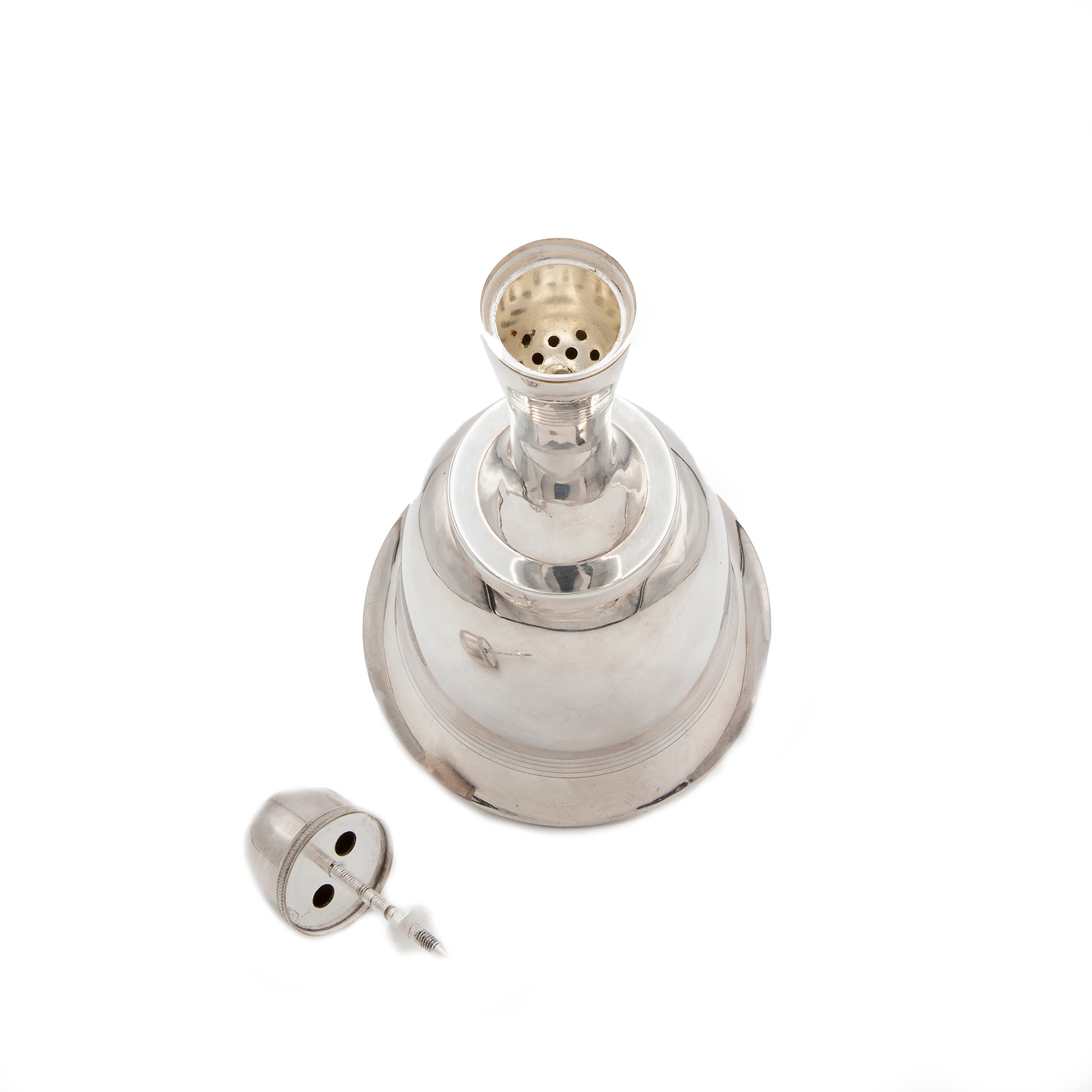 Shaker in forma di campana, Asprey & Co., 1935 circa In metallo argentato, presenta il marchio 'A& Co - Asprey London - 3447 - made in England - Prov. Patent - n. 12739/37 - Regd.n.820231' Dimensioni 28x15 cm.