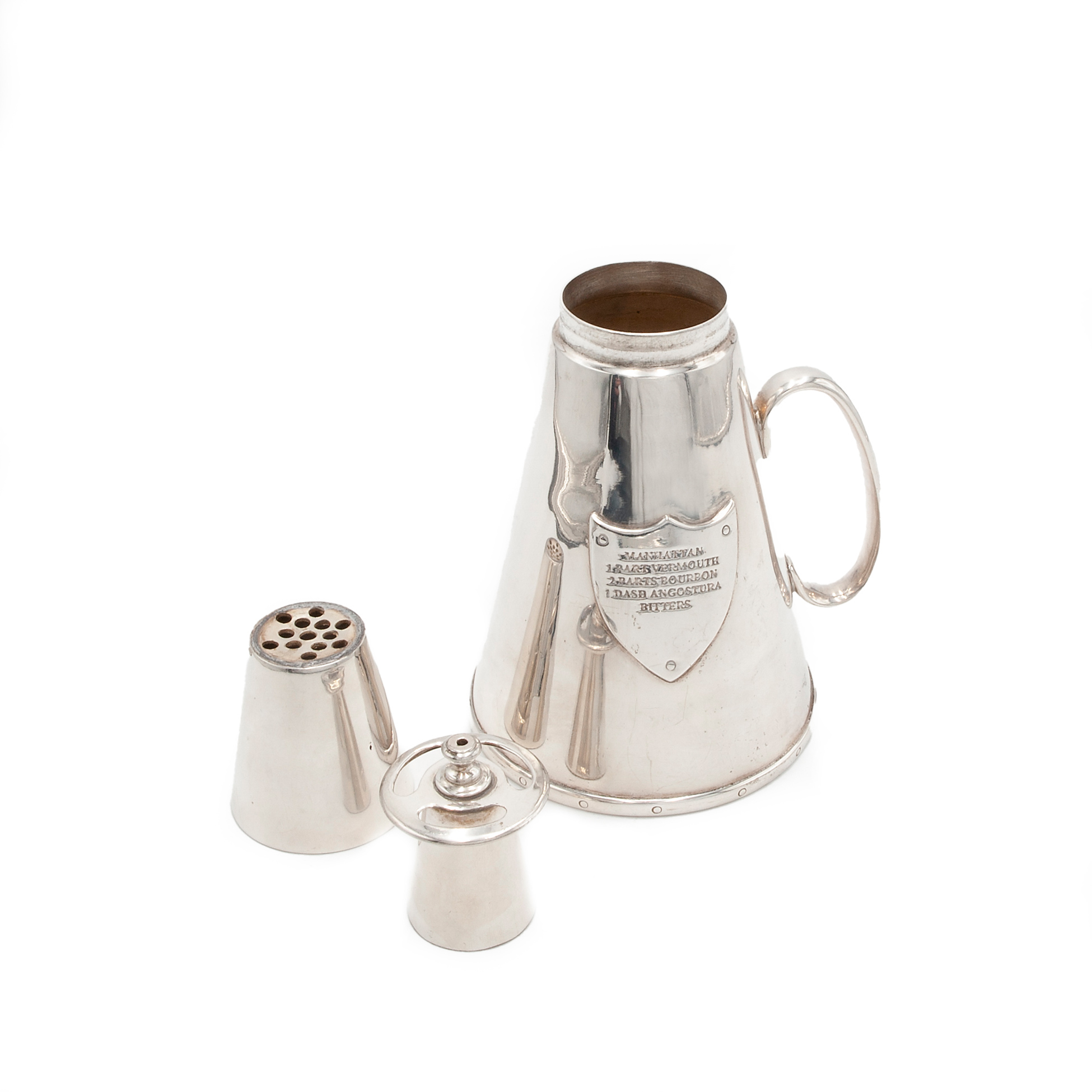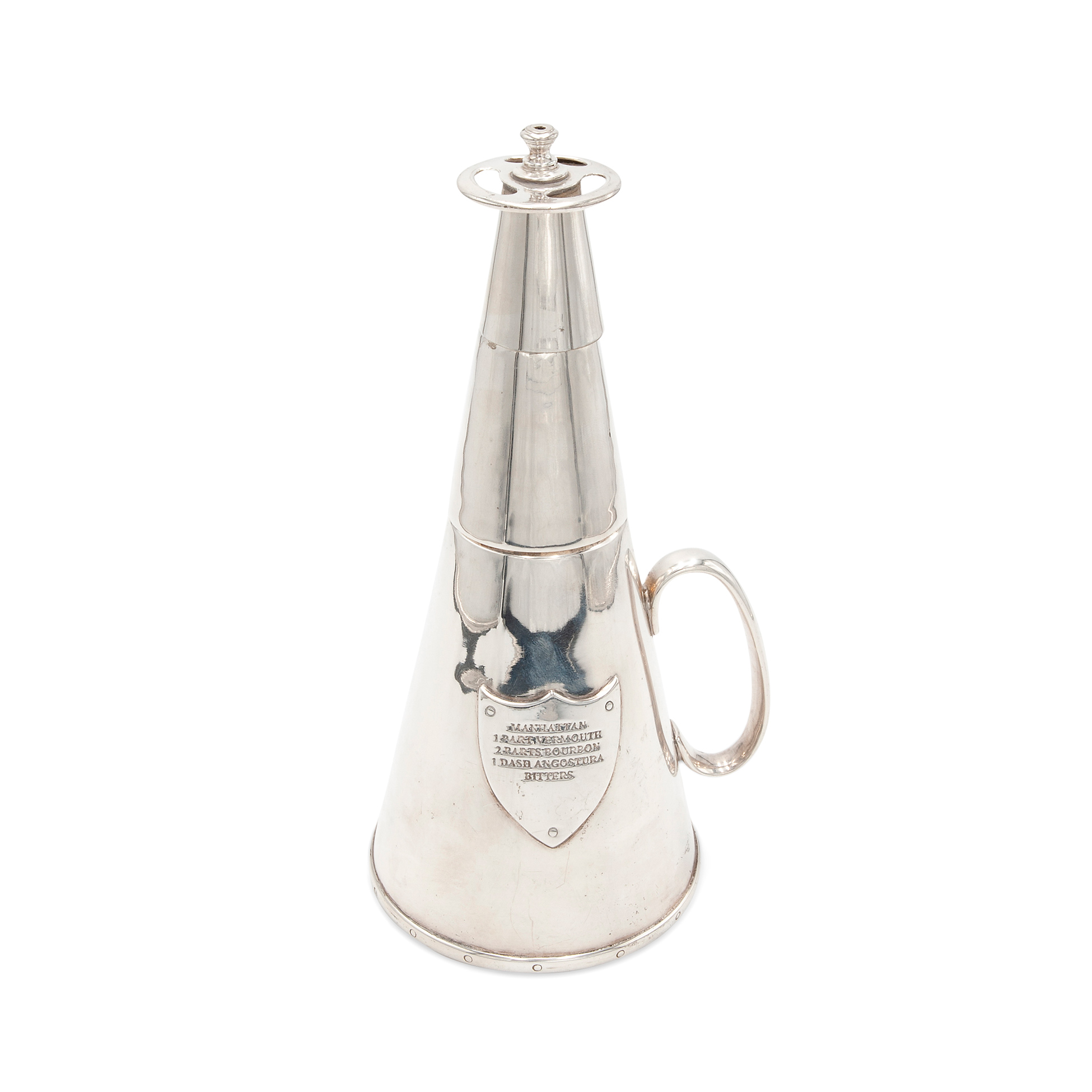Shaker in forma di estintore, 1930 circa In metallo cromato, il tappo è difettoso. Inciso sul fronte uno scudo con inciso 'Manhattan: 1 part vermouth, 2 parts bourbon, 1 dase angostura, bitters'. Dimensioni 27x13,5x11,5 cm.