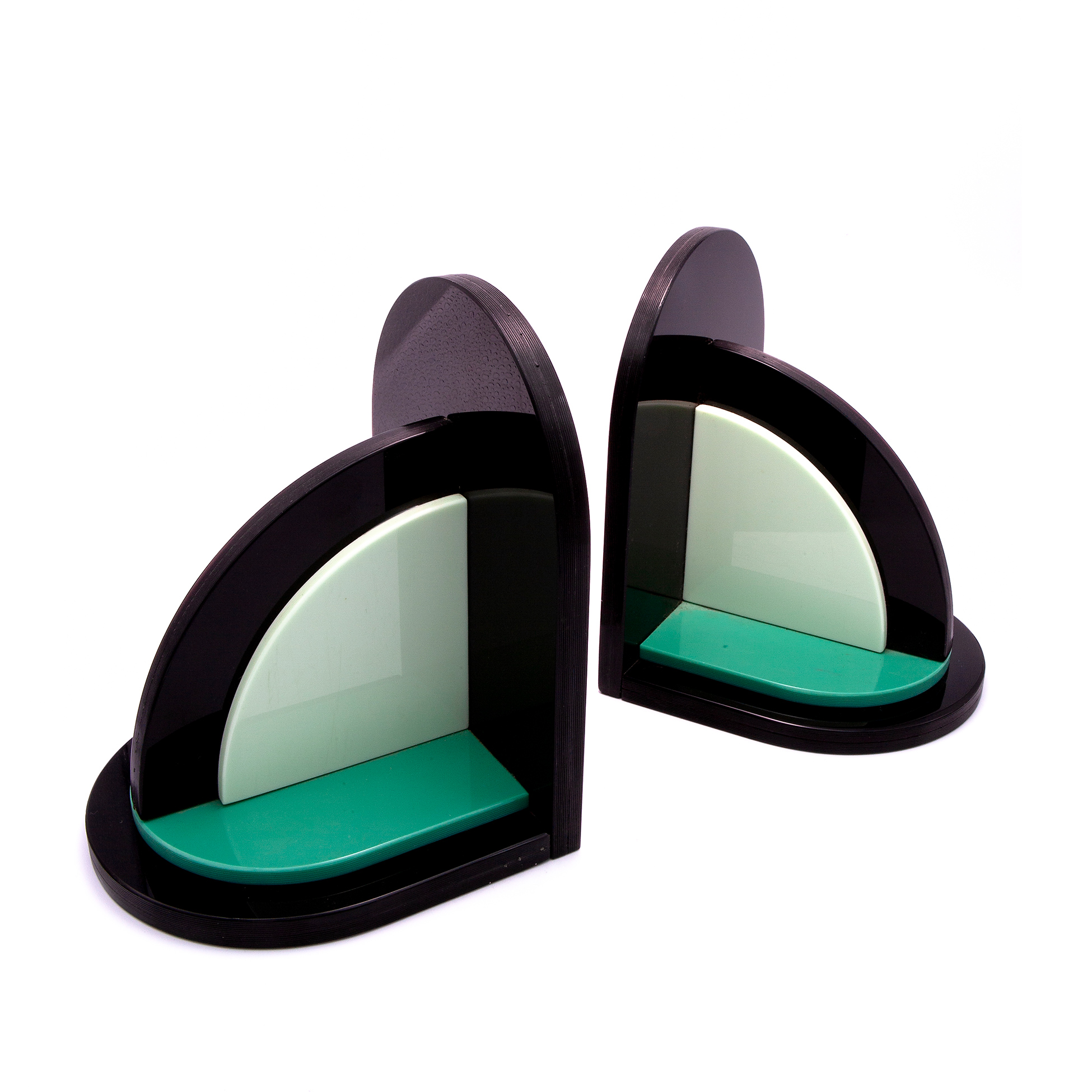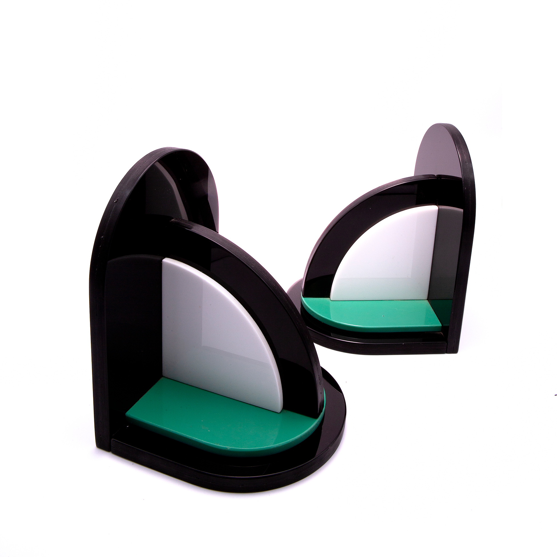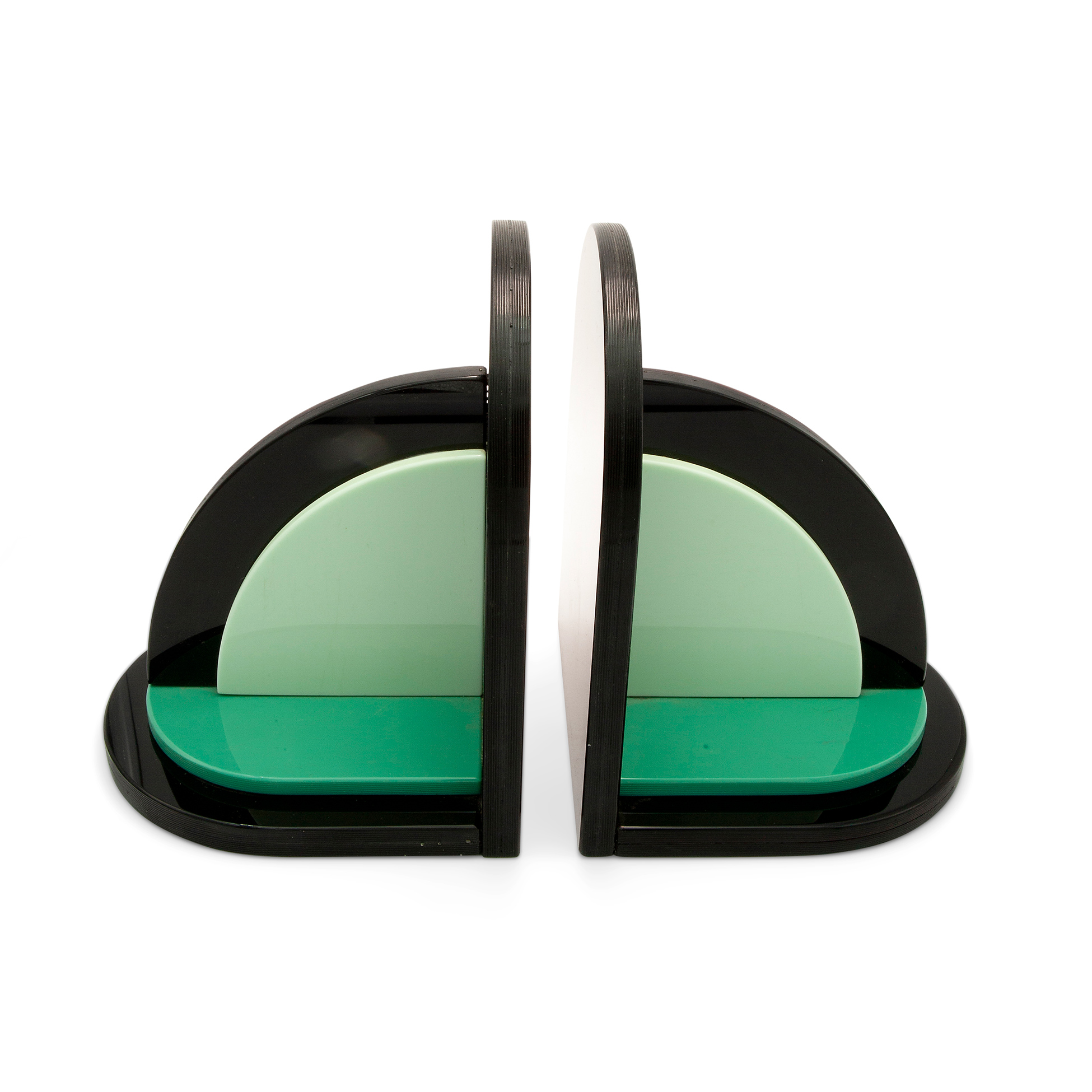 Coppia di fermalibri anni '70 Composti da tre elementi geometrici decorativi in vetro verdi e neri Dimensioni 18x14x14 cm. cad.