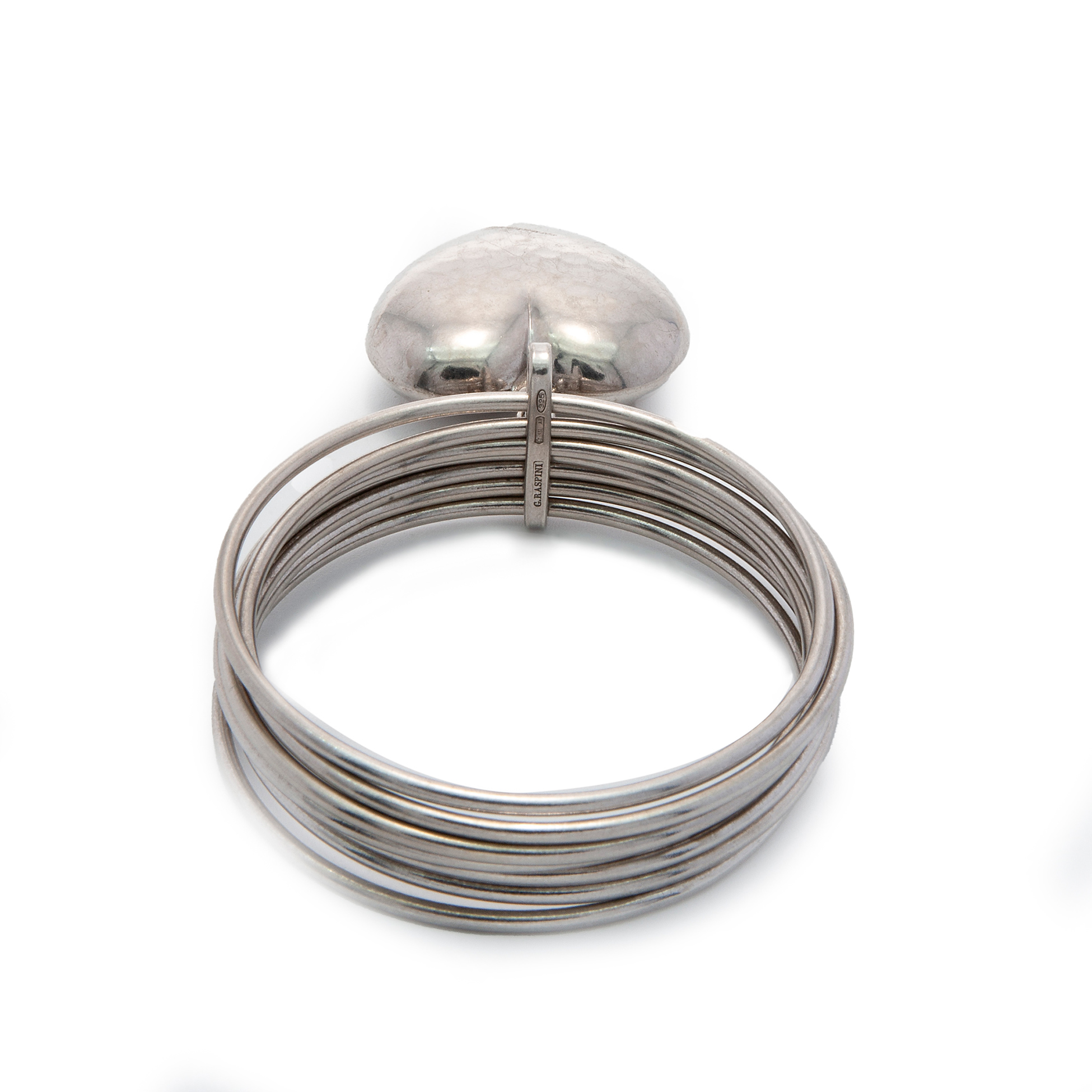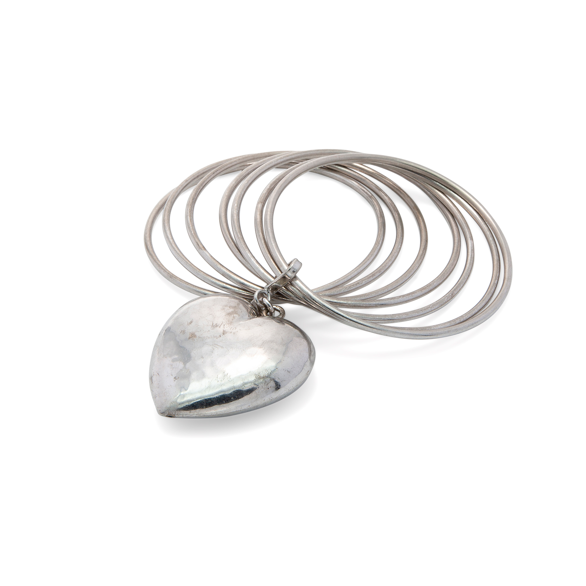 Giovanni Raspini, Bracciale con cerchi in argento e pendente a cuore Presente punzone dell'argento Sterling e quello identificante la produzione, peso complessivo gr. 90 Diametro 7 cm., lunghezza con pendente 12 cm